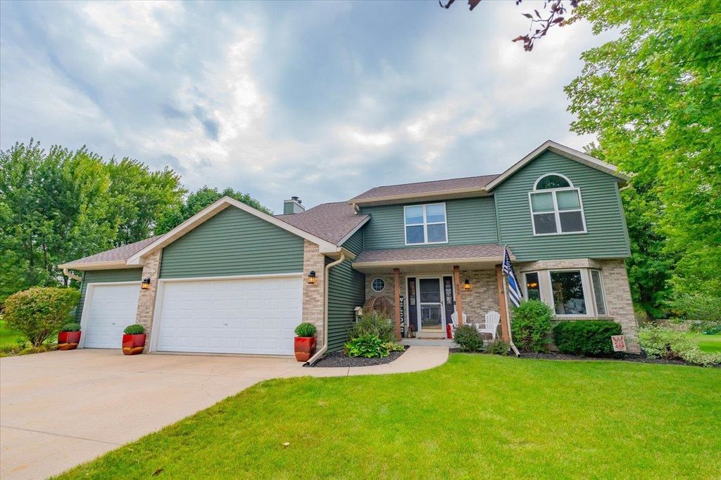 This home was made for gathering & creating memories! With all 4 Bdrms & 2 full Baths upstairs, + 2 addtl ½ baths on the main and LL, there's plenty of room for everyone! On the main level, you'll find a living & Hearth Room + a dining room. Rec room & addtl hobby room in LL. 3 car attached garage w/ 24' 3rd bay. Brand new backyard entertainment suite didn't spare any expense. Enjoy the extra space and sit on the patio & listen to music from the built-in speakers! Addtl 4th garage bay & attic space expand your storage capabilities! Oversized lot on a quiet cul-de-sac. Walking distance to Fox Prairie Elementary. UPDATES: Siding, gutters, laundry + W/D (2024), Deck stained & sealed (2024), Roof (2023), A/C (2017), Water heater (2010)