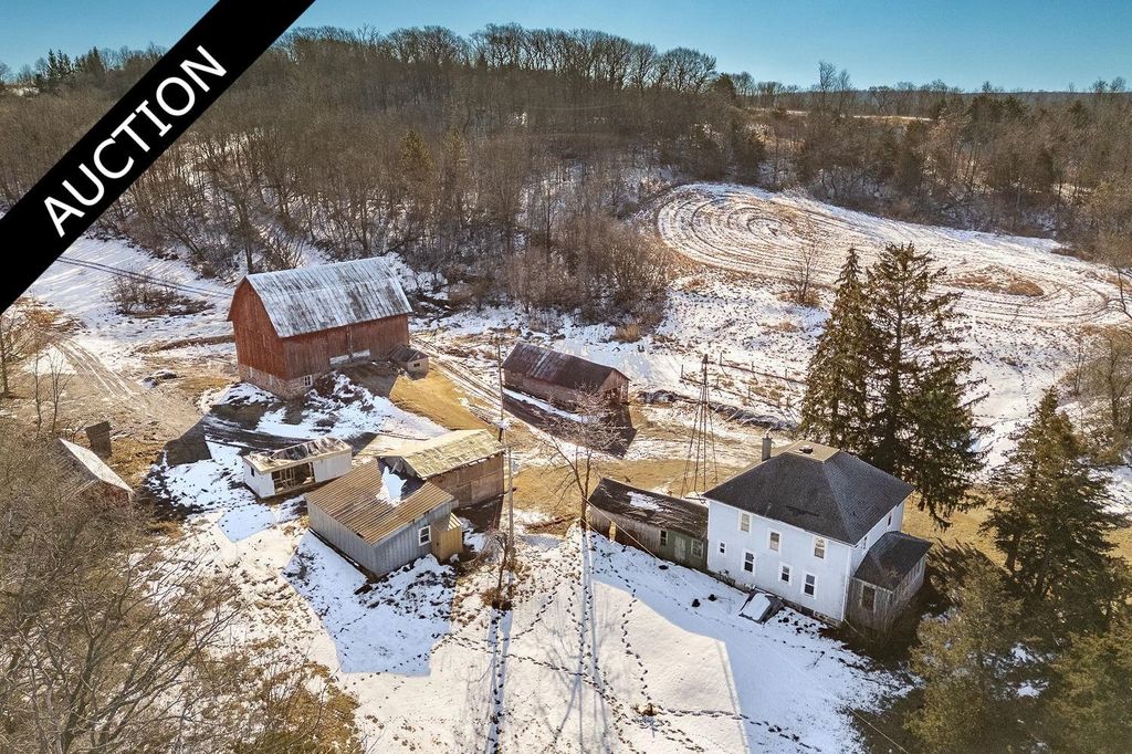 Offered at live/online auction Wednesday, April 16th. List price reflects assessed value and suggested starting bid price. $20,000 down per parcel and sign a non-contingent offer to purchase. A rare opportunity awaits you with 100 acres high atop the Baraboo Bluffs, Sauk County, WI. Survey to determine new property lines. Parcel 1 offers 95.35 acres, a 1,800 sq ft farmhouse, 24x13 attached garage, 45x18 Shed, 13x30 chicken coop, and 48x30 barn. The land is approx 60% woods with mature oak, maple, and hickory trees and has 30.39 acres of tillable land. A great place to hike, watch wildlife, raise horses, and hunt. There is also a natural artesian spring on the south side of the property. Parcel 2 is 4.65 acres to build your dream home on and is just 3 miles to Baraboo and 25 to Madison.