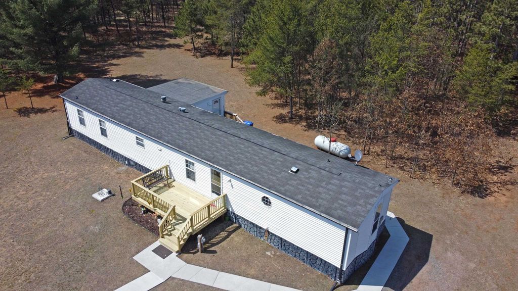 Located in the prime Castle Rock Lake area, this 3 bedroom 2 bathroom single wide manufactured home sits on 1.99 wooded acres. Ride your UTV on the property groomed trail or on the local country roads. There is a 30 amp RV hookup in the backyard. Recent updates include concrete sidewalk, blacktop driveway, refurbished decks, furnace and central a/c, faucets throughout, flooring in most of the home, refrigerator, dishwasher and garbage disposal. The 2 car garage is insulated with a heater, 2 50 amp plugins and an enclosed lean-to for the lawnmower or recreational toys. There is also a garden shed for your landscape storage needs. NO HOA or subdivision rules. All measurements are estimates.
