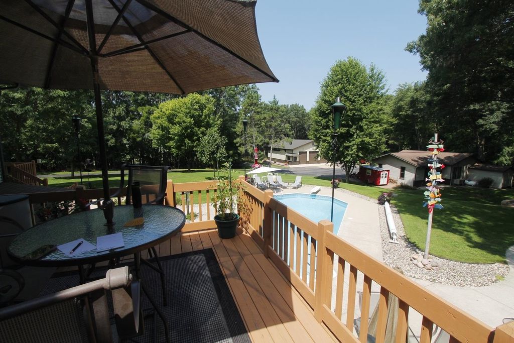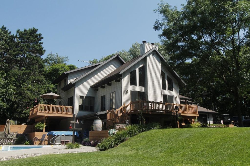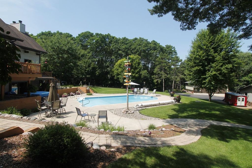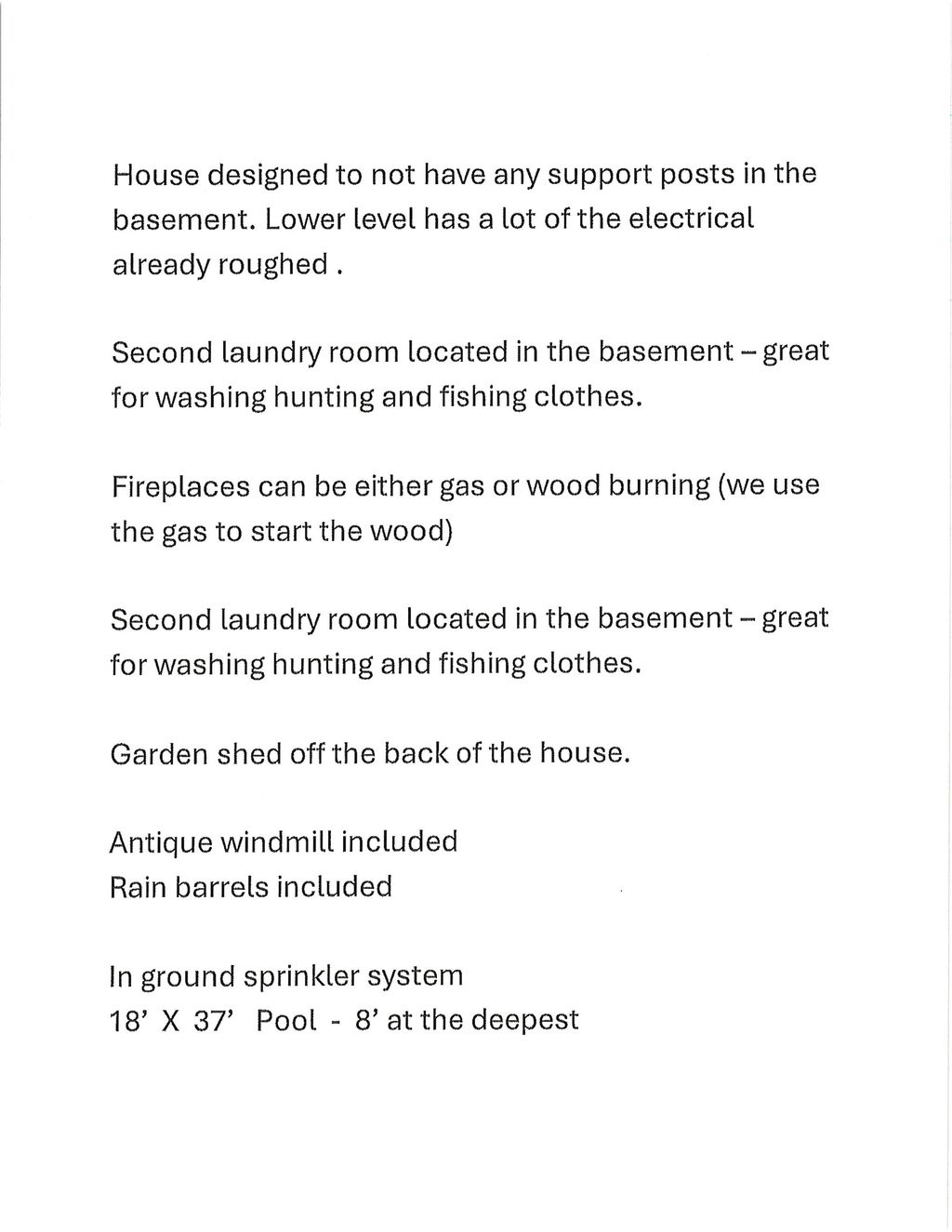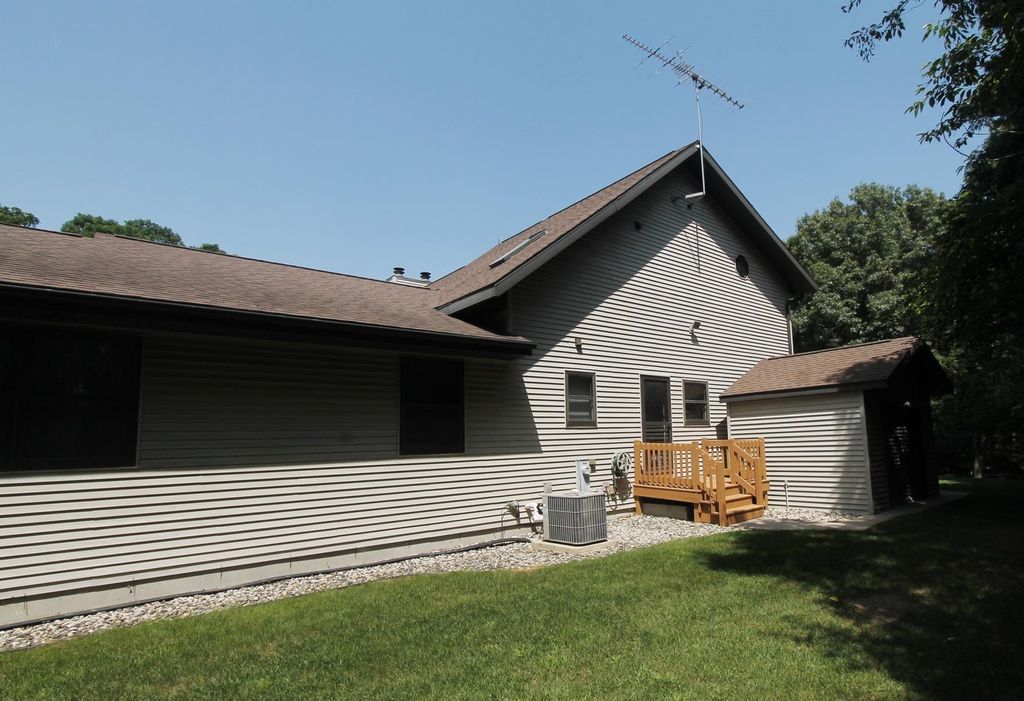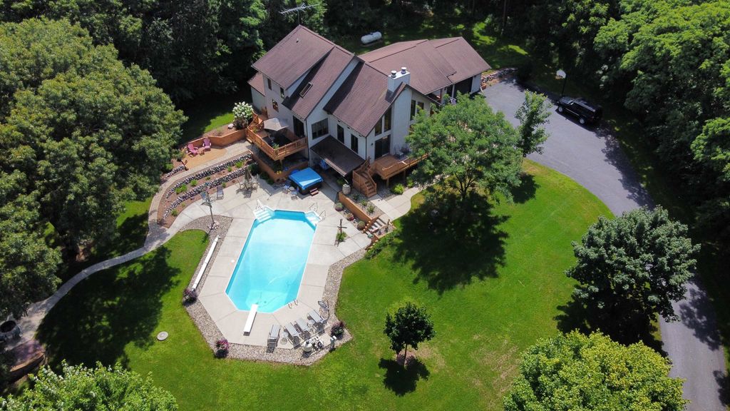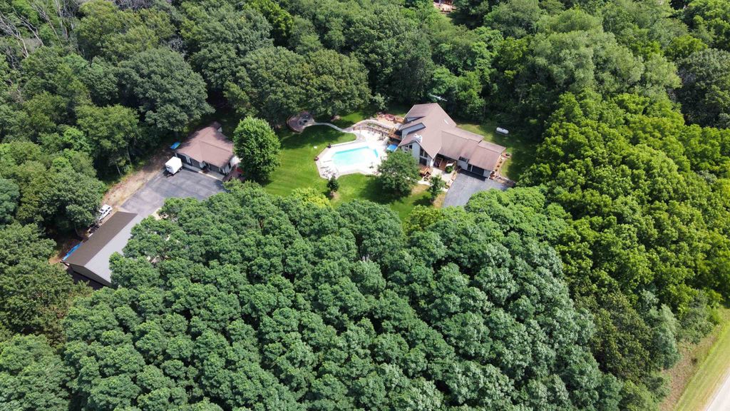 Your Private Estate Retreat Awaits: Escape to nature on this beautifully landscaped 5+ acre wooded estate,where peace, privacy, and craftsmanship shine. A winding drive leads to this custom-built contemporary home full of character. The great room features a striking fireplace & 20' vaulted ceilings.The bright kitchen has hardwood floors,Amish cabinetry, and opens to a large deck-ideal for entertaining or relaxing.The main level includes two spacious bedrooms, a full bath, and laundry. Upstairs, the private master suite offers a full bath and walk-in closet.The lower level has 8' ceilings, a fireplace, and walkout access to pool area. 3 versatile outbuildings-40x46 pole barn, 20x26 heated shop, and 26x34 storage building"”offer endless possibilities. Peaceful, private & full of potential.