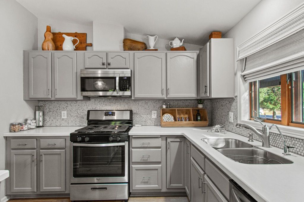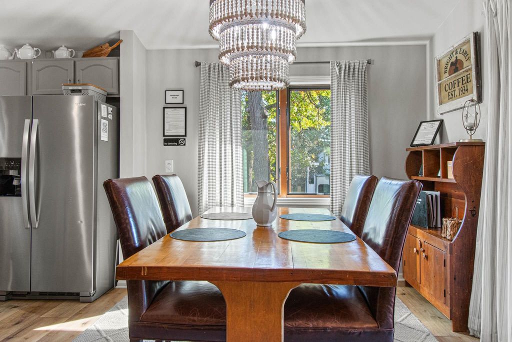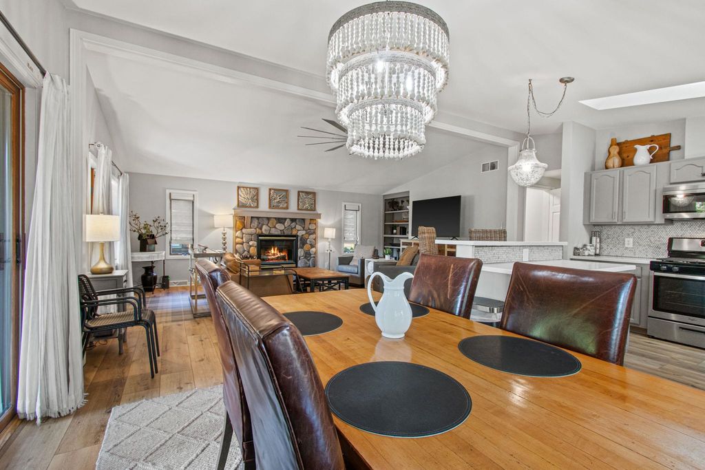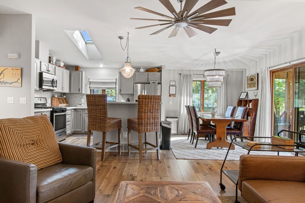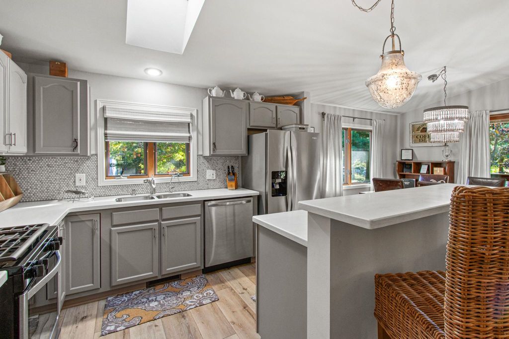 Lake Camelot Waterfront! Is there anything more relaxing than watching the boats slip by on the channel? This gracious home is stunningly updated, inviting guests to linger on the covered porch or by the warm fire. Step into an open layout with cathedral ceilings, plank floors, windows on the water, and a calming, modern aesthetic. Features include a bright, convenient kitchen with tile backsplash, solid surface tops, breakfast bar; lakeside dining, central living area with fieldstone fireplace; main floor laundry; full bath; spacious primary w/ensuite & walk-in closet; and roomy second bedroom. Downstairs find two more lovely bedrooms, hall nook, half bath, and large storage room with access to garage. Let this one become your full time home, or favorite weekend escape! Discover Rome!