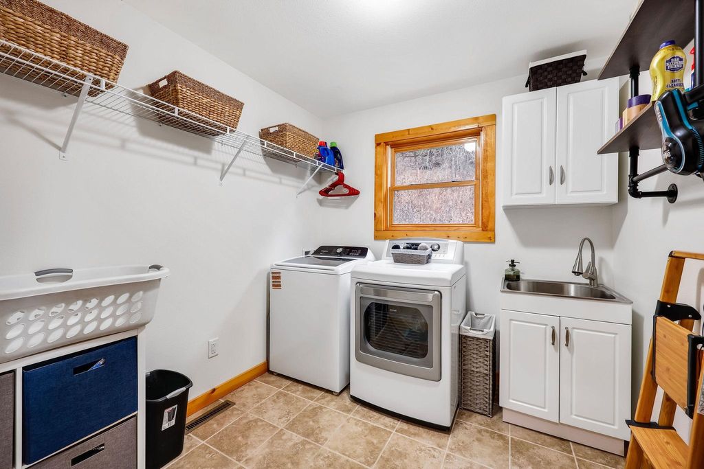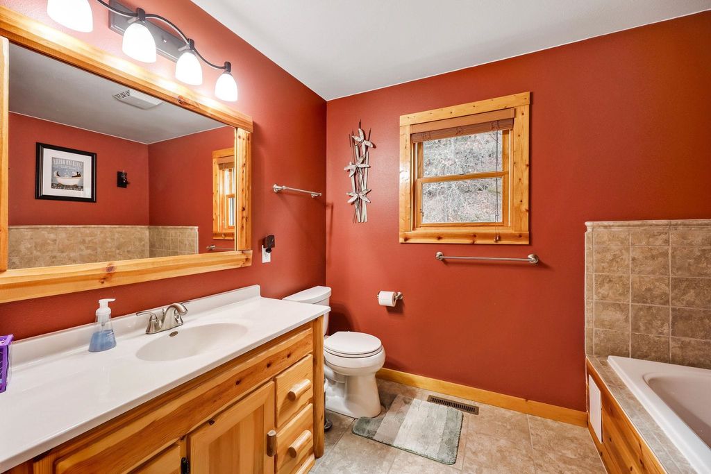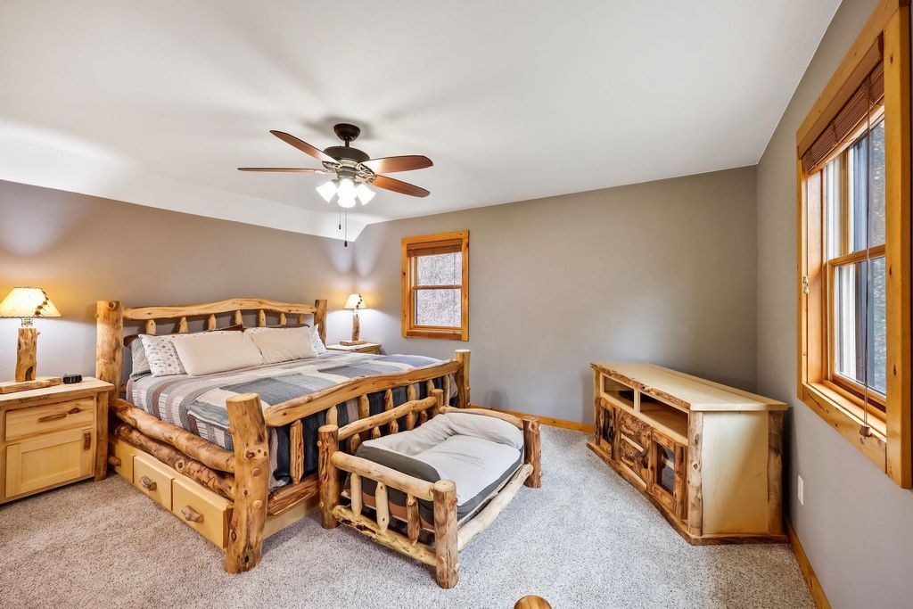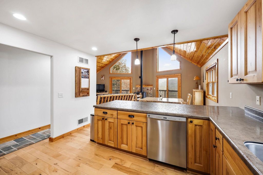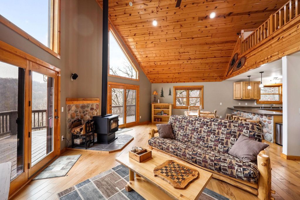 Showings Begin 12/2. ESCAPE TO NATURE ON 14+ ACRES! This gorgeous 3 bed, 2 bath A-frame wood home offers the perfect blend of rustic charm and modern functionality. The open-concept living area features soaring double-height vaulted ceilings, gleaming hardwood floors, and a cozy wood-burning fireplace, creating a warm, welcoming space. The expansive dining area flows seamlessly into a big, functional kitchen with abundant cabinetry and a convenient breakfast bar. Main-level laundry adds everyday convenience, alongside two additional bedrooms and a full bath. Upstairs, the primary suite is a serene retreat with a private ensuite and walk-in closet. Step outside to enjoy over 14 acres of natural beauty, complete with 3 car garage and a private trail winding through the property.