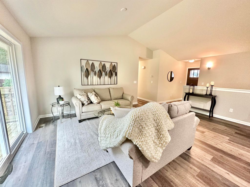 Welcome to this beautifully designed ranch offering 3 bedrooms, 2 bathrooms, and an extra deep 3 car garage. The inviting great room features a cathedral ceiling, open concept layout, and luxury vinyl plank flooring with white trim throughout. The kitchen is perfect for the chef of the family with quartz countertops, breakfast bar, stainless steel gas stove, dishwasher, microwave, and plenty of cabinetry. The primary suite includes a private bathroom with double sink, quartz countertop and a walk in closet. The basement features an egress window and is stubbed for a third bathroom and is ready for your finishing touches. Built with 2x6 construction and located on a double lot with a 12x12 deck and seeded yard. Gas hookup for dryer already in place. Photos are of a Similar Model. Completion
