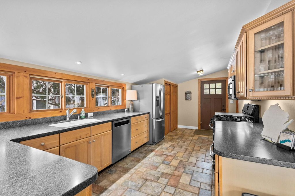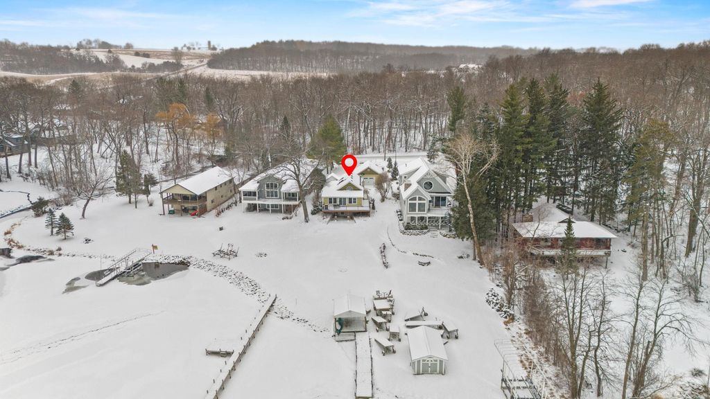 Set along the coveted south shore of Green Lake on Spring Grove Road, this completely re-imagined lakefront retreat offers the perfect blend of luxury, comfort, and timeless lakeside living. This fully restored 3-bedroom, 2.5-bath home is designed to capture stunning lake views and effortless indoor-outdoor living. Vaulted ceilings and rich hardwood floors frame the main living spaces, while a dramatic stacked-stone fireplace anchors the great room with warmth and character. Step out to the lakefront deck to enjoy morning coffee, evening sunsets, and front-row views of the water. The walkout lower level opens directly to the lake and features a smaller family room ideal for reading a book or relaxing after a day on the water.The gently sloping lot offers easy shoreline access. A detached
