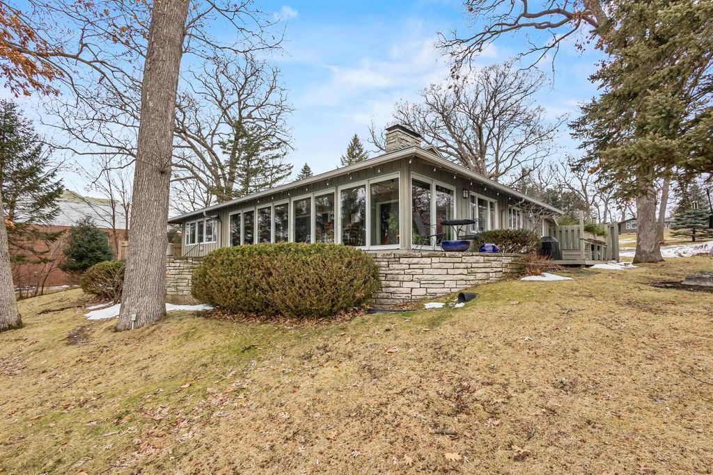 This 4 bedroom, 3 bath home is a casual midcentury lake house that combines luxury with 100 ft of frontage in one of Green Lakes best locations. Shaded by mature oaks on a deep, sandy shoreline, Lac Verde Circle is one of Green Lake's most desirable addresses. Walkable to town, golf, dining, and spa facilities, these properties rarely hit the open market. Designed by Comstock Associates of Carmel, CA and built in 1963, this architectural home adapts the fairytale signature of the firm with 60s styling. Lake views greet you at the door and expand dramatically to a wall of windows, perfectly framing the homes elevated view. The large, natural sandstone fireplace is wood burning & anchors the primary living space while tying the inside to the outside where it is used again in the front entrance and the organic, curved patio. Tastefully updated, the home features high end appliances & utilities. This property includes a one-third shared ownership interest in the vacant lot behind the home
