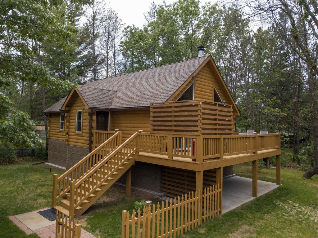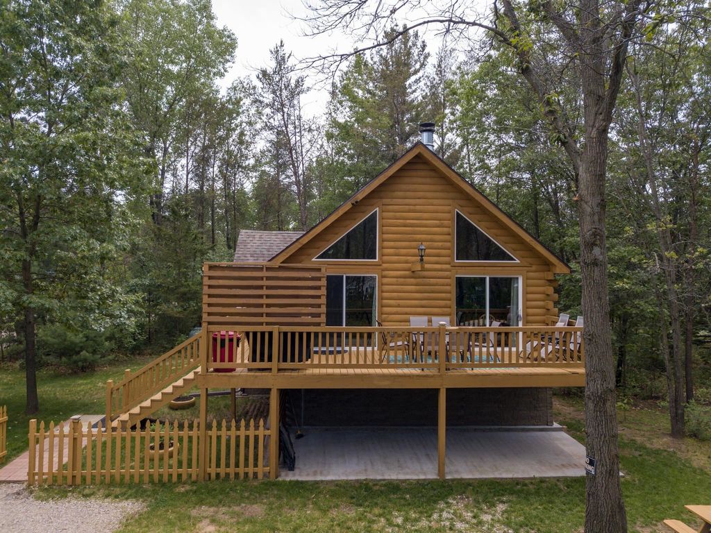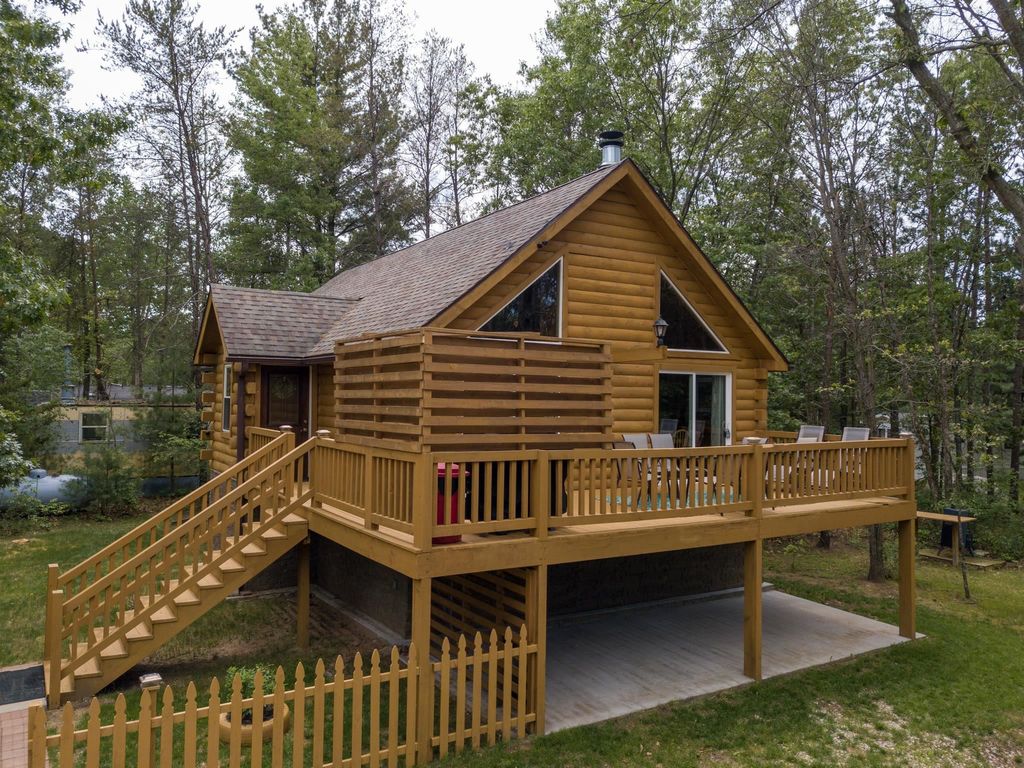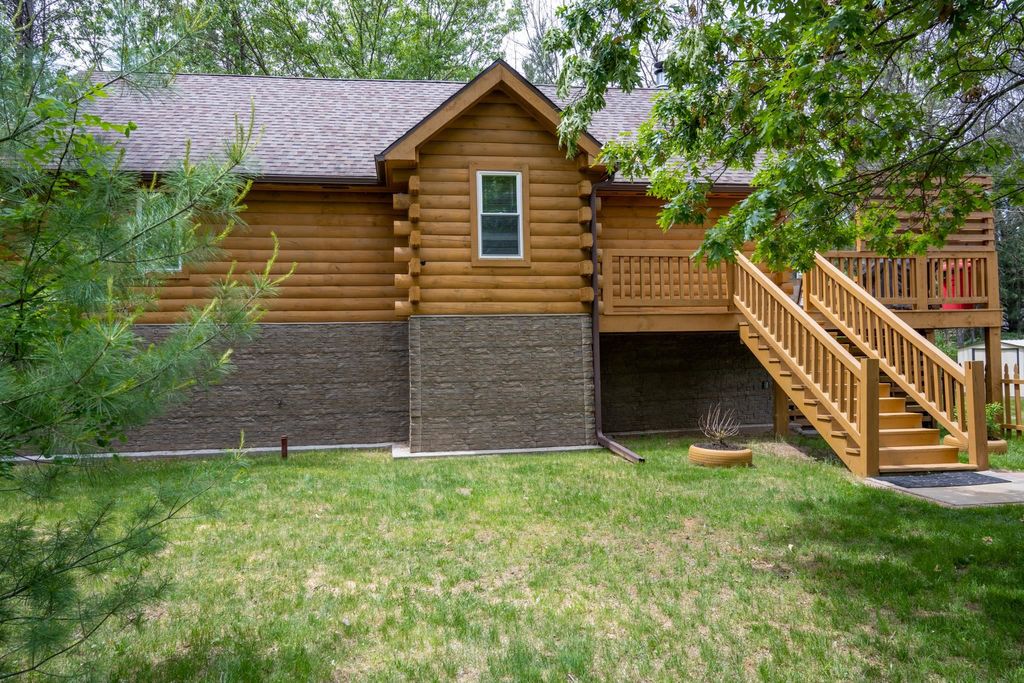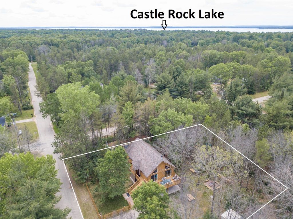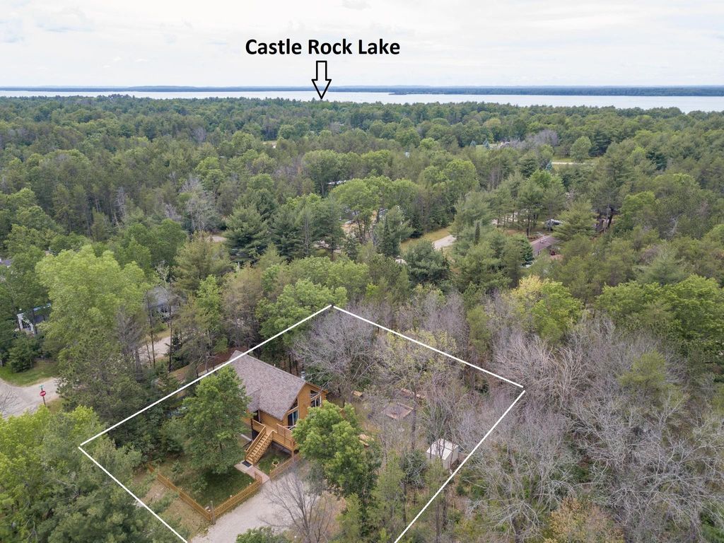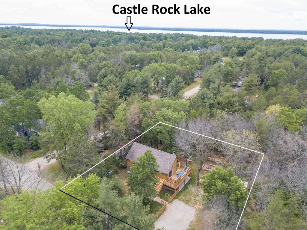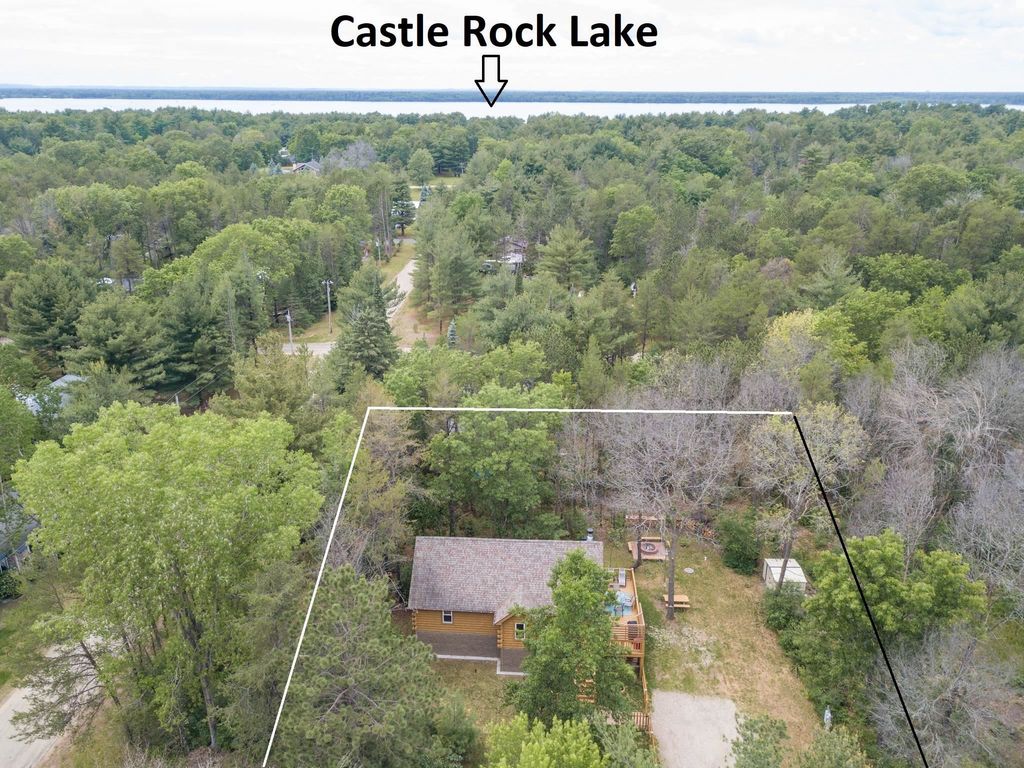 Super clean & neat log (D-log style) cabin within walking distance to Castle Rock Lake. Main level features living room, kitchen, dining area, 2 bedrooms w/ plenty of storage space, foyer, stackable washer & dryer in the closet, wood burning fireplace & walkout to the wrap around deck with privacy feature. Upper floor has 3rd bedroom & loft area. The ground level has 5' crawl space (outside entry only) for all the utilities & ample storage room. Covered concrete patio could be perfect for your dream hot tub. Nicely wooded backyard w/ firepit & garden shed to keep all your garden essentials. This could be your cabin you have been looking for in the Castle Rock Lake area or an investment. This property is in short term rental & could bring income to help with up keep of owning the property.
