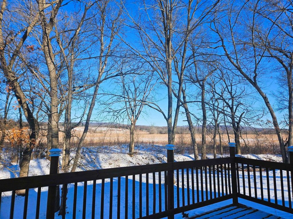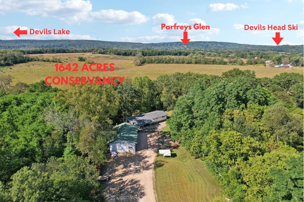 Looking for a spacious rural home on 9 acres with secluded woods surrounded by nature, yet close to amenities and conveniently located for an easy commute? Just 5 mins from Lake Wisconsin with room to roam this would be a great vacation getaway. You're covered with a 50x30 HEATED GARAGE w/loft for boat, toys, workshop & 200amp service. Property borders 1600+acres of Conservancy land that you can access right out your back door! This modular ranch features bright open spaces with 4 bedrooms on 1600sqft main floor and features a walk out lower level with French doors, a NEW full bath, studded for a 5th bed, rec room and bonus room to add another 1400sqft of living space. Enjoy sweeping pastoral views of wildlife and nature from your wrapped deck while watching the sun set over the bluffs. Outdoor enthusiasts dream- UTV, snowmobile, hunt, ski & golf. This kind of property is hard to find so get ready to surround yourself with space & solitude when you make this hidden gem yours!