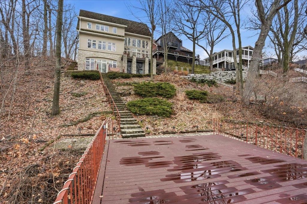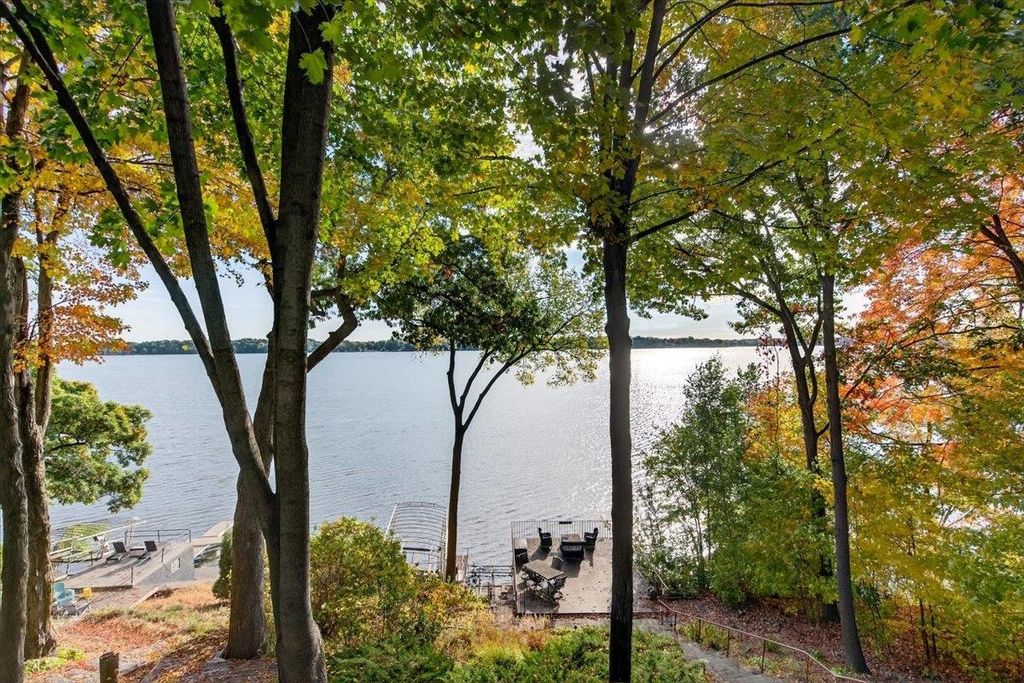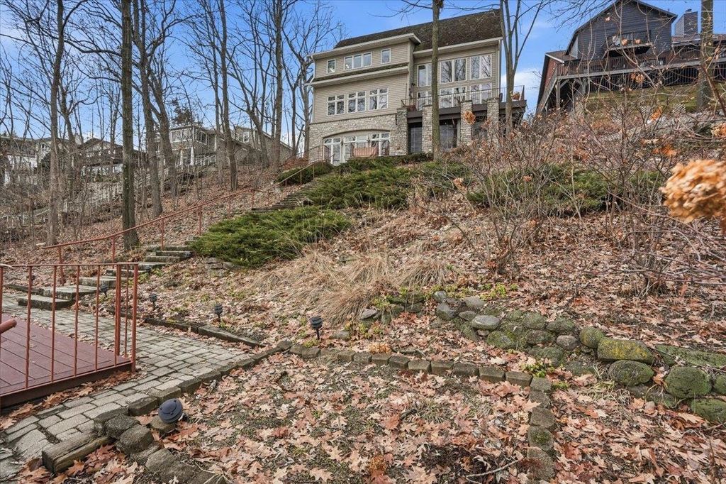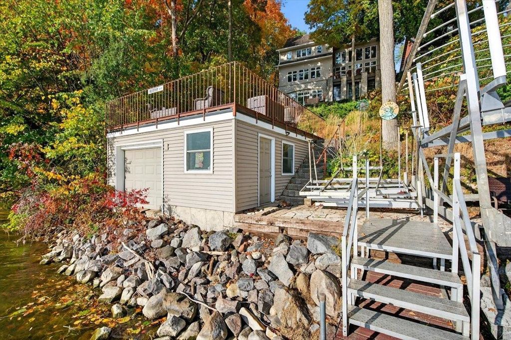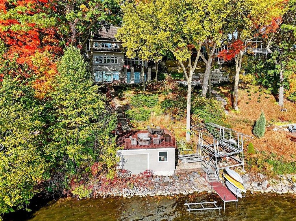 Perched high above the water, this remarkable lake home captures breathtaking views from every level through walls of windows that frame the spring-fed lake, known as one of the cleanest in Wisconsin. A canopy of mature trees surrounds the fully landscaped, tiered backyard, creating a private, lush setting that changes beautifully with the seasons. Composite decking overlooks the water, with a three-season room below for year-round enjoyment. The oversized boathouse is one of the largest on the lake, offering a 500 sq ft elevated entertaining deck at the water's edge. At night, accent and pathway lighting give the home an unforgettable glow from the lake. Extensive, high-quality updates enhance the home throughout. Enjoy boating, kayaking, and fishing just steps away. Located minutes from I-94, near the 52-mile Glacial Drumlin Trail, and within an hour of both Madison and Milwaukee, all while benefiting from Lake Mills' vibrant community and highly regarded school.