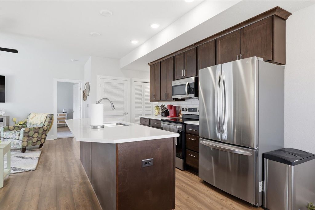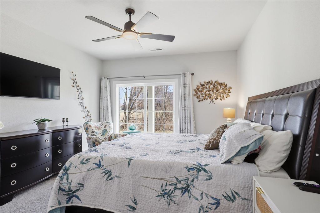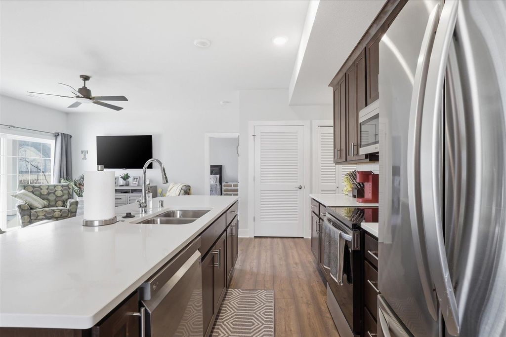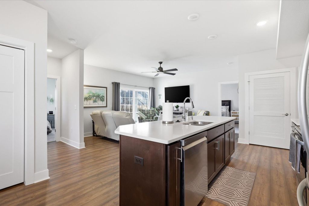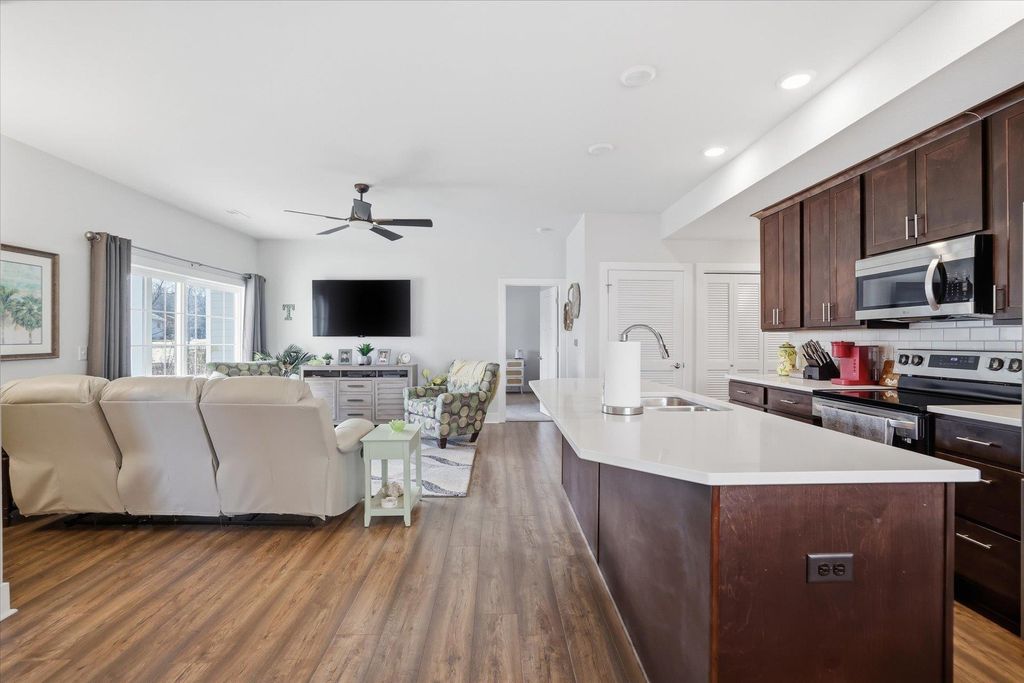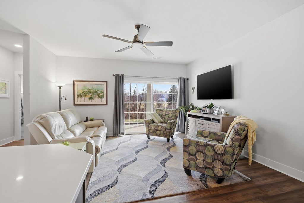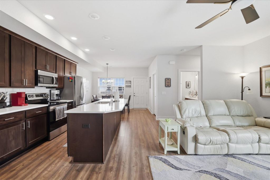 Welcome to this beautifully maintained and thoughtfully upgraded 2 bedroom, 2 full bath first floor condo offering comfort, convenience and easy living. The open concept living and dining area is filled with natural light and provides the perfect space for relaxing or entertaining. The kitchen features quartz countertops, stainless appliances and spacious dining area ideal for everyday meals or hosting guests. The living room features sliding doors to your private patio area. The spacious primary suite features a private full bath and generous closet space. A second bedroom offers flexibility for guests, a home office or additional living space. The garage is equipped with a smart door with camera and there is additional storage off the rear patio. Additional updates include ceiling fans, light fixtures, quality window coverings and new washer and dryer. Enjoy low maintenance living in a desirable location close to shopping, dining, and everyday conveniences.