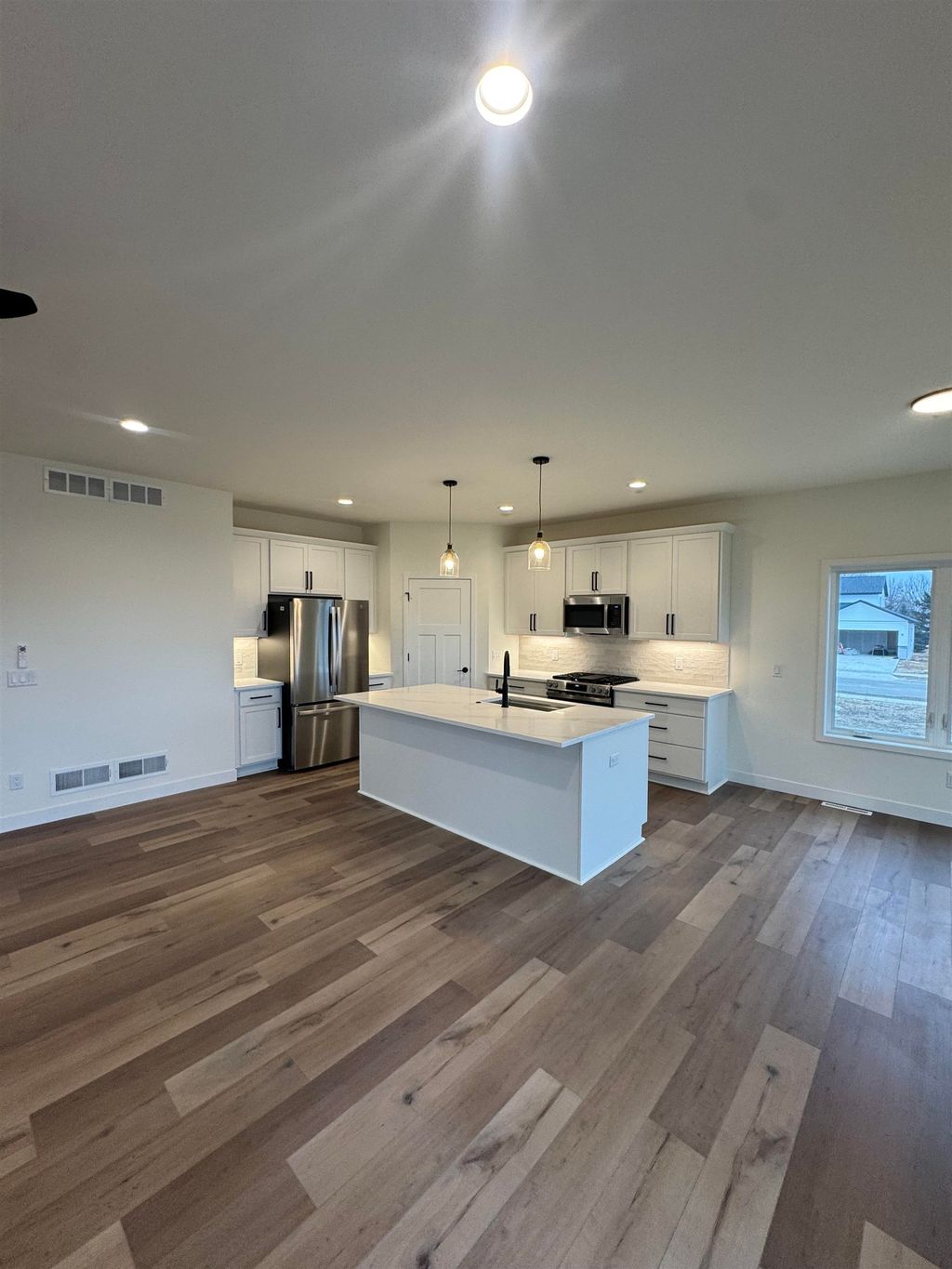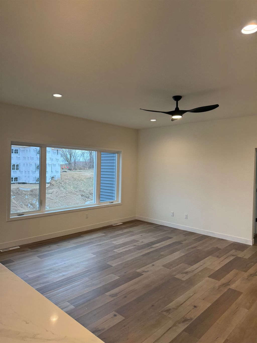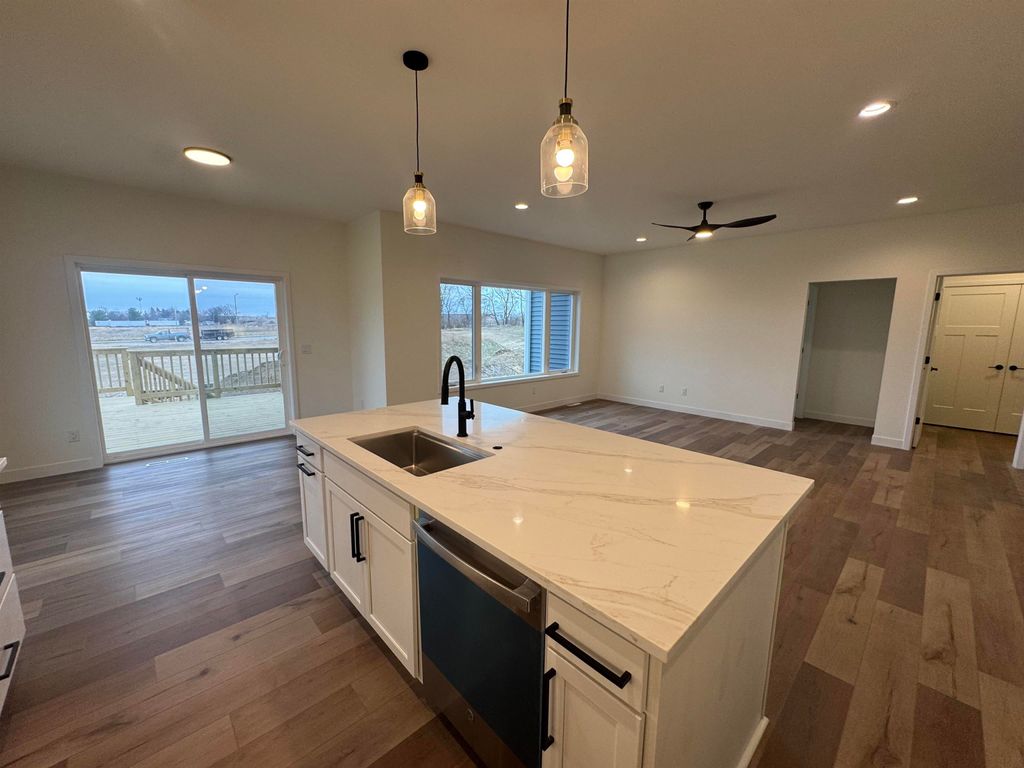 Move-in ready new construction - 4-bedroom, 3-bath ranch with an open-concept layout. The main level features a spacious living room connected to the kitchen and dining area. The kitchen includes stainless steel appliances"”microwave, gas range, dishwasher, and refrigerator"”along with ample cabinetry and a pantry. The primary suite offers a walk-in closet and private bath. Two additional bedrooms on the main floor. Covered deck off the main living area. Attached 2-car garage. Mudroom with a laundry chute to the basement. The finished lower level includes a fourth bedroom, full bath, laundry room, wet bar, and large rec room. Optional HOA membership available for access to the community pool and fitness center. Backed by a one-year builder warranty.