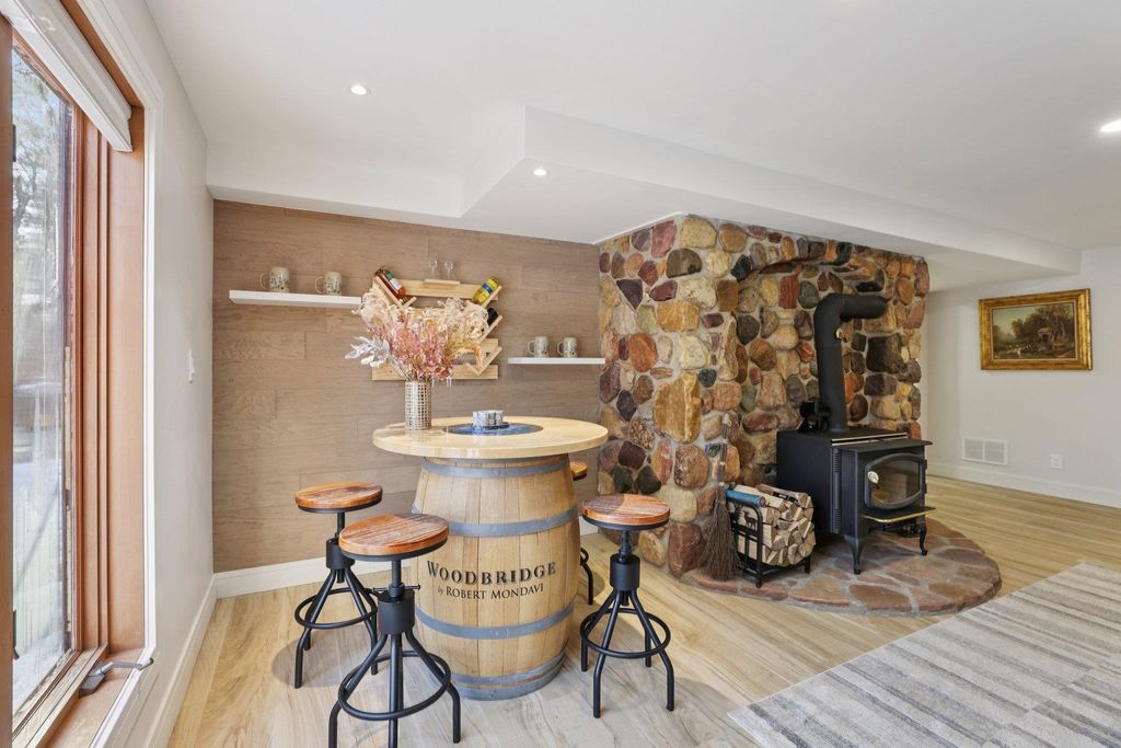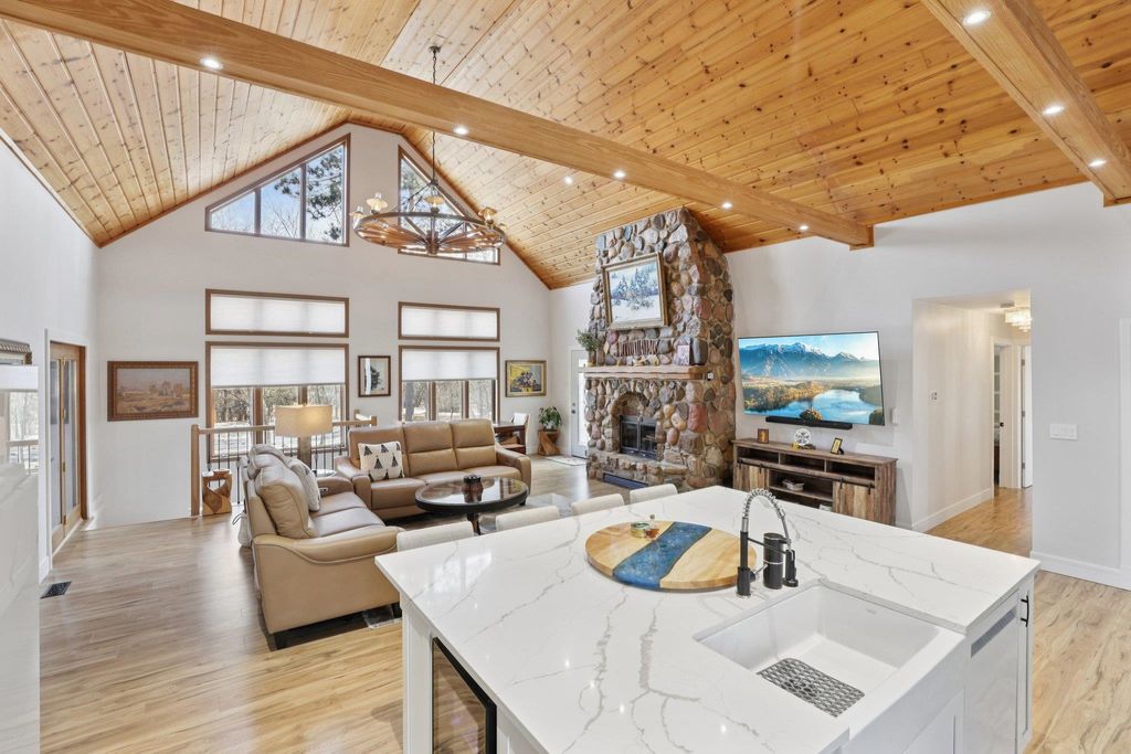 Positioned on 1.12 acres with over 200 feet of Wisconsin River frontage, this fully reimagined 4-bedroom, 3-bath home offers privacy, scale, and luxury riverfront living. Completely remodeled from top to bottom, the home reflects quality craftsmanship and intentional design throughout. The open-concept main level connects the kitchen, dining, and living areas with vaulted ceilings and large windows that fill the space with natural light and capture peaceful river and backyard views. The main level features a spacious primary suite with private bath, 2 additional bedrooms, full bath, and main floor laundry. The exposed walkout lower level adds an additional bedroom, full bath, sauna, and 2nd wood-burning fireplace with sitting area, offering space for recreation or extended living. The grounds blend open lawn with mature trees and a gentle, level approach to the shoreline. A rare opportunity to own a renovated riverfront home with acreage, just minutes from Wisconsin Dells and Baraboo.