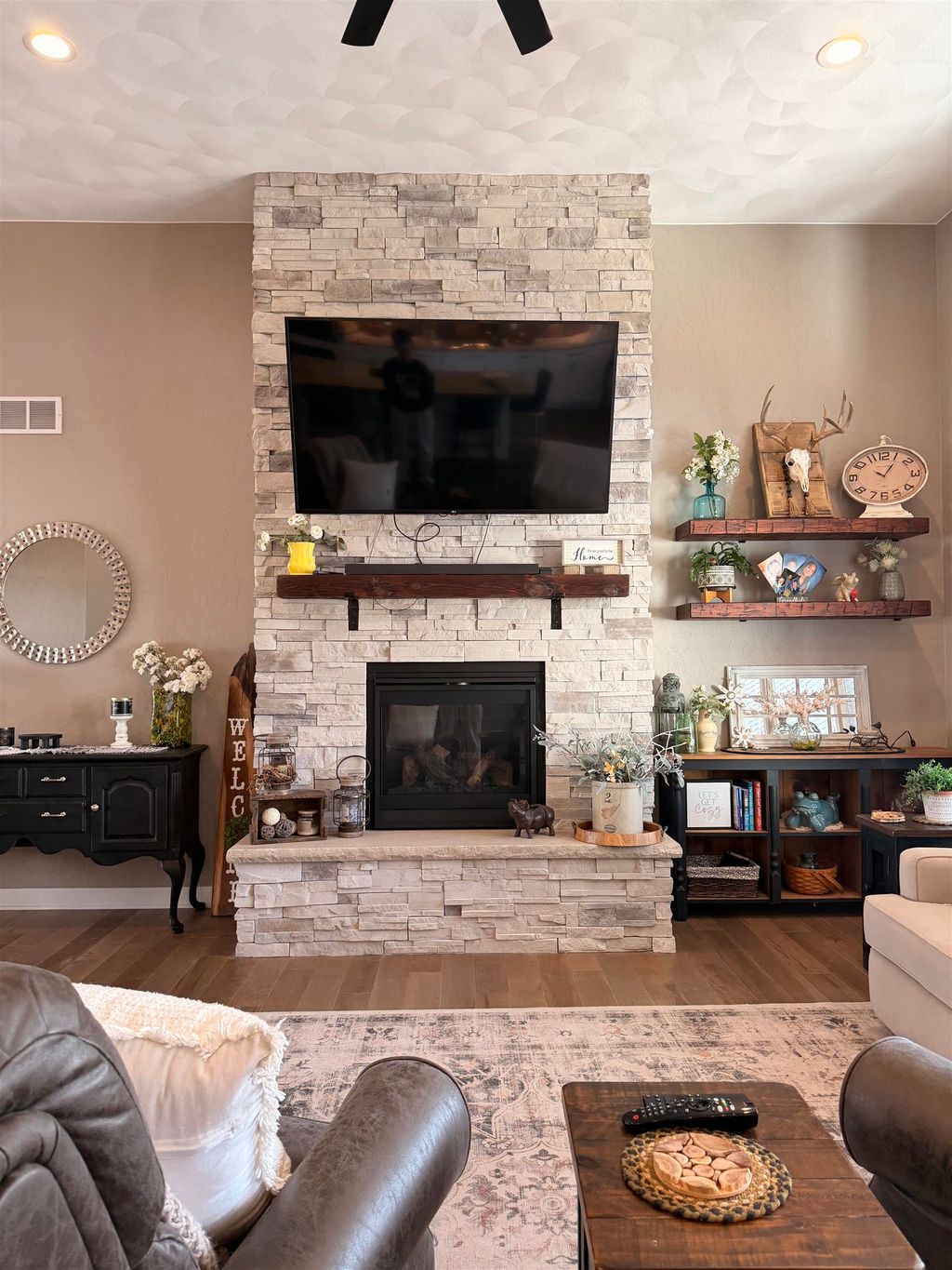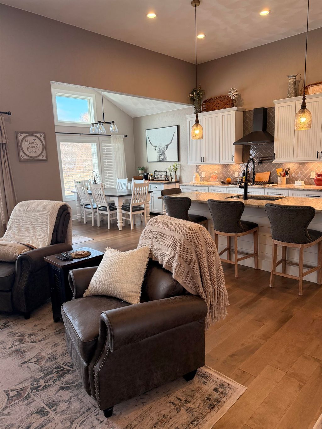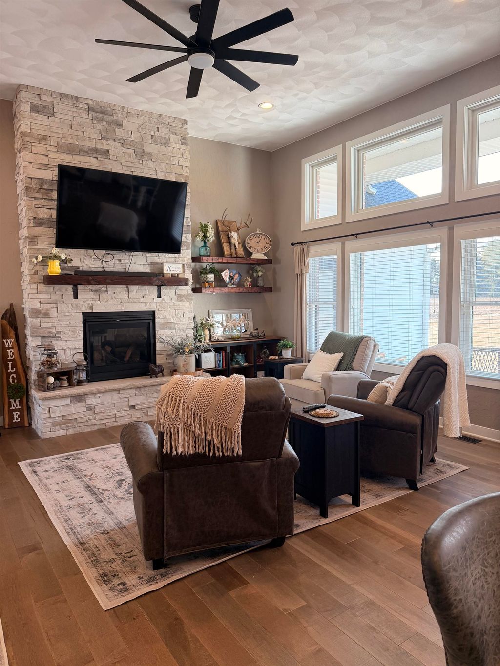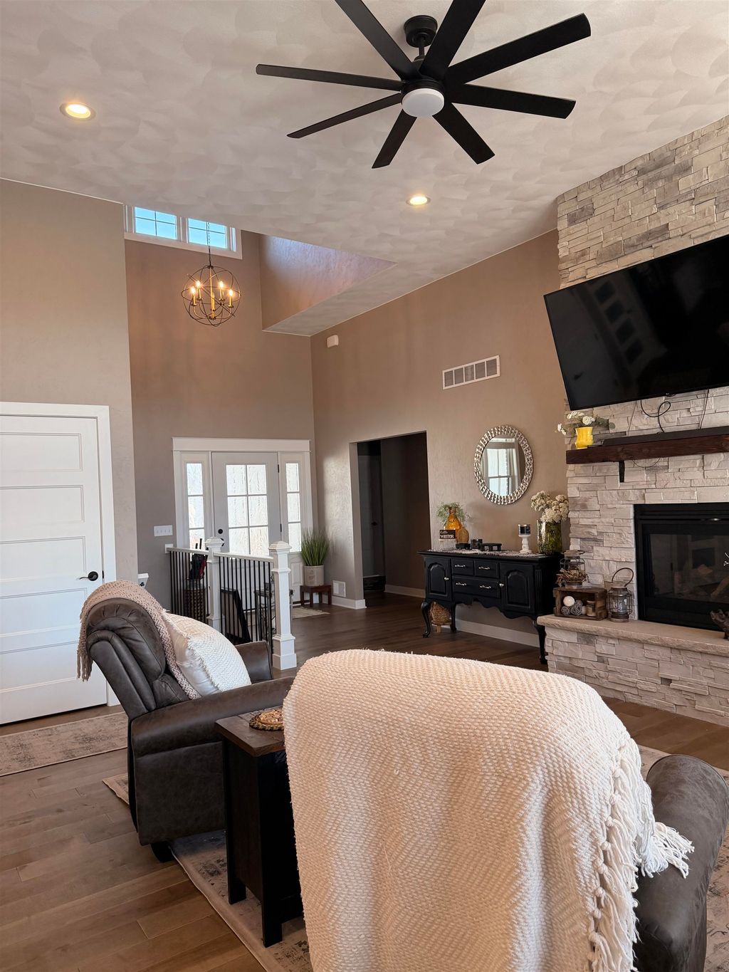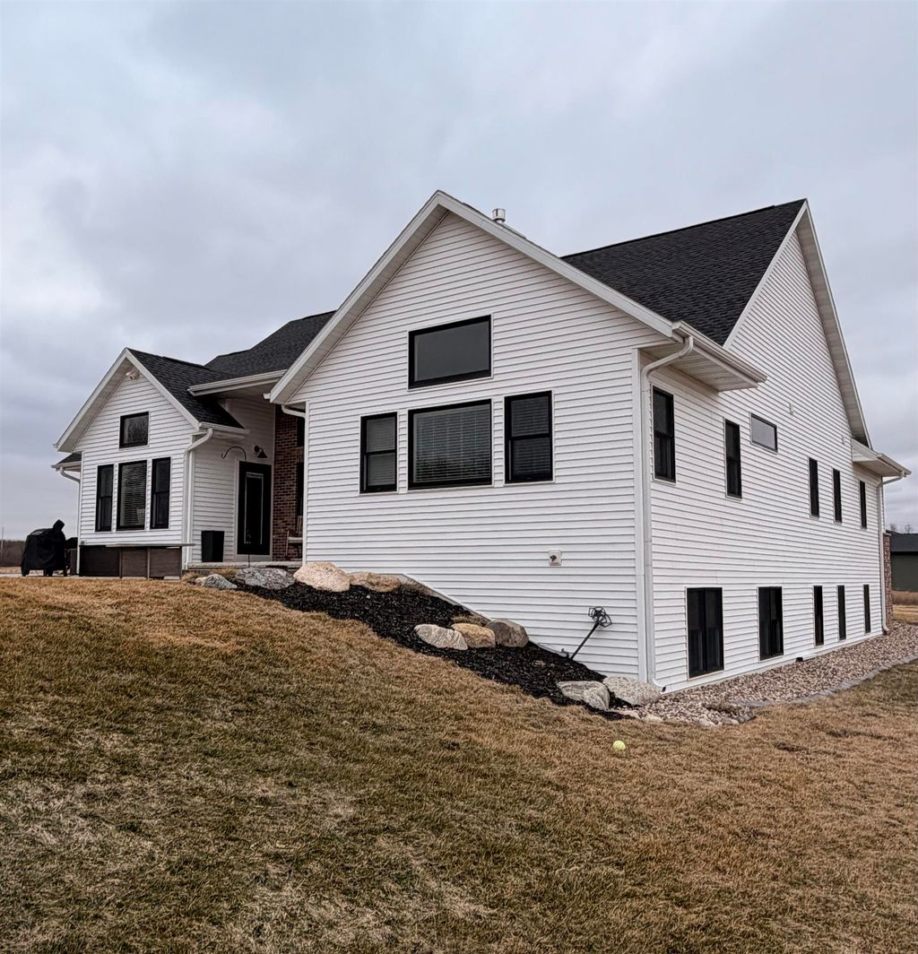 Welcome to this stunning, better-than-new Custom home in Arbor Ridge subdivision. The floor plan is well thought out and practical. featuring wood floors, floor-to-ceiling stone fireplace, tons of natural light with expansive windows, a 20 ft foyer entrance with dormer windows. Butler pantry with a wine refrigerator, Main floor laundry with cabinets and sink. Tons of storage throughout. The backyard features a large, custom-stamped concrete patio. The lower level has 9 ft ceilings, is 100% framed, and is ready for electrical and drywall, including additional 2 bedrooms, a bonus room, a rec area, and storage rooms. The homeowner is the listing agent