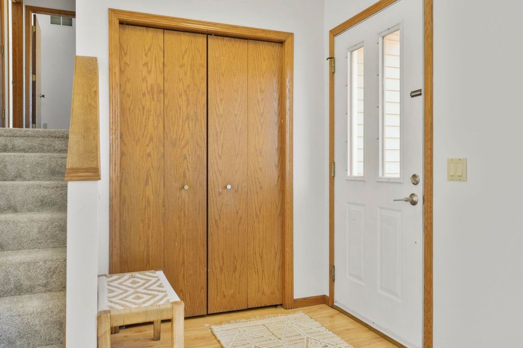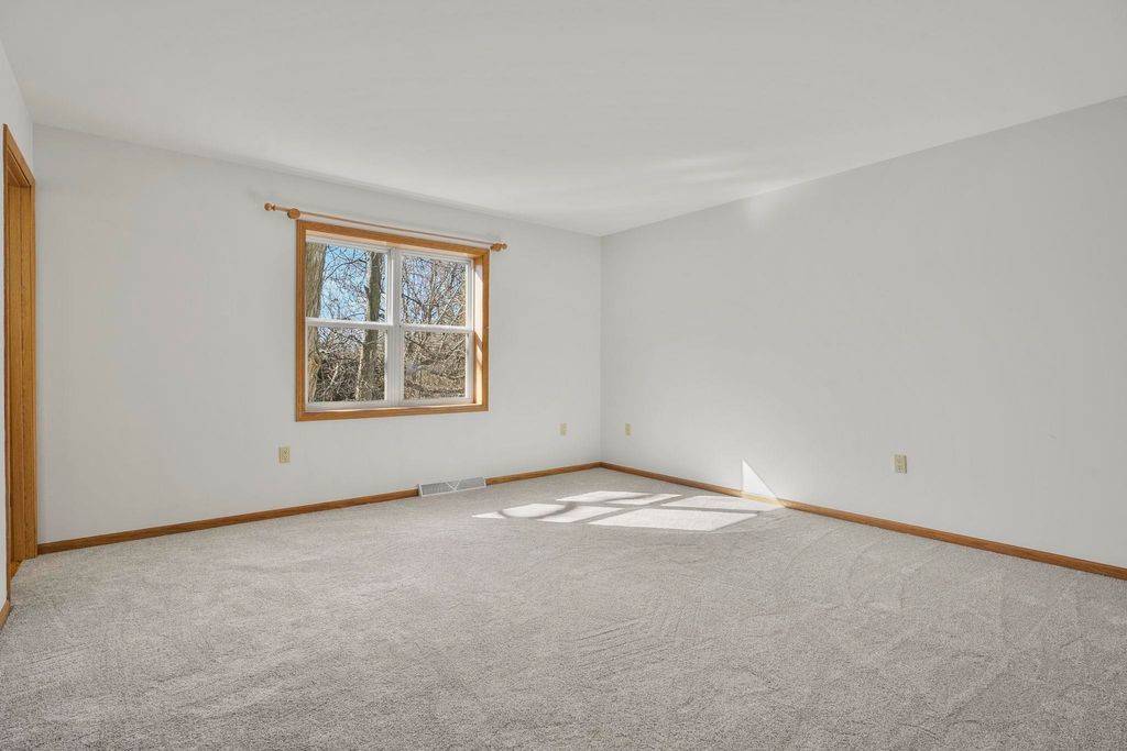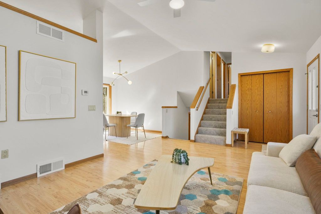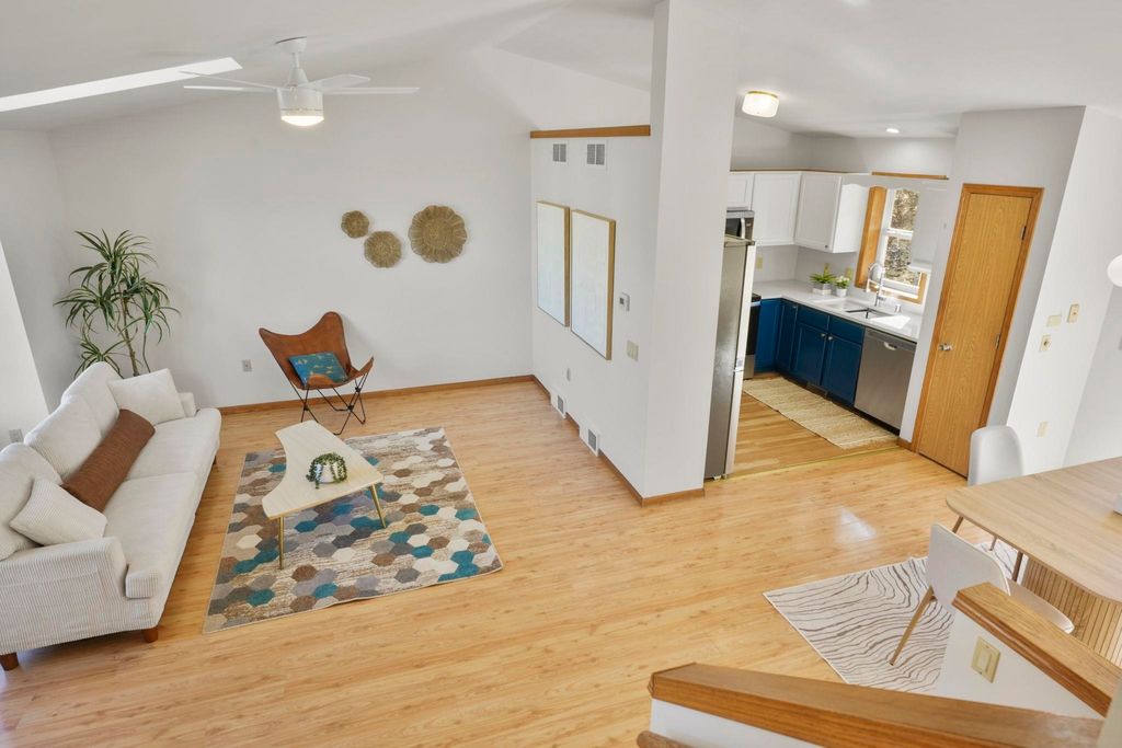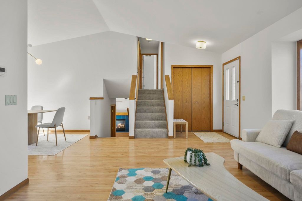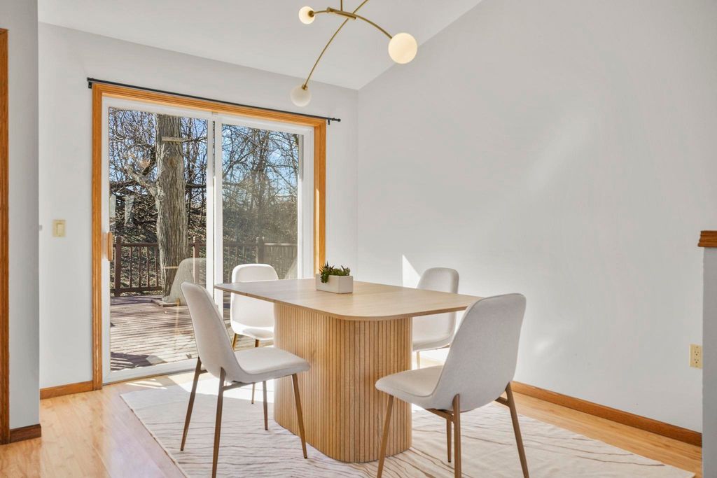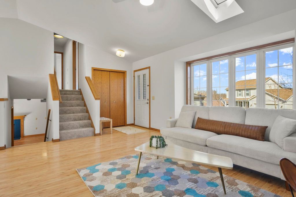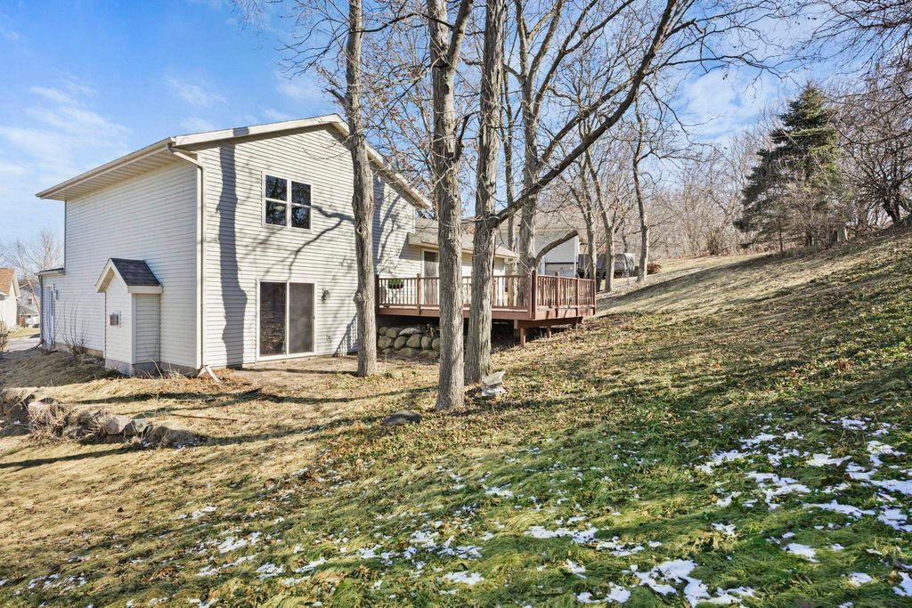 Showings to begin 2/27. Tucked in a quiet cul-de-sac and backing to city green space, this beautifully updated home offers rare privacy in a convenient location. Major recent improvements include a new roof and skylight, furnace and A/C, water heater, water softener, kitchen appliances, attic insulation, carpet, lighting, and fresh paint, which makes it move-in ready. The open-concept main level connects the living, dining, and kitchen areas with easy access to the back deck overlooking the wooded yard. The kitchen has all new appliances, quartz countertops and handy workstation sink. Upstairs features three bedrooms, including a spacious owner's suite with walk-in closet and private bath. The full walk-out lower level adds flexible living space with a gas fireplace, third full bath, and finished rec area, ideal for a family room or office. Close to shopping, dining, and a few steps away from Sandstone Park and the elementary school. Includes $1,000 landscaping credit.