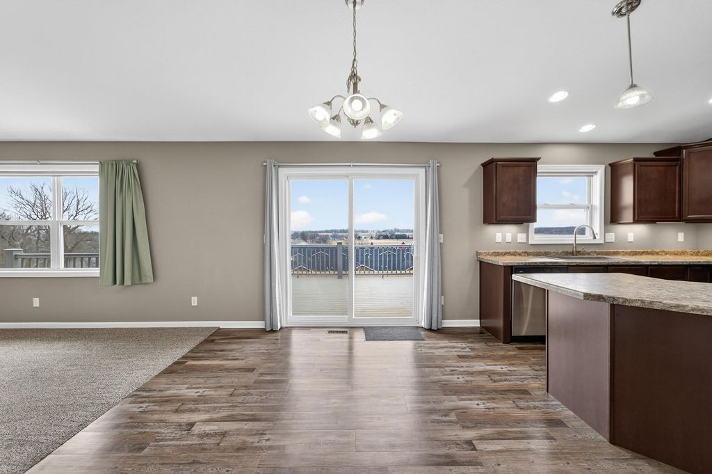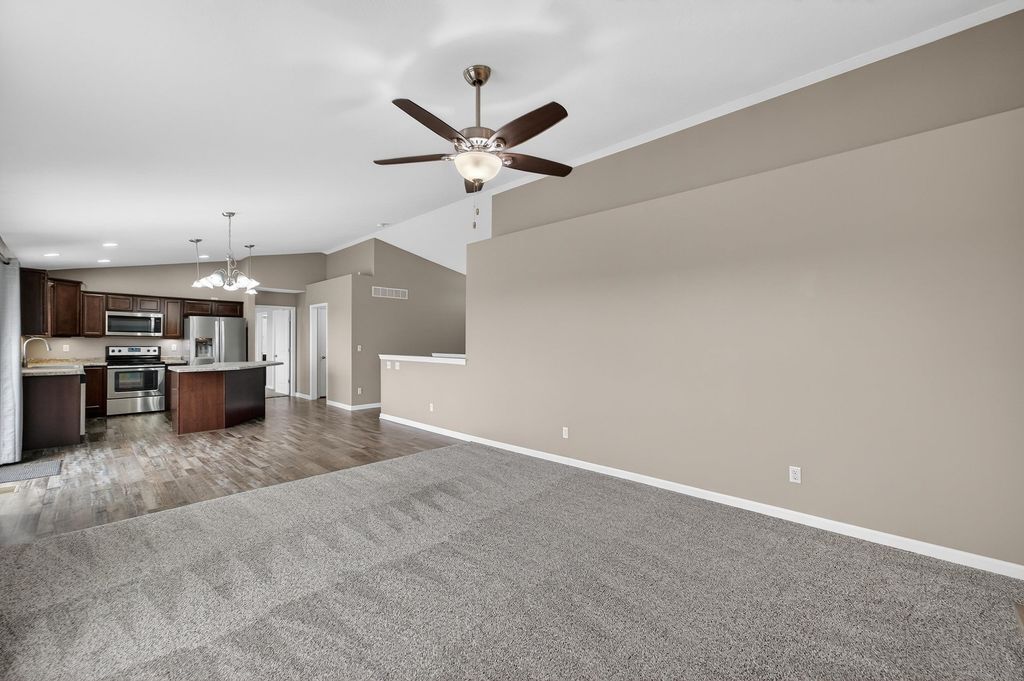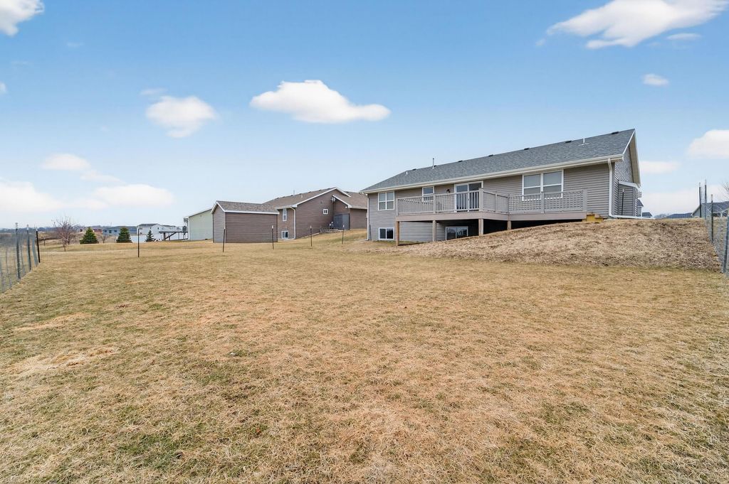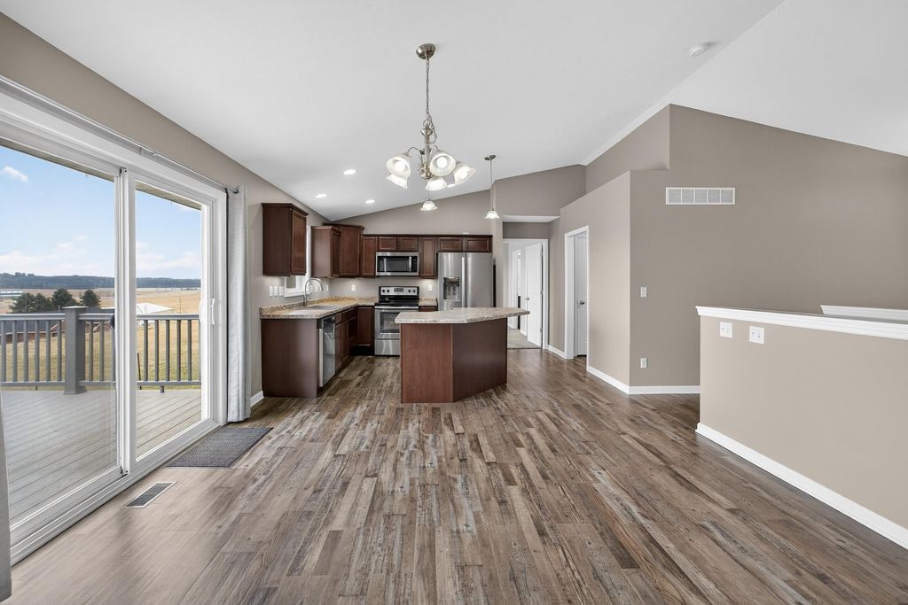 Nestled in the desirable Red Hawk Farms neighborhood - conveniently close to great schools, parks, shopping & easy highway access - this well-maintained, like-new home is completely move-in ready. The open main level feels bright & welcoming boasting a spacious great room w/ vaulted ceilings & a cozy gas fireplace that flows naturally into the kitchen. The kitchen features a center island w/ breakfast bar, SS apps, plenty of cabinets & an easy, functional layout for everyday use. Sliding doors lead to a private deck w/ beautiful panoramic views - perfect for morning coffee or relaxing evenings outdoors. The primary bedroom is a comfortable retreat w/ a large walk-in closet & private bath. Two additional generously sized bedrooms get lots of natural light & offer plenty of space for everyone. The unfinished lower level has egress windows & bathroom rough-ins, giving you room to add a rec room area, extra bedrooms, for your creative expansion designs!