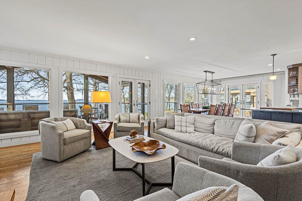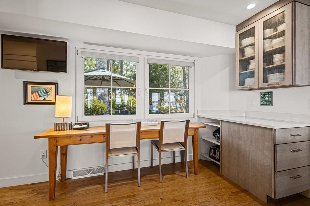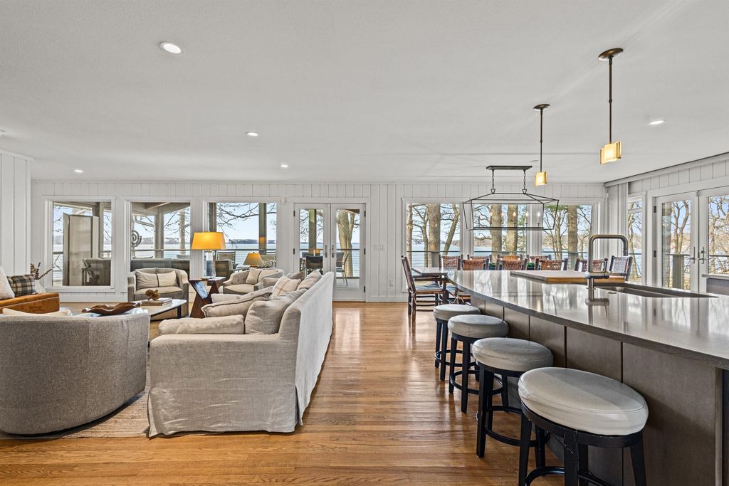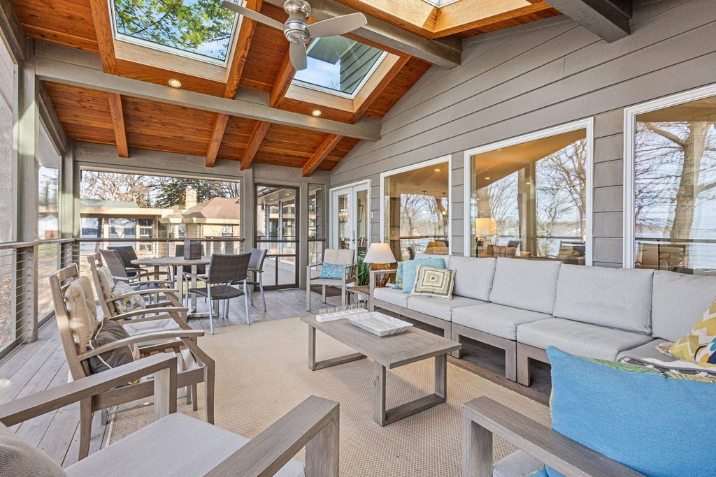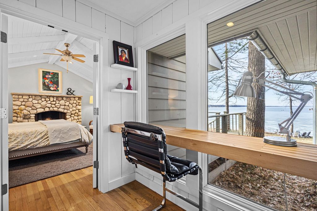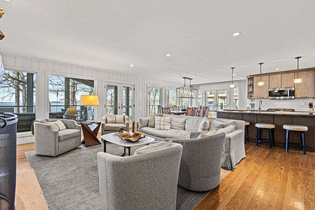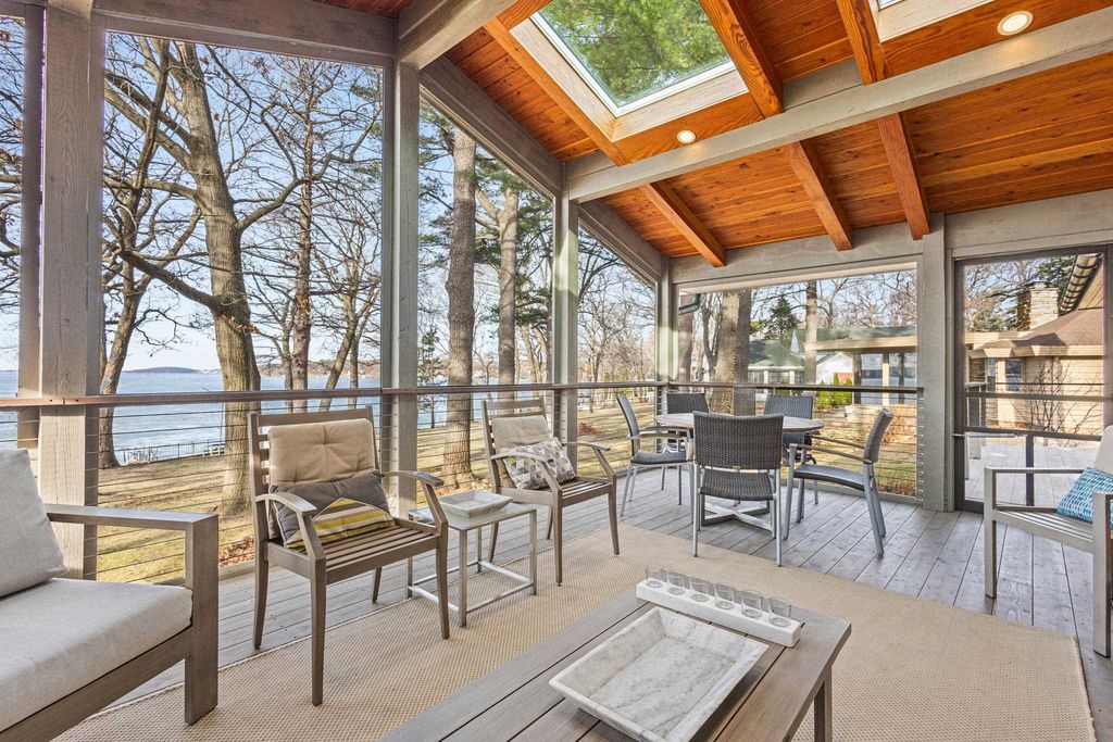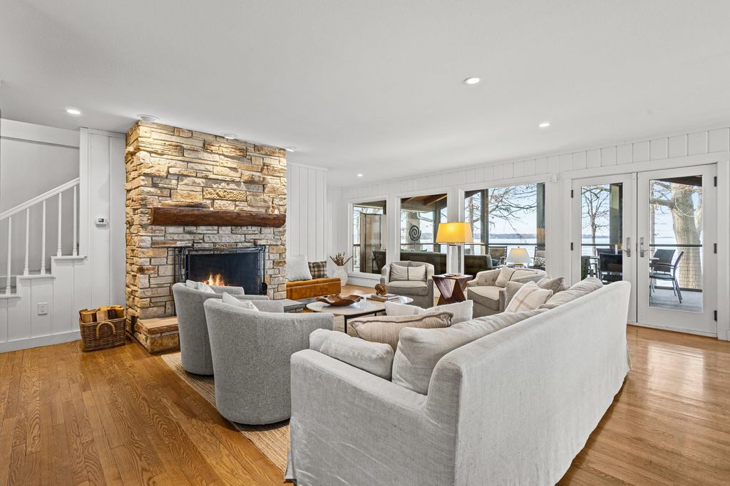 Prestigious Greenway Ave on the north shore of Green Lake is home to this exceptional modern rustic lake house. Originally built in 1945 and completely rebuilt top-to-bottom to today's standards, the residence blends timeless lake charm with refined comfort. The expansive great room serves as the heart of the home, creating an inviting central gathering space. Offering 6 bedrooms plus a den and 5.5 baths, the home is designed for both relaxation and entertaining. The huge lakeside screened porch with four skylights captures breathtaking water views. A vaulted ceiling highlights the main-floor primary suite, while an upper-level ensuite and spacious lower-level family room provide room for guests. Two wood-burning fireplaces, warm wood floors throughout, and a durable metal roof add character. Outside, enjoy the large lakeside fire pit and beautifully landscaped grounds on one of Green Lake's most coveted streets.