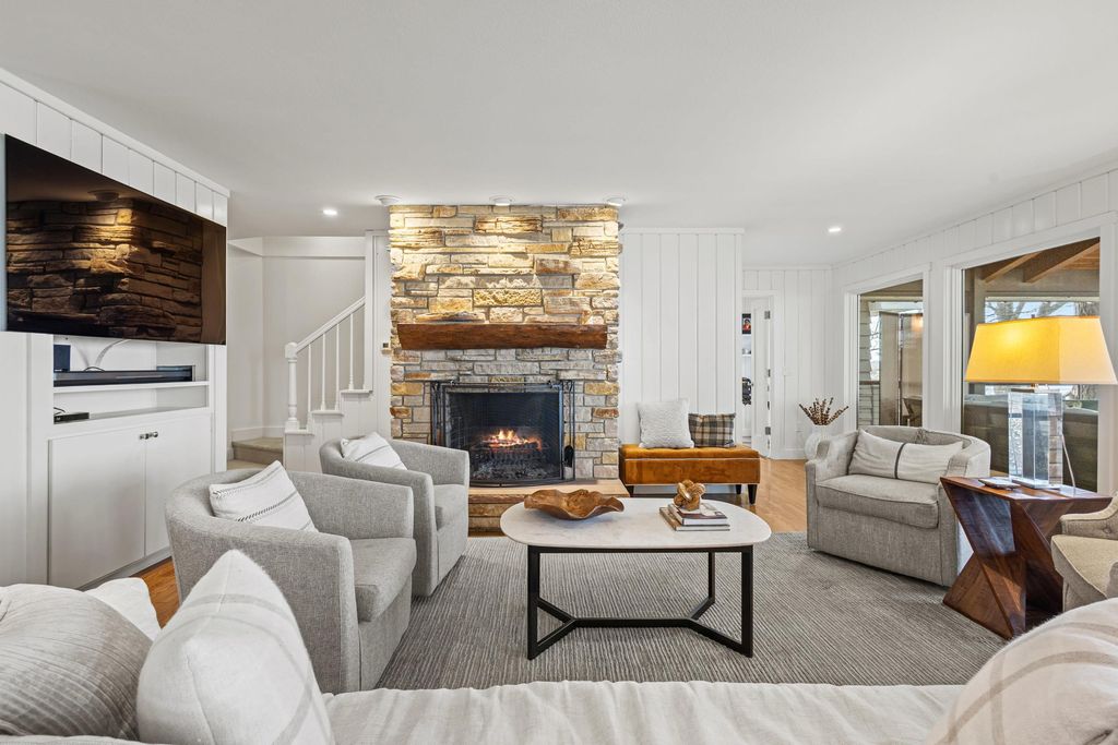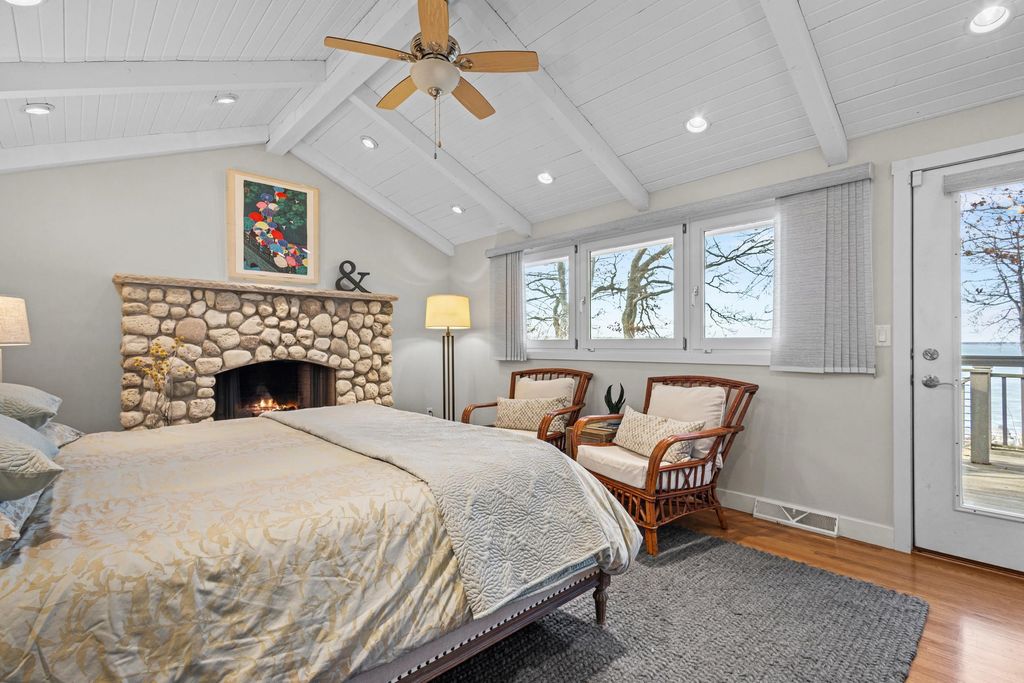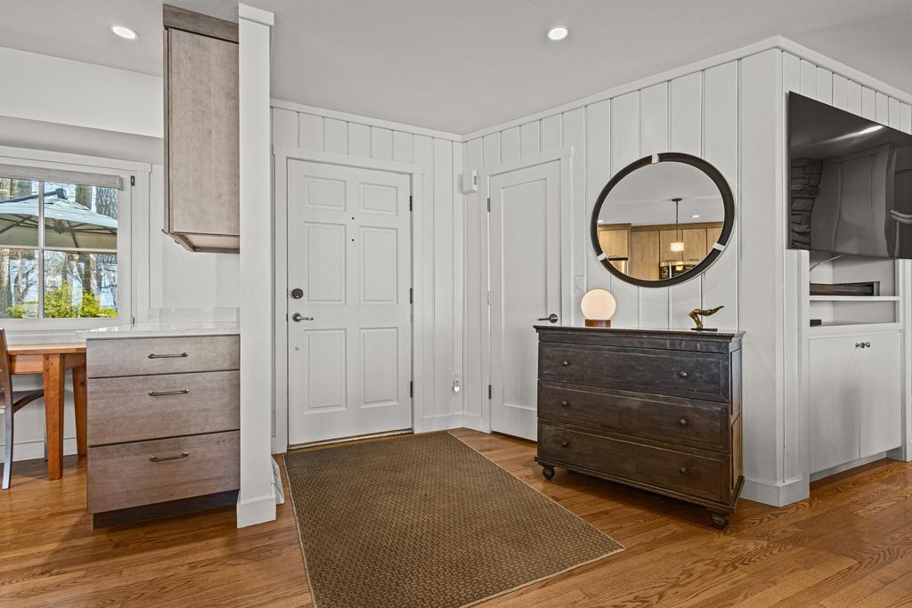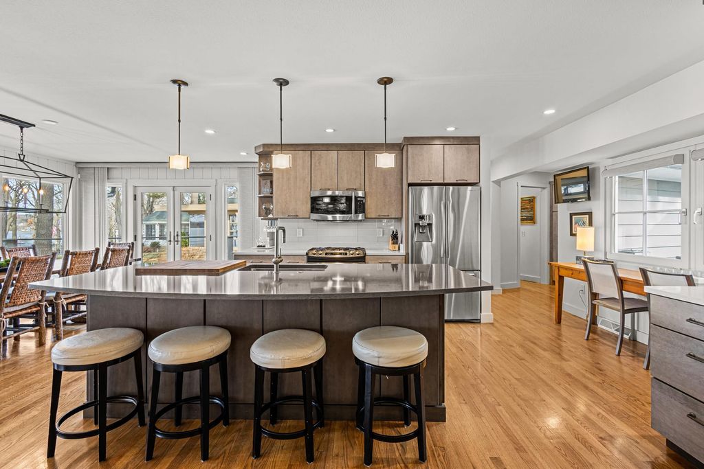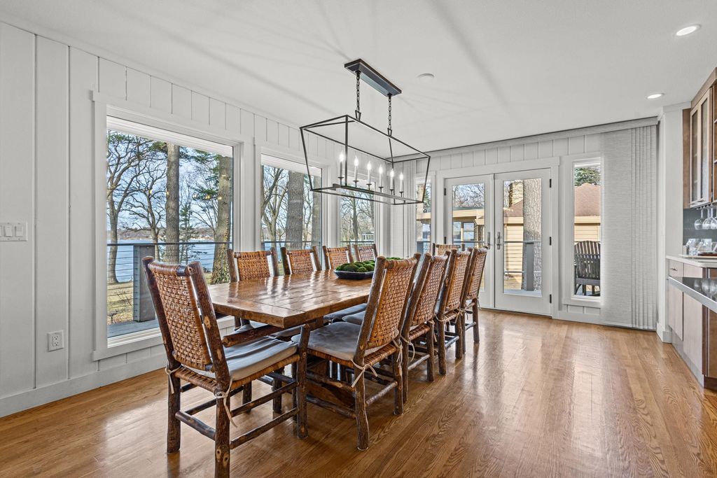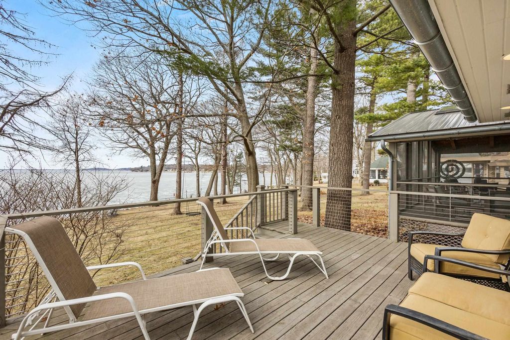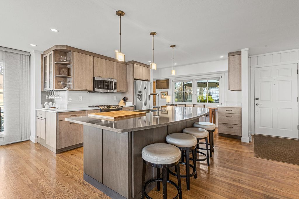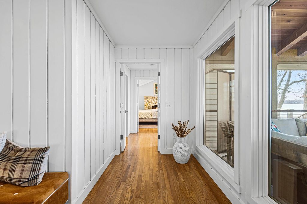 Prestigious Greenway Ave on the north shore of Green Lake is home to this exceptional modern rustic lake house. Originally built in 1945 and completely rebuilt top-to-bottom to today's standards, the residence blends timeless lake charm with refined comfort. The expansive great room serves as the heart of the home, creating an inviting central gathering space. Offering 6 bedrooms plus a den and 5.5 baths, the home is designed for both relaxation and entertaining. The huge lakeside screened porch with four skylights captures breathtaking water views. A vaulted ceiling highlights the main-floor primary suite, while an upper-level ensuite and spacious lower-level family room provide room for guests. Two wood-burning fireplaces, warm wood floors throughout, and a durable metal roof add character. Outside, enjoy the large lakeside fire pit and beautifully landscaped grounds on one of Green Lake's most coveted streets.