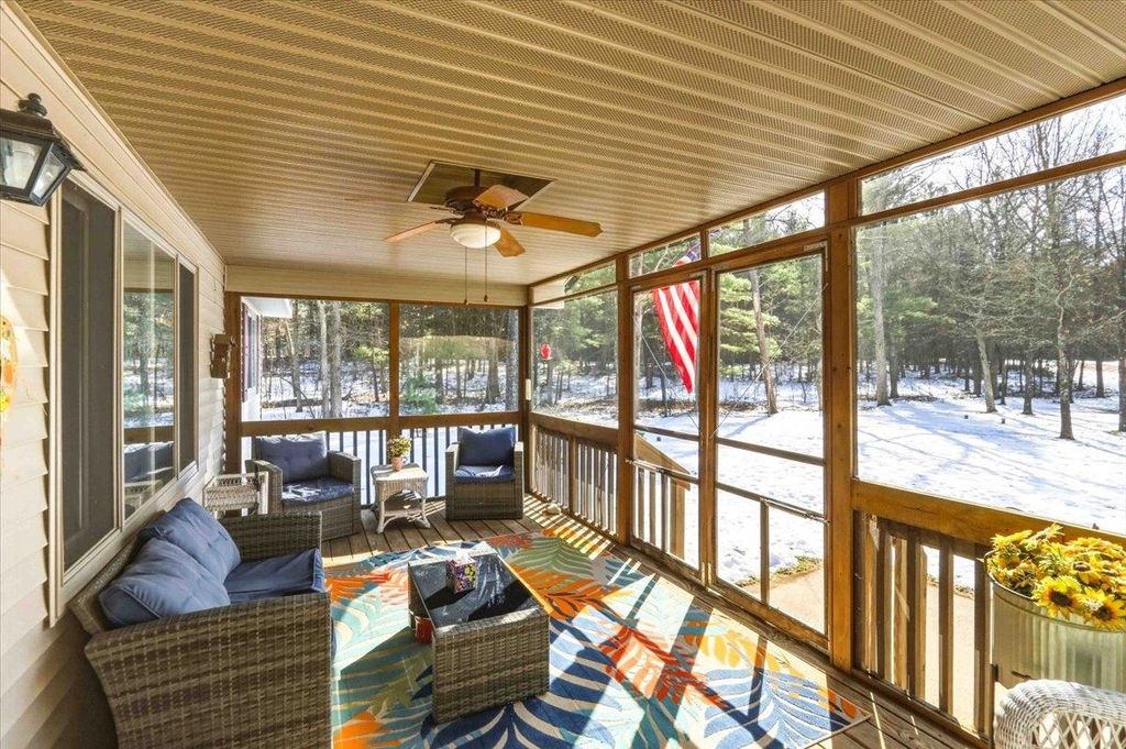Central Wisconsin Getaway! This very well-maintained Lake Arrowhead property is a great find! Home sits on a .51 acre wooded lot that offers privacy, with a blacktop drive. Walk to the lake on surrounding greenspace or a short walk via the road! Two bedroom, two bath home allows an up-north vibe. Enjoy the comfort of cathedral knotty pine ceilings, hardwood floors, open concept living, and a stunning stone fireplace"”perfect for cozy winter nights. Other seasons, relax on the wrap-around deck or screen porch and watch the wildlife or enjoy making memories around the firepit. A full basement provides storage or future living space, egress windows, plumbed for another bath, workshop, and access to yard. 24x24 attached garage and yard shed for all your gear. Has an inground sprinkler system plus a 3 BR septic system. The Town of Rome is a recreational haven with golf, lakes, trails, and more! Don't miss out!