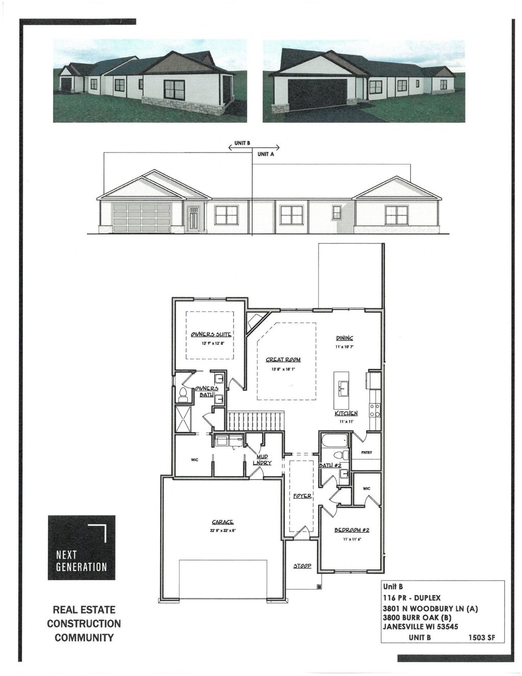 Estimated Completion August 2026. This stand out thoughtfully designed 2-bedroom, 2-bath home features zero-step access from the finished 2-car garage, making everyday living effortless. The bright, open layout is highlighted by tray-ceiling detail, a corner gas fireplace, and white finishes throughout. The kitchen is stylish with 2-tone cabinets, quartz countertops, stainless appliances, a generous center island, soft-close cabinetry, and an oversized corner pantry. A main-level laundry and mudroom adds convenience right where you need it. The primary suite offers tray ceiling accents, walk-in closet, and an en suite bath featuring a double vanity and walk-in shower. Downstairs, the lower level is insulated, studded, and prepped for a future bathroom, with an egress window ready for an additional bedroom or flex space. Unit B, lot #116 Prairie Corner **Photos of Similar Model - Ask Agent for Details**