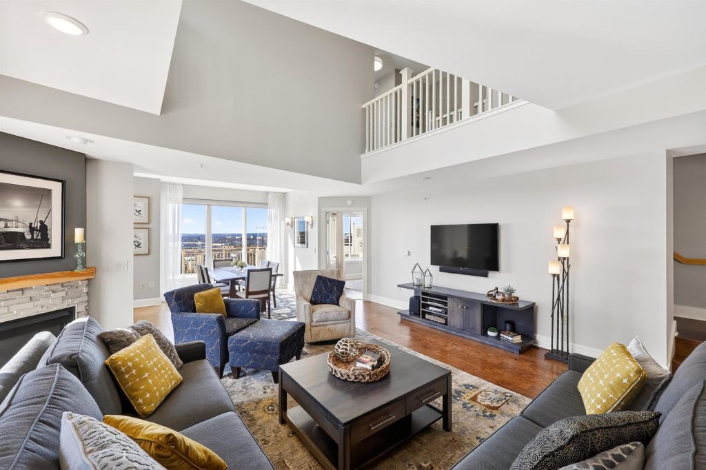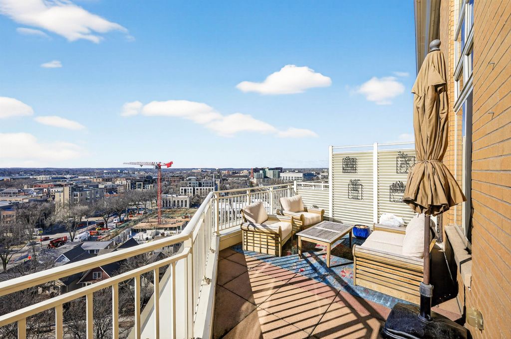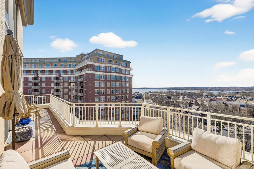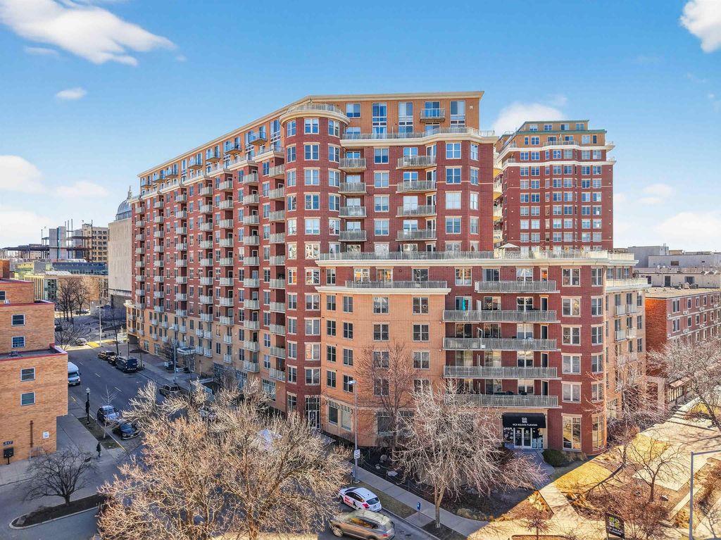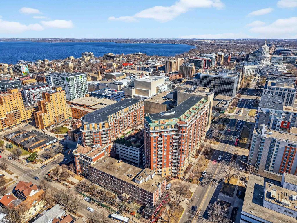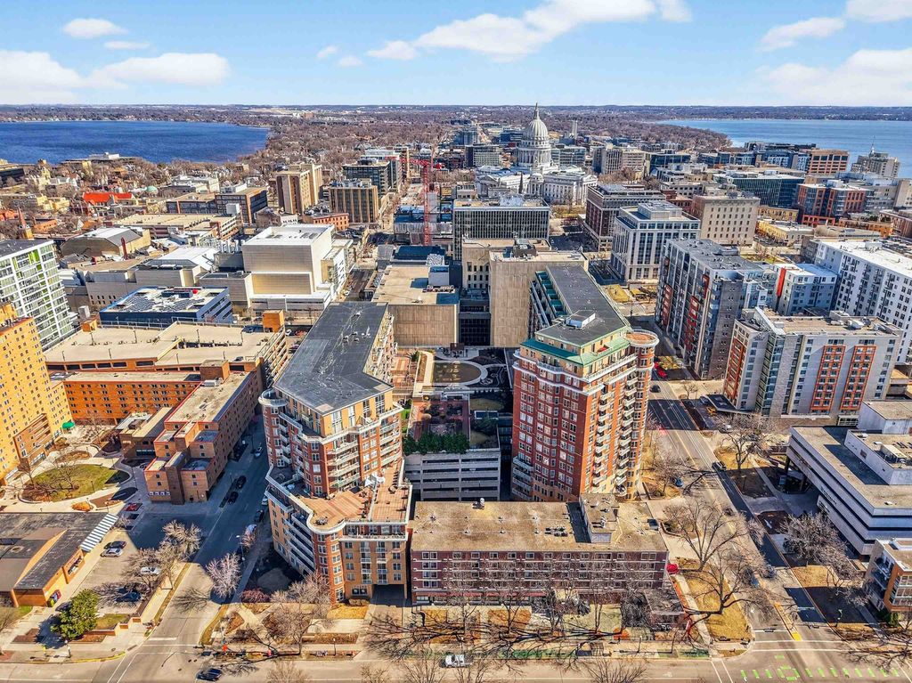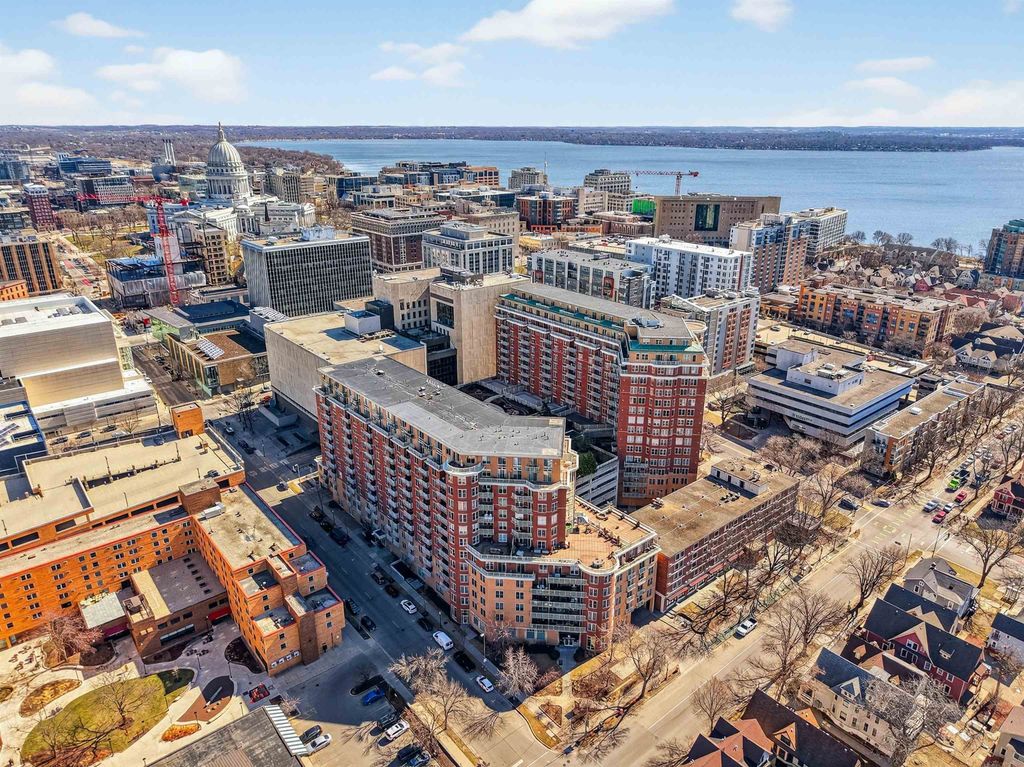 Don't miss this rare and stunning two-level corner penthouse condo in the heart of Madison. 4 bedrooms, 3 full baths, and almost 2,800 square feet of elegant living space. Courtyard and Lake Monona views from a generous wrap-around deck. Natural stone countertops and backsplash in the contemporary chef's kitchen with GE Monogram SS appliances. Engineered hardwood floors throughout. Vaulted ceiling and gas fireplace in the spacious living room. Cozy upper-level den space. Main level living is possible with one bedroom and a full bath. Two parking spaces and a large storage unit. On-site property management in one of Madison's premier condo buildings.