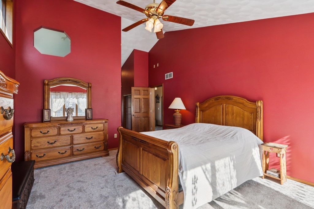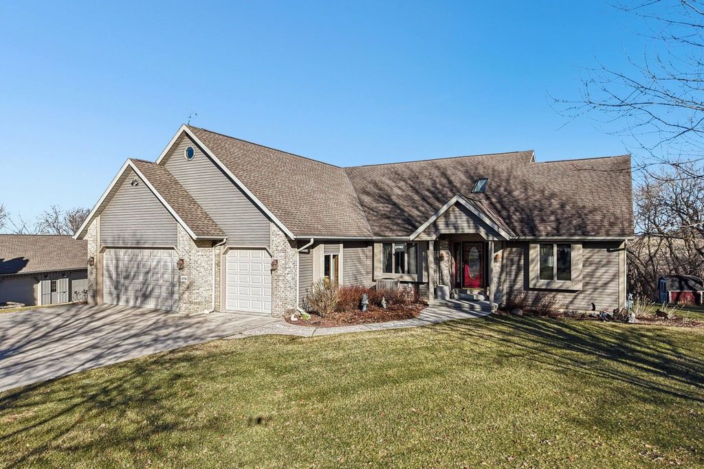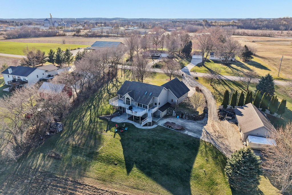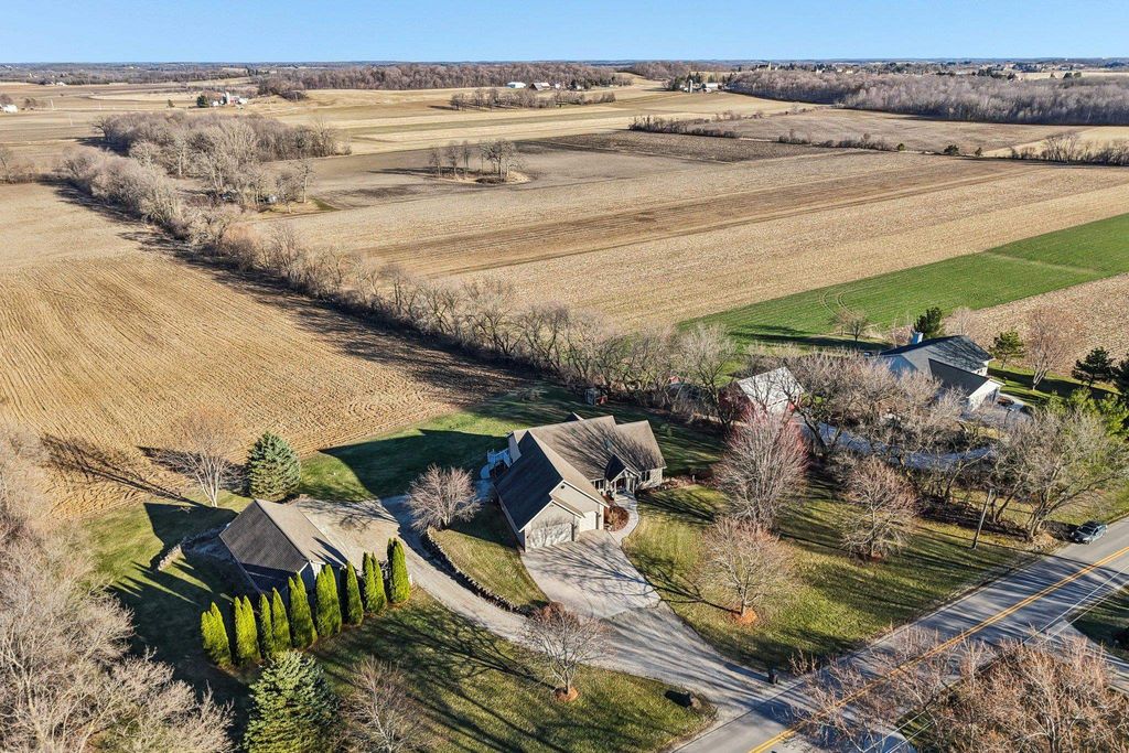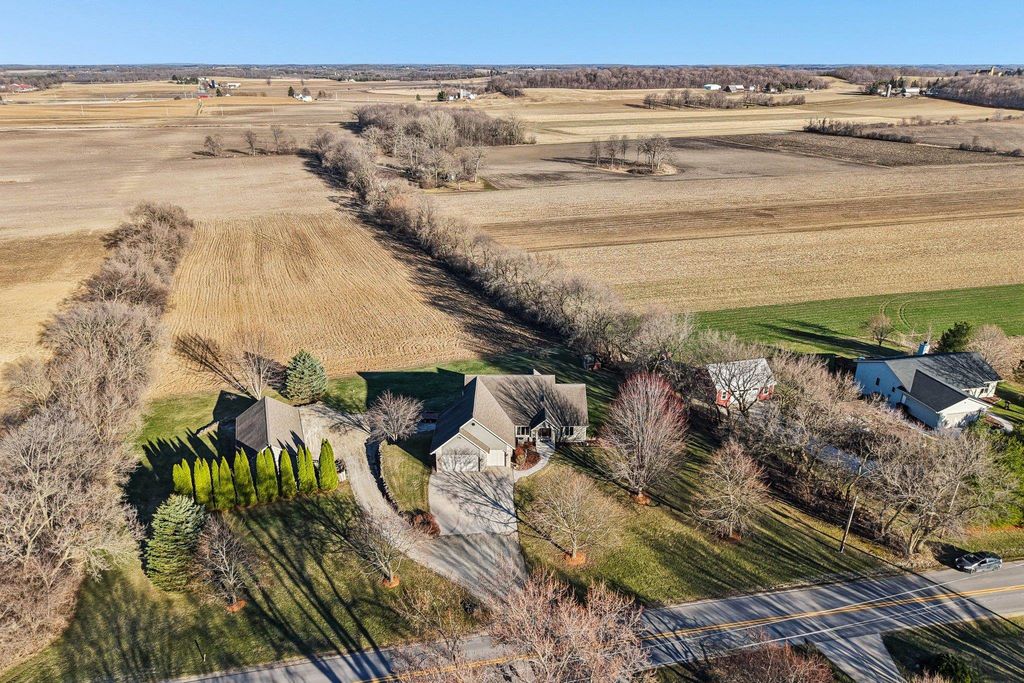 Thoughtfully designed and built with care, this one-of-a-kind home blends purpose, functionality, and peaceful country living. Set on 10 acres, the layout offers flexibility, including an office that could be converted into a 4th bedroom. Designed with car enthusiasts in mind, the property features an impressive 5-car upper garage and 1.5-car lower garage, both with 220V, plus a 1,000 sq ft Morton pole shed with power! 8 acres are currently leased for farming, alongside Concord grapevines and an asparagus patch. The east-facing sunroom offers beautiful sunrise views, while large windows, skylights, and vaulted 16-ft ceilings create a bright, open feel. The primary suite includes deck access, reinforced for a future hot tub! Recent updates include new carpet in some rooms and a new roof on the lower garage. This property truly stands out, come see for yourself