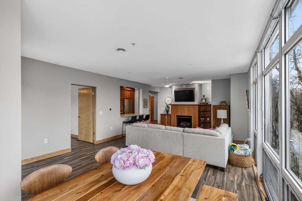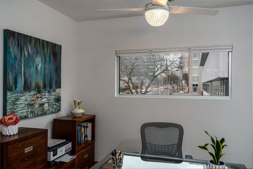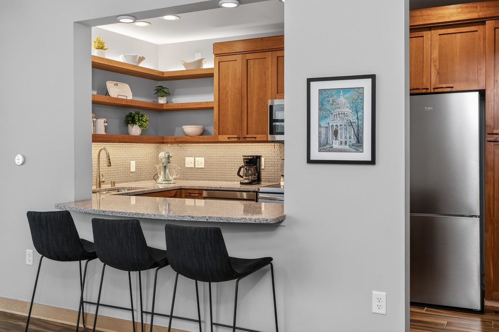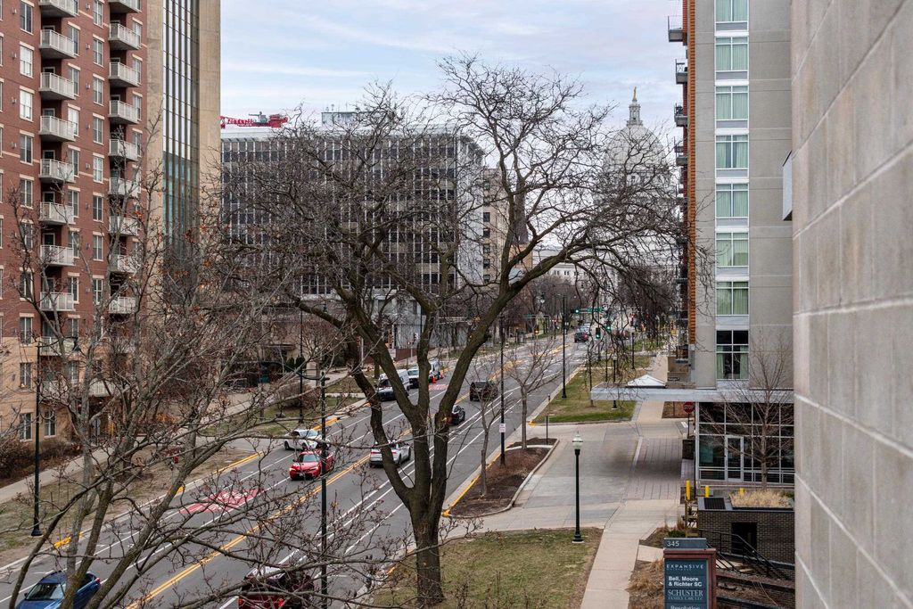 Top-floor corner condo located just four blocks from the Capitol Square sets the tone for this spacious two-bedroom plus a large office condo. Expansive floor-to-ceiling windows draw in natural light and frame Capitol views enjoyed from both the office and a private balcony. The kitchen is well-appointed with new stainless steel appliances, cherry cabinetry, solid surface counters, and breakfast bar, opening to a living space anchored by a gas fireplace and custom built-ins.. Many updates including: bathrooms remodeled in 2021, flooring, interior painted, window blinds, water heater, washer, dryer all new in 2021, HVAC-2023, sliding glass door in primary bedroom-2025. Unit includes a dedicated parking space(Space O) and large deeded storage unit, pairing everyday ease with a walkable downtown lifestyle. Condo fees=$568 + $75 for parking with a total condo fee of $643/month.