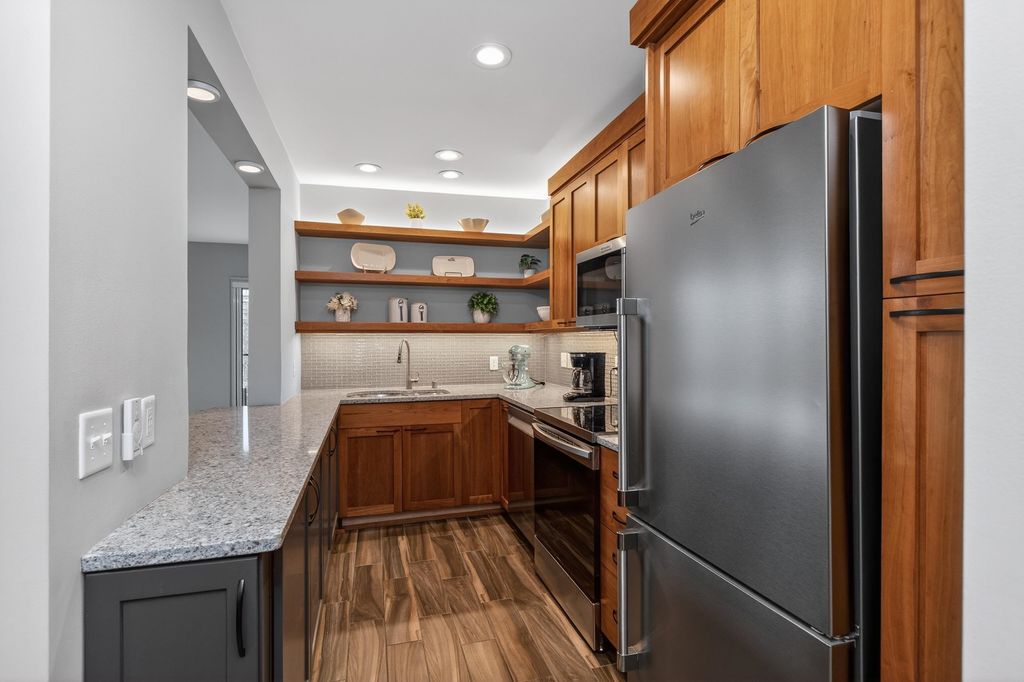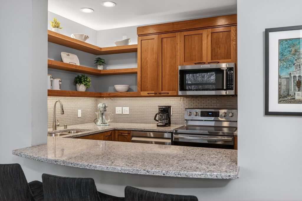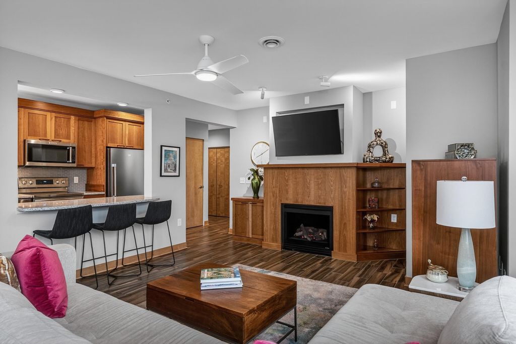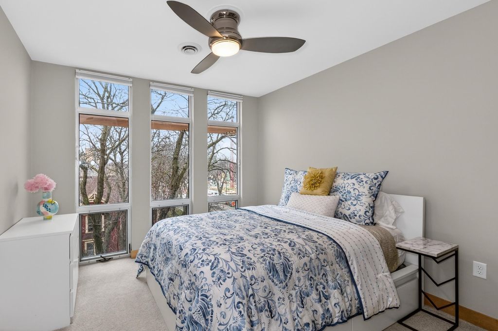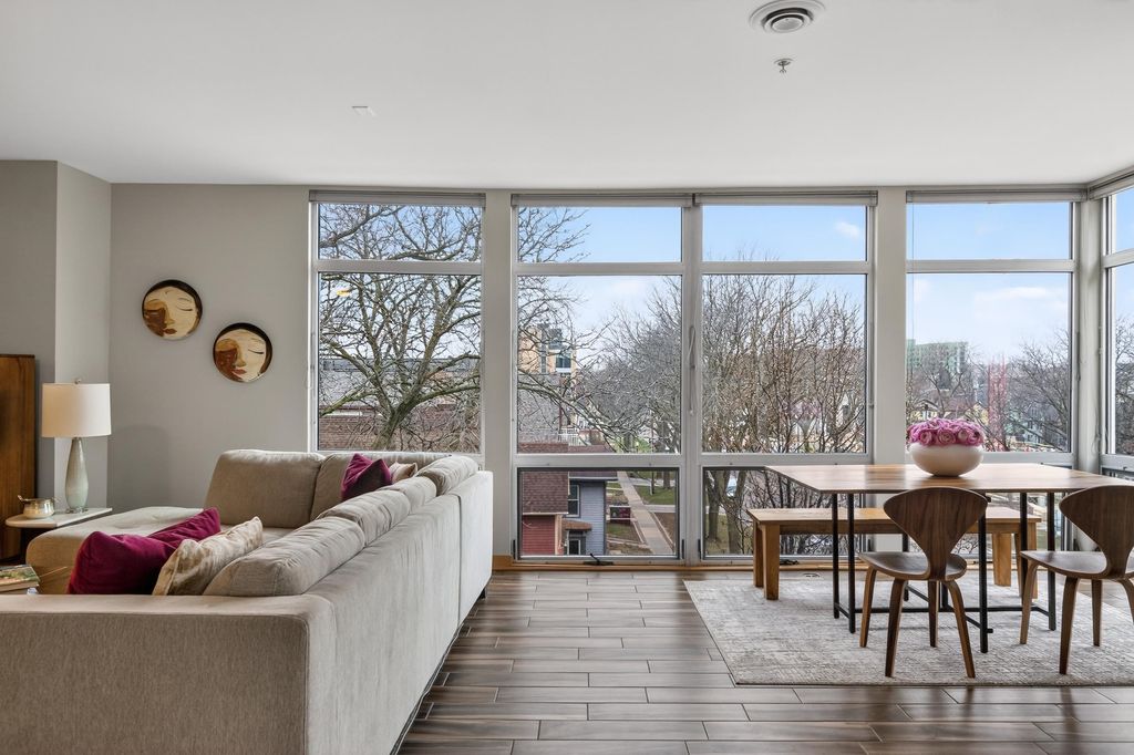 Top-floor corner condo located just four blocks from the Capitol Square sets the tone for this spacious two-bedroom plus a large office condo. Expansive floor-to-ceiling windows draw in natural light and frame Capitol views enjoyed from both the office and a private balcony. The kitchen is well-appointed with new stainless steel appliances, cherry cabinetry, solid surface counters, and breakfast bar, opening to a living space anchored by a gas fireplace and custom built-ins.. Many updates including: bathrooms remodeled in 2021, flooring, interior painted, window blinds, water heater, washer, dryer all new in 2021, HVAC-2023, sliding glass door in primary bedroom-2025. Unit includes a dedicated parking space(Space O) and large deeded storage unit, pairing everyday ease with a walkable downtown lifestyle. Condo fees=$568 + $75 for parking with a total condo fee of $643/month.