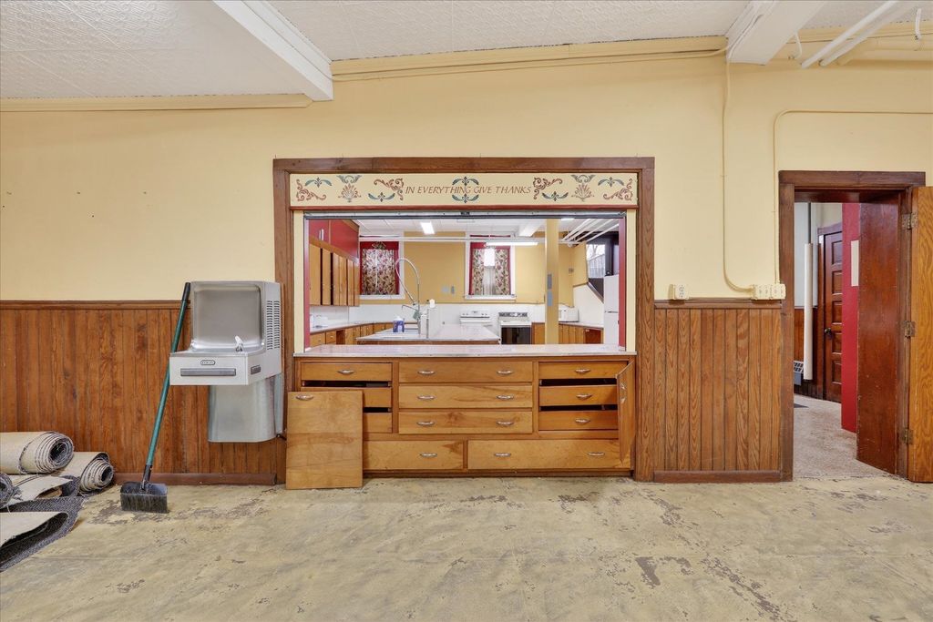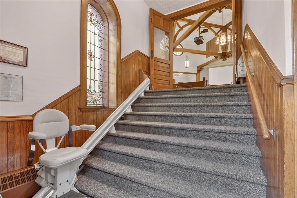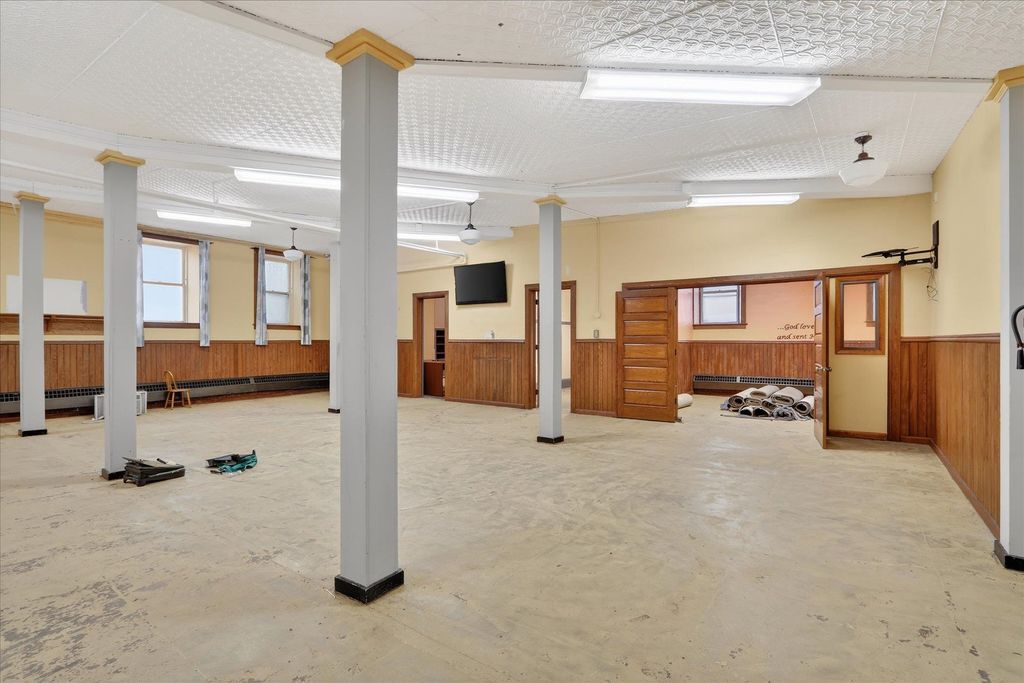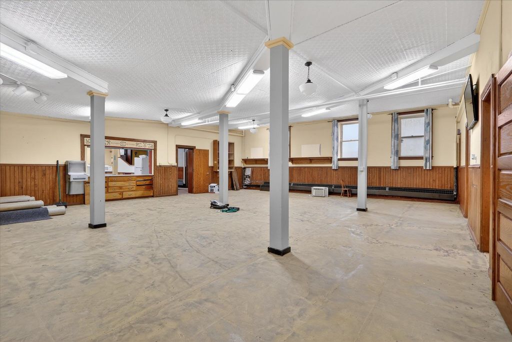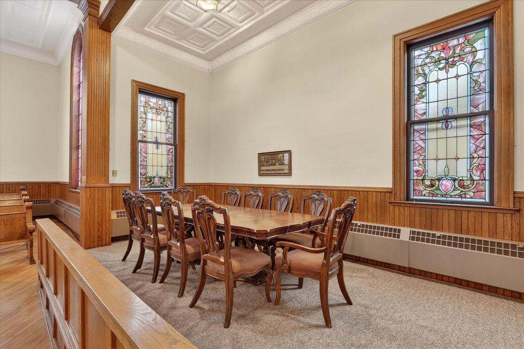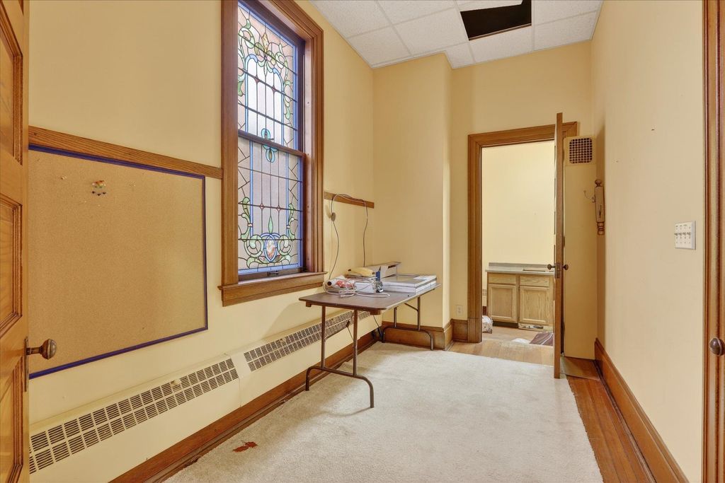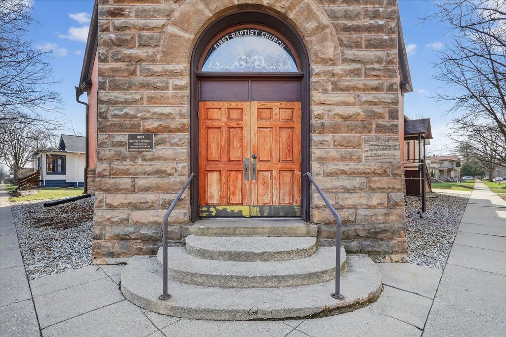 Historic opportunity in the heart of Evansville! This former church at 101 W Church St offers incredible character and endless potential. The main level features a stunning auditorium with soaring ceilings, intricate stained-glass windows, and original woodwork, plus a spacious multipurpose room with oak pocket doors and additional flexible rooms ideal for offices, studio space, or storage. The lower level includes a large kitchen, gathering area, multiple rooms, and two half baths. Located in the Evansville Historic District, this one-of-a-kind property is ready for its next chapter. Property has never been residential. Buyer are solely responsible for conducting their own due diligence in regards to remodel or zoning changes Measurements approximate.