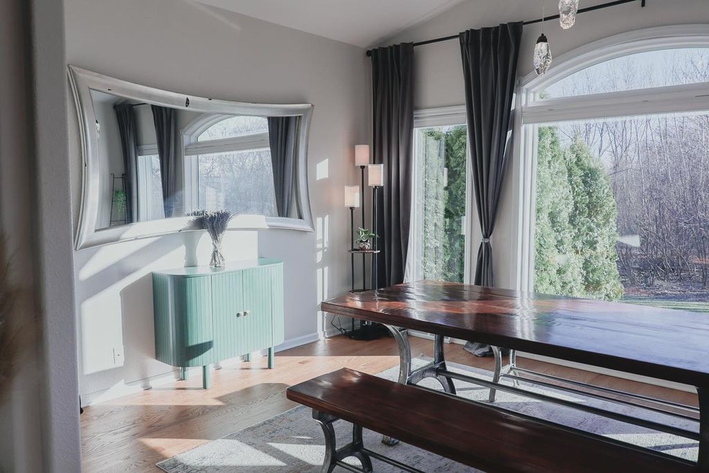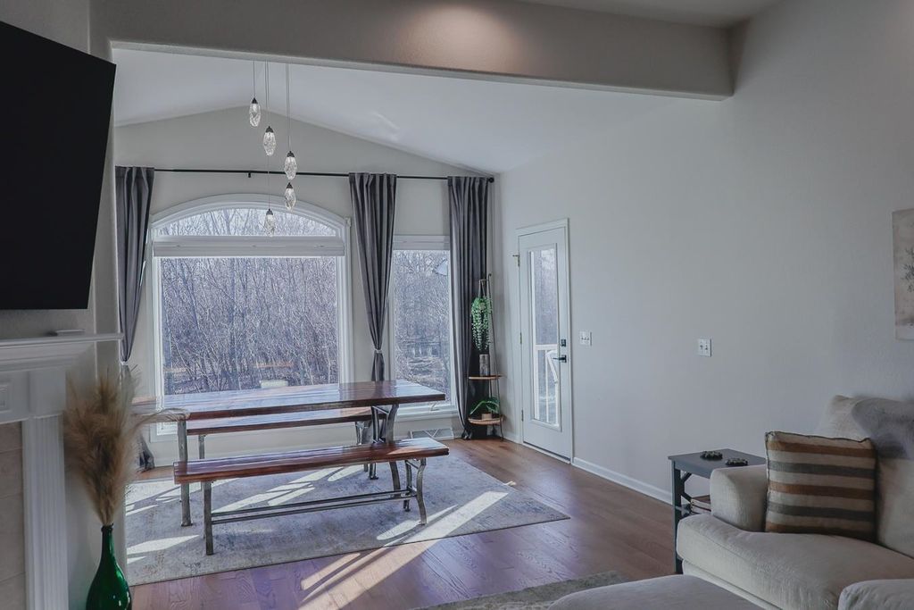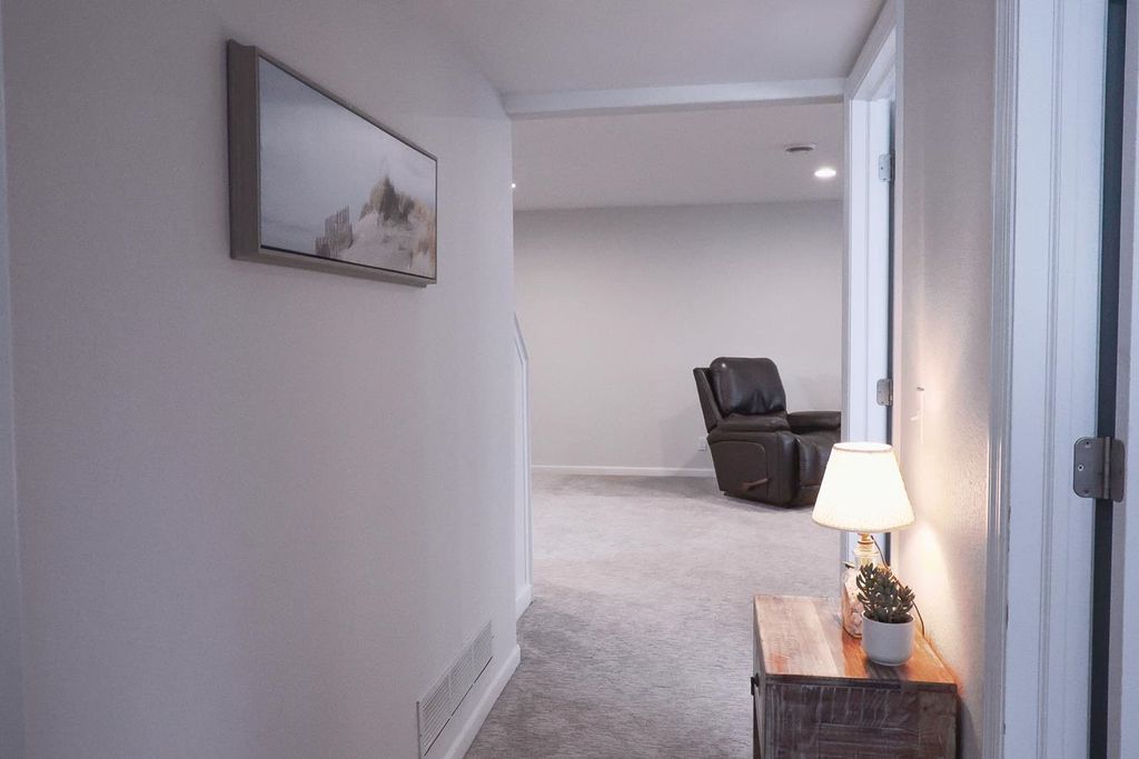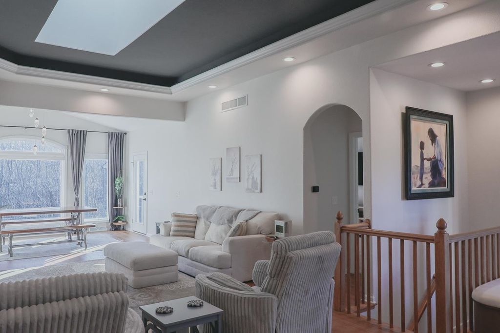 The kitchen is a standout with quartz countertops, stainless steel appliances, and modern finishes, while the bathrooms boast updated solid surface countertops. The dining area adds a touch of elegance with a skylight and motorized blinds. 2025-New Furnace, Central Air and Water Heat Enjoy the ease of main floor laundry and retreat to the finished lower level, complete with fresh carpeting and ample space for entertaining, hobbies, or guests. Walk out to an upper and lower patio overlooking a beautiful backyard with amazing views!