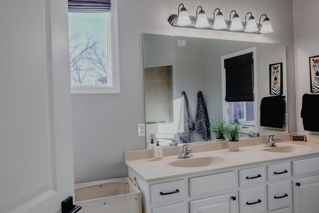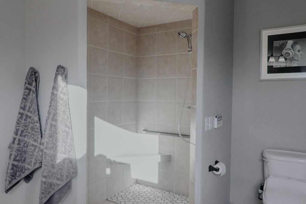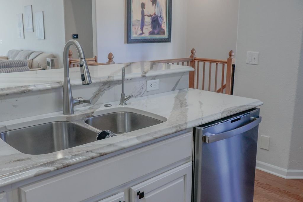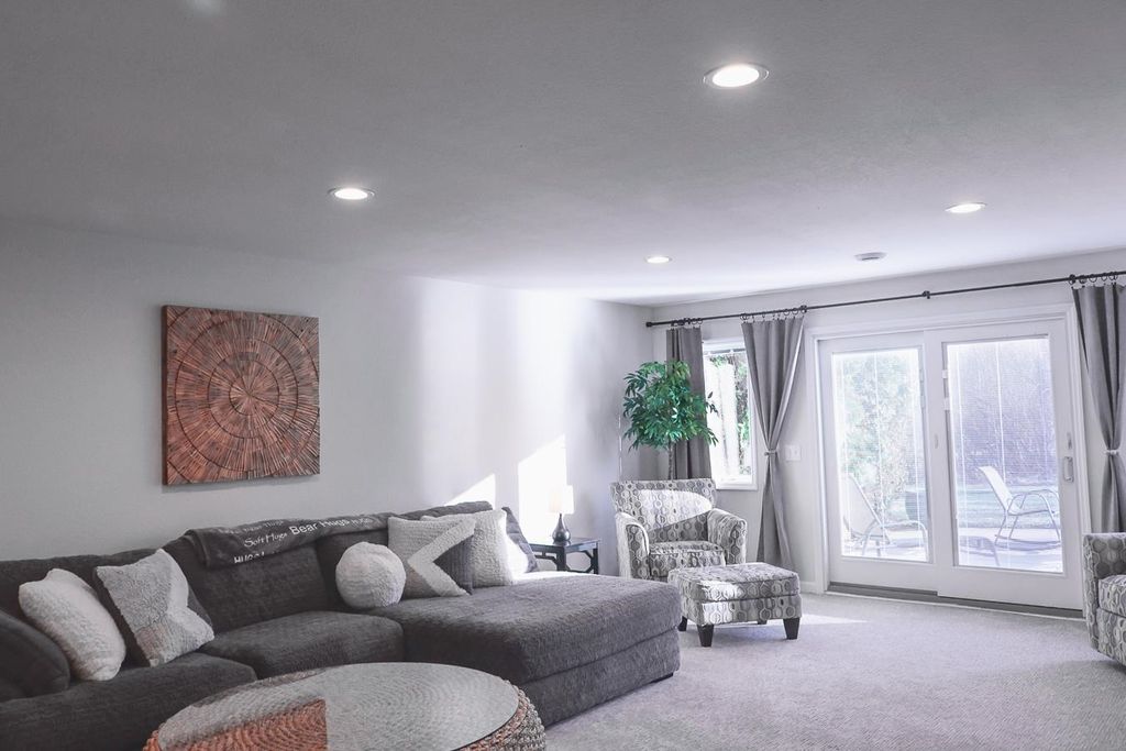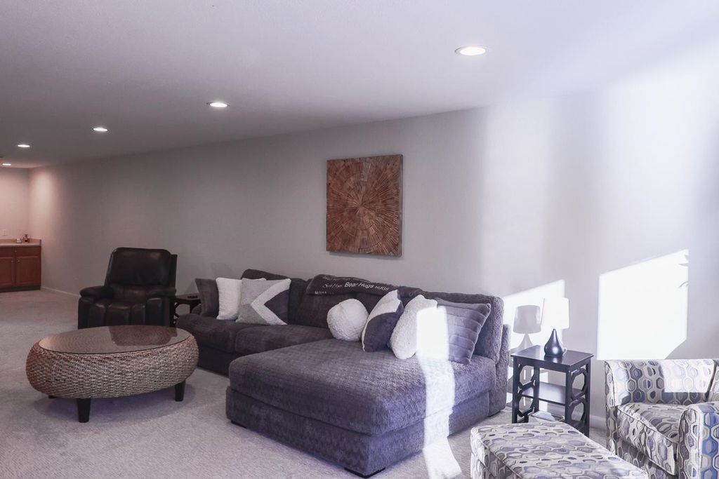 The kitchen is a standout with quartz countertops, stainless steel appliances, and modern finishes, while the bathrooms boast updated solid surface countertops. The dining area adds a touch of elegance with a skylight and motorized blinds. 2025-New Furnace, Central Air and Water Heat Enjoy the ease of main floor laundry and retreat to the finished lower level, complete with fresh carpeting and ample space for entertaining, hobbies, or guests. Walk out to an upper and lower patio overlooking a beautiful backyard with amazing views!