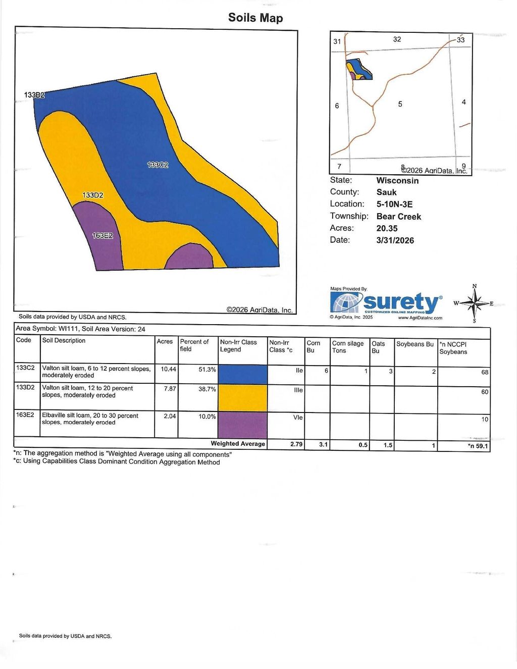 Discover the perfect opportunity with this 20± acre parcel of vacant land located in Bear Creek Township in Sauk County. This all-tillable property offers a beautiful, open landscape with multiple potential buildable sites, making it ideal for your future home, hobby farm, or investment. The fertile ground is currently well-suited for agricultural use, providing income potential or a great start for your own farming operation. With gently rolling terrain and wide-open views of the surrounding countryside, this property combines productivity with peaceful rural living. Whether you're looking to build, farm, or invest, this versatile acreage offers endless possibilities in a desirable country setting. Land is leased till end of 2026. More Land & Buildings available.