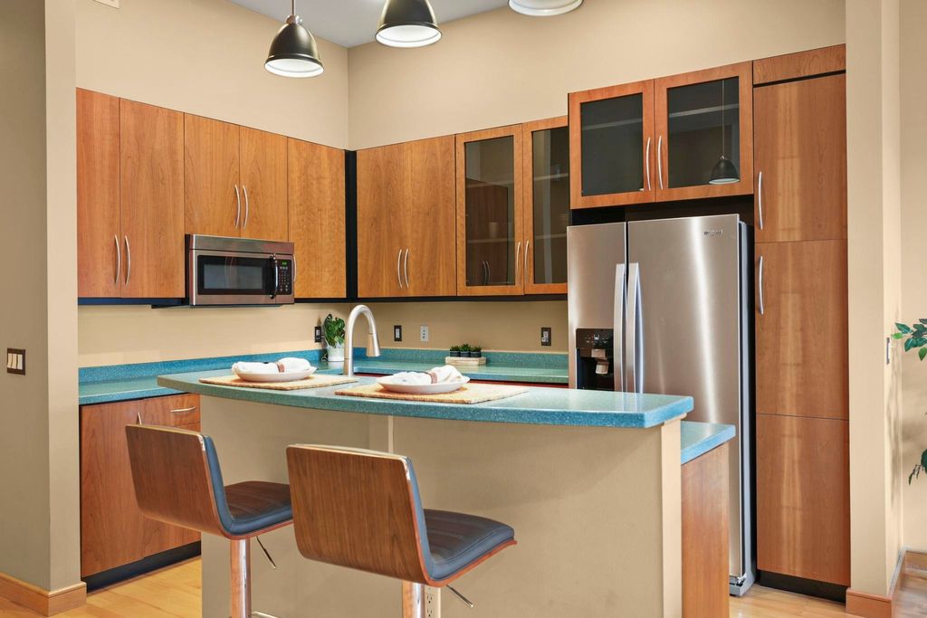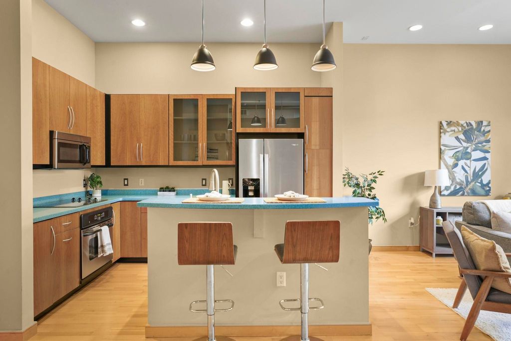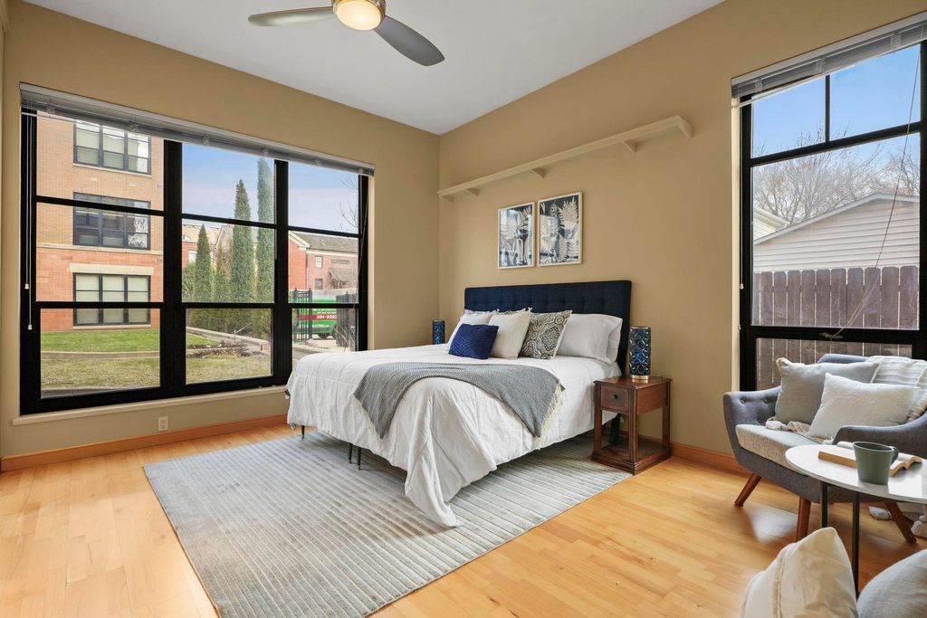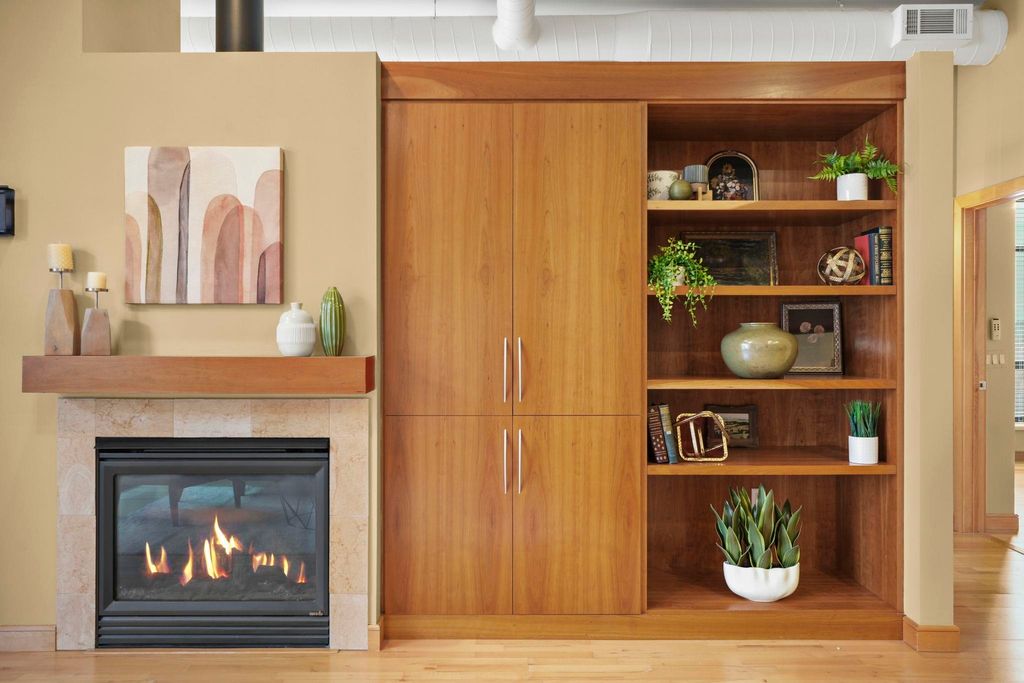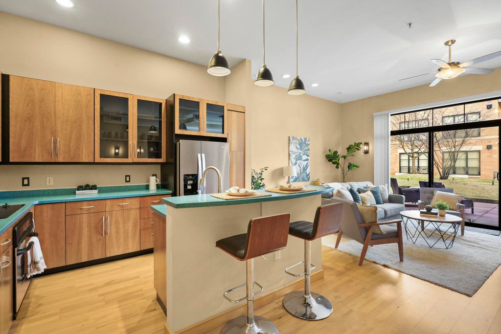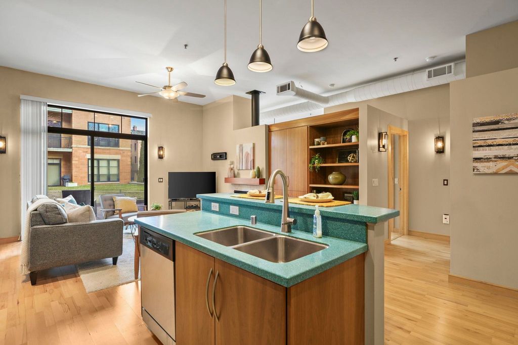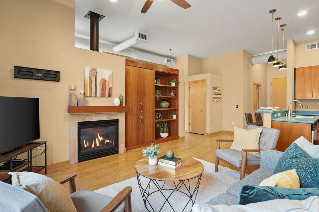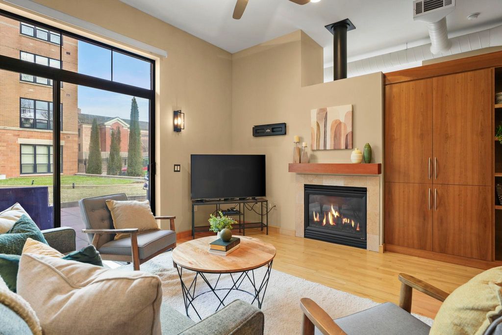 Prime location with unbeatable access - walk or bike to campus, the Capitol, Brittingham Bay on Lake Monona, plus countless restaurants & shops. This bright and inviting true 2-bedroom condo welcomes you with soaring 11' ceilings and abundant natural light throughout. Stylish kitchen features a breakfast island & opens seamlessly to the spacious great room with a cozy fireplace - perfect for everyday living or entertaining. Step outside to your large private patio overlooking a lovely green space, ideal for relaxing or gathering with friends. Unwind in the comfortable primary suite, and enjoy a quiet evening with a good book. The 2nd bedroom, filled with natural light, offers flexibility as a guest room or home office. In unit laundry room with ample built-in storage. A separate 1st floor storage unit and one underground parking space are included. A wonderful place to call home!