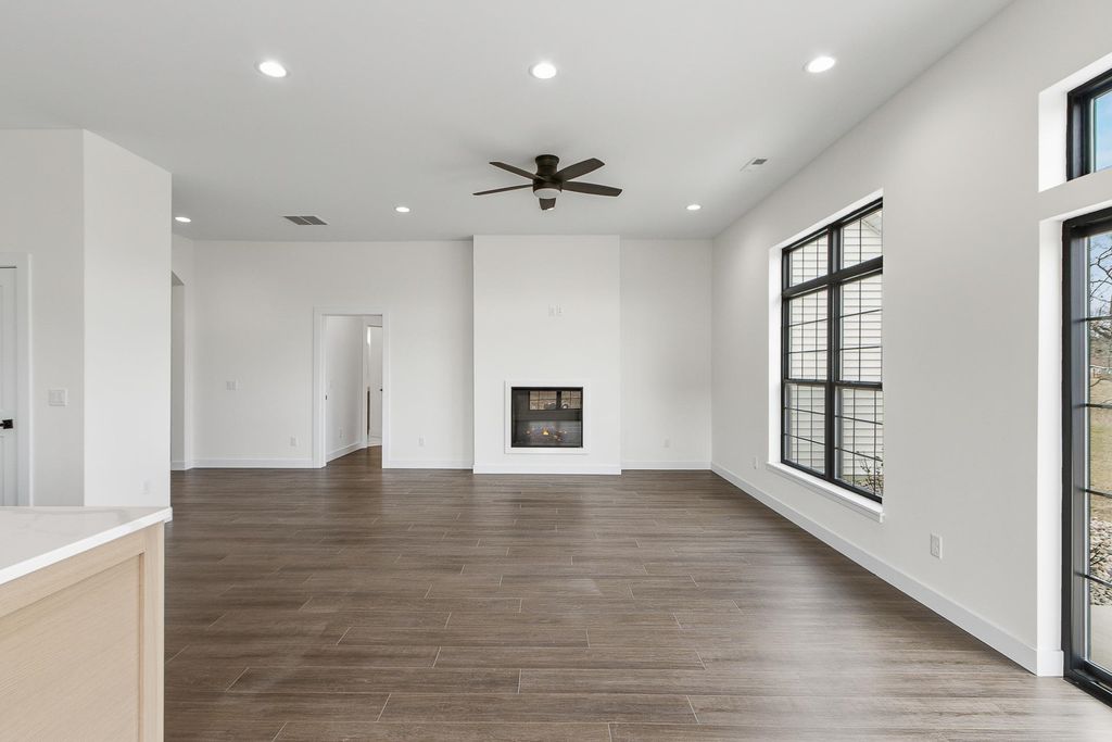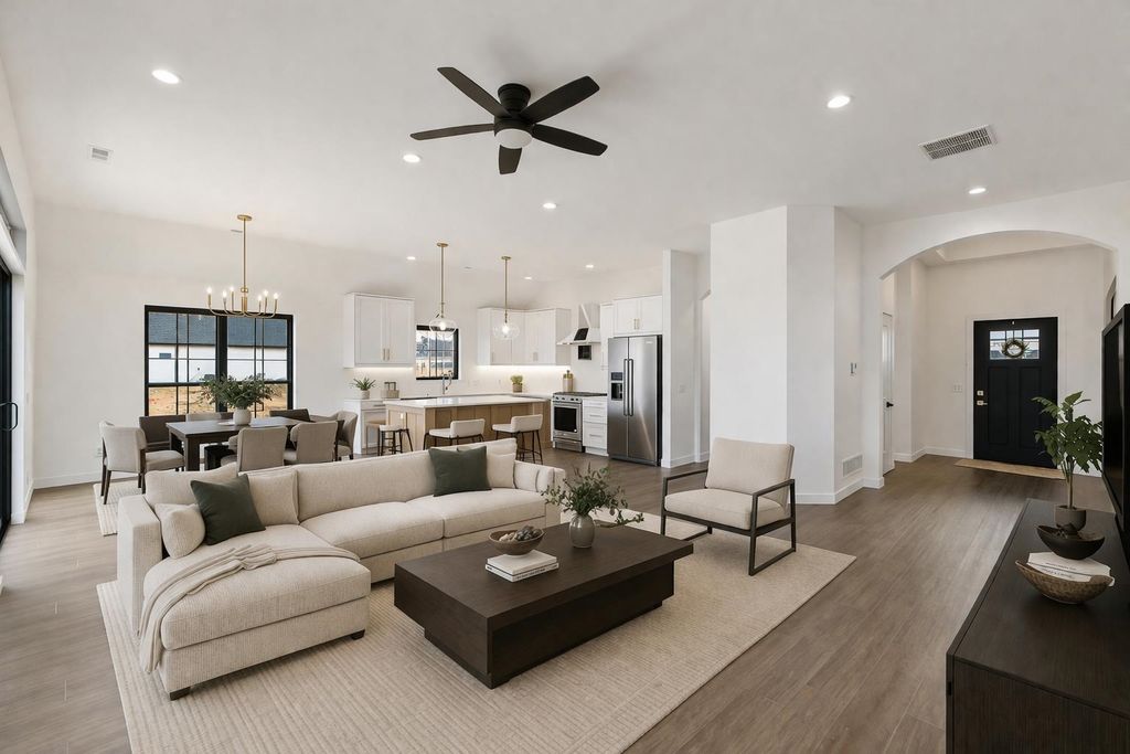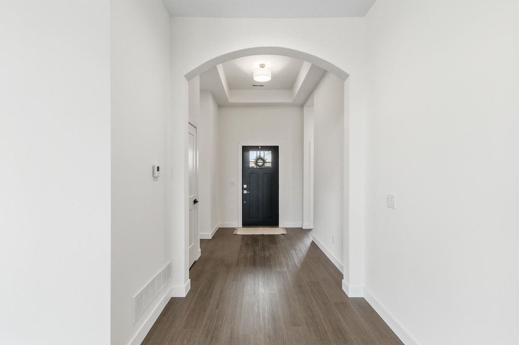 Spacious, light-filled, true single-level living with a refined, open-concept design. Soaring 10-foot ceilings and elegant arched openings create a striking first impression, while the seamless flow between the living, dining, and kitchen areas delivers an ideal setting for both everyday living and entertaining. A sleek, low-maintenance fireplace anchors the space with warmth and sophistication. The kitchen is designed to impress with granite countertops, upscale finishes, and a clean, modern aesthetic that carries throughout the home. Every detail has been thoughtfully selected to deliver a high-end, cohesive feel. The primary suite offers a private retreat with dual walk-in closets and a spacious en-suite bath featuring double vanities and elevated finishes. Low-maintenance living, elevated design, and quality craftsmanship throughout make this a standout home sure to impress!
