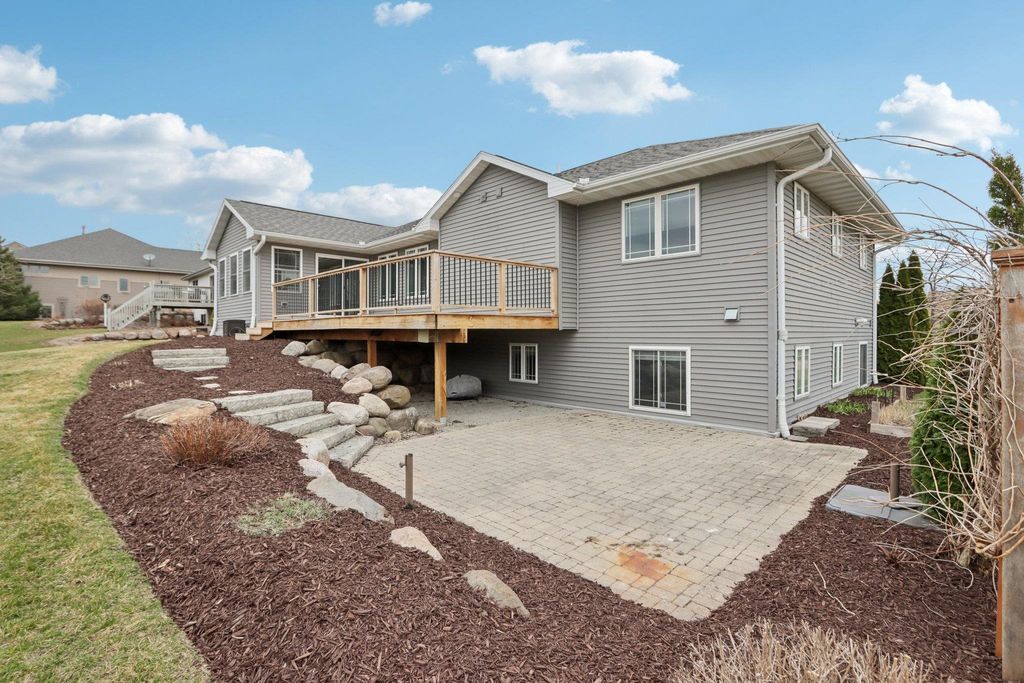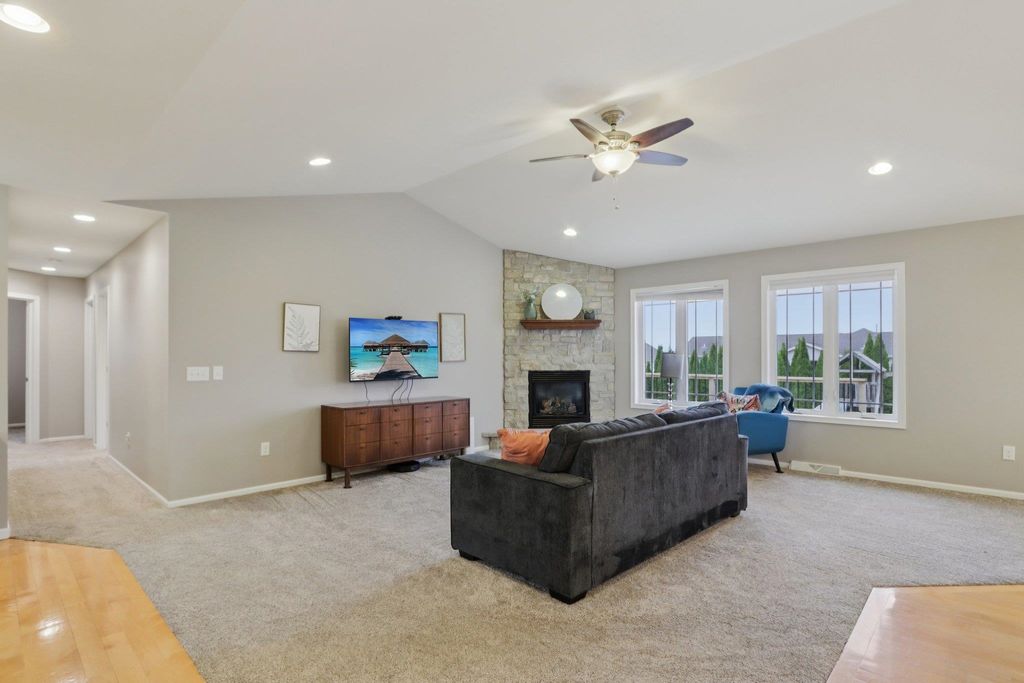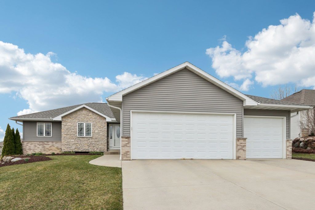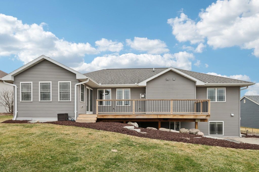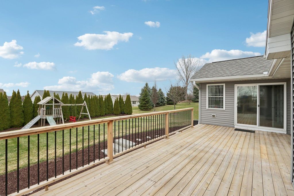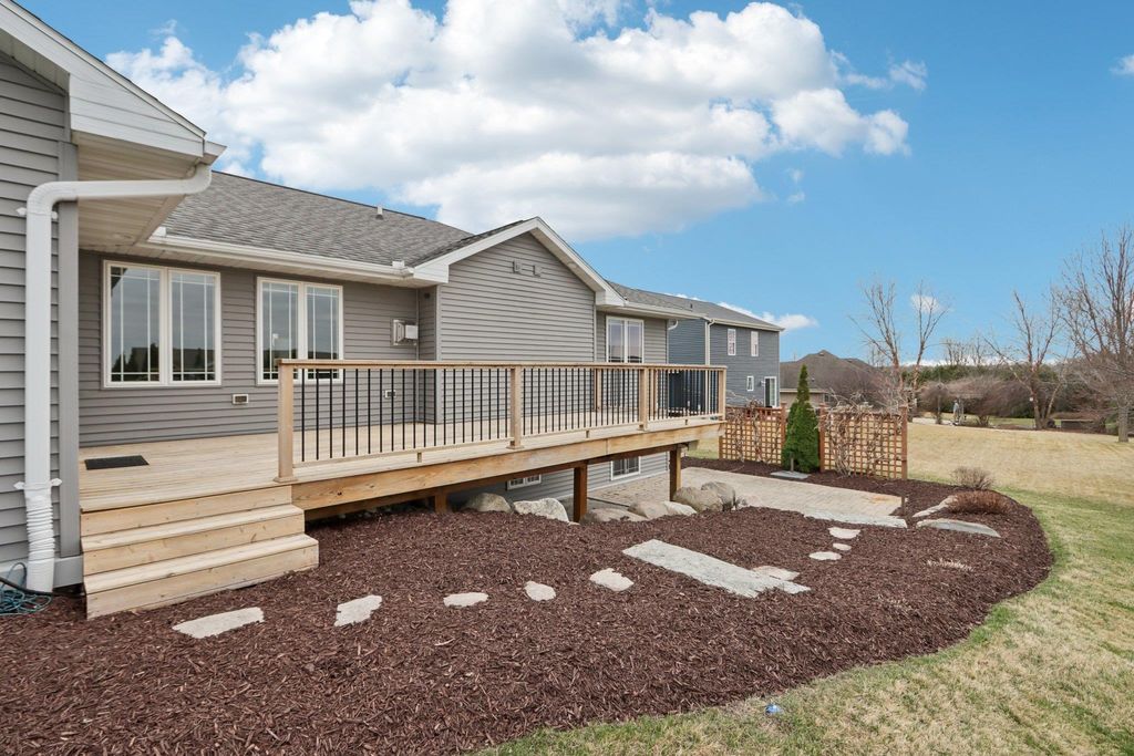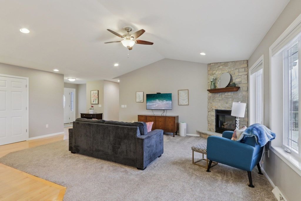 Spacious and beautifully designed 5-bedroom, 3-bath ranch home with an open concept layout and finished lower level. The inviting living room features a gas fireplace, while the kitchen offers cherry cabinets, granite countertops, and a breakfast bar. Enjoy the convenience of main-floor laundry and a 3-car garage. The beautiful, sunny 4-season room opens to the deck and leads to the patio and private backyard, perfect for relaxing or entertaining. The exposed lower level includes a huge rec room with a wet bar, two additional bedrooms, and a full bath. You'll love the location of this move-in-ready home, tucked on a quiet cul-de-sac near parks and schools.