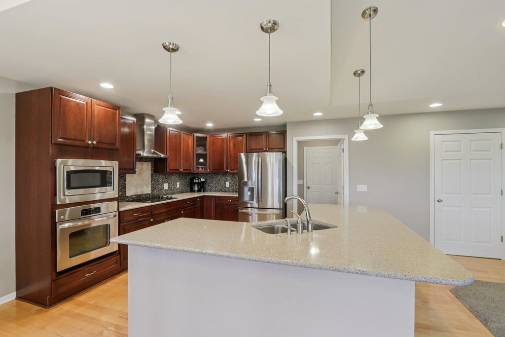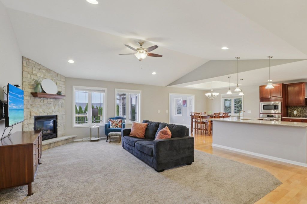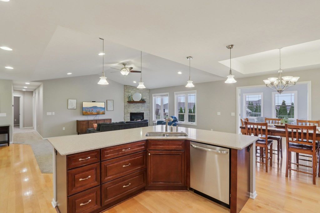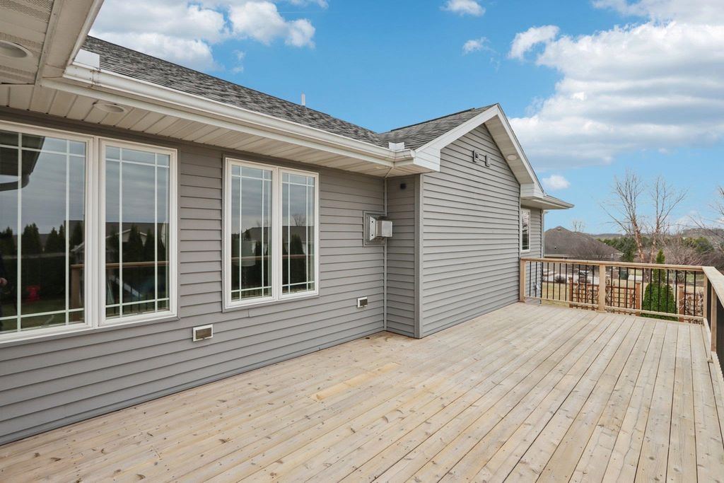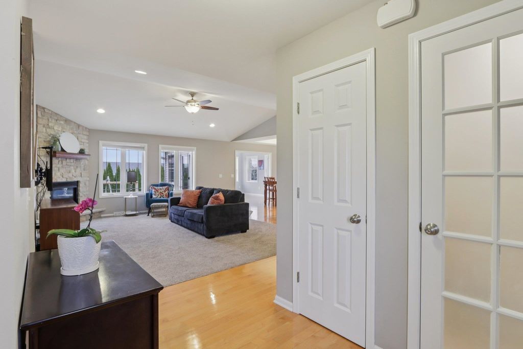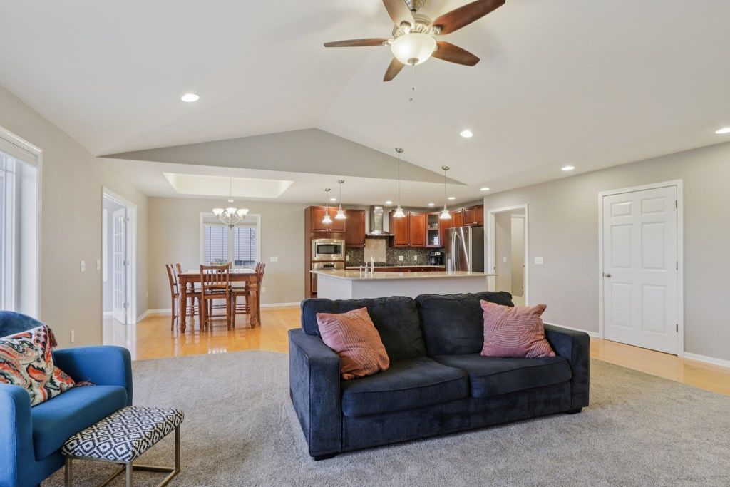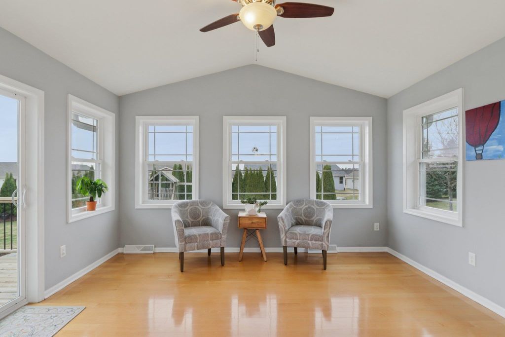 Spacious and beautifully designed 5-bedroom, 3-bath ranch home with an open concept layout and finished lower level. The inviting living room features a gas fireplace, while the kitchen offers cherry cabinets, granite countertops, and a breakfast bar. Enjoy the convenience of main-floor laundry and a 3-car garage. The beautiful, sunny 4-season room opens to the deck and leads to the patio and private backyard, perfect for relaxing or entertaining. The exposed lower level includes a huge rec room with a wet bar, two additional bedrooms, and a full bath. You'll love the location of this move-in-ready home, tucked on a quiet cul-de-sac near parks and schools.