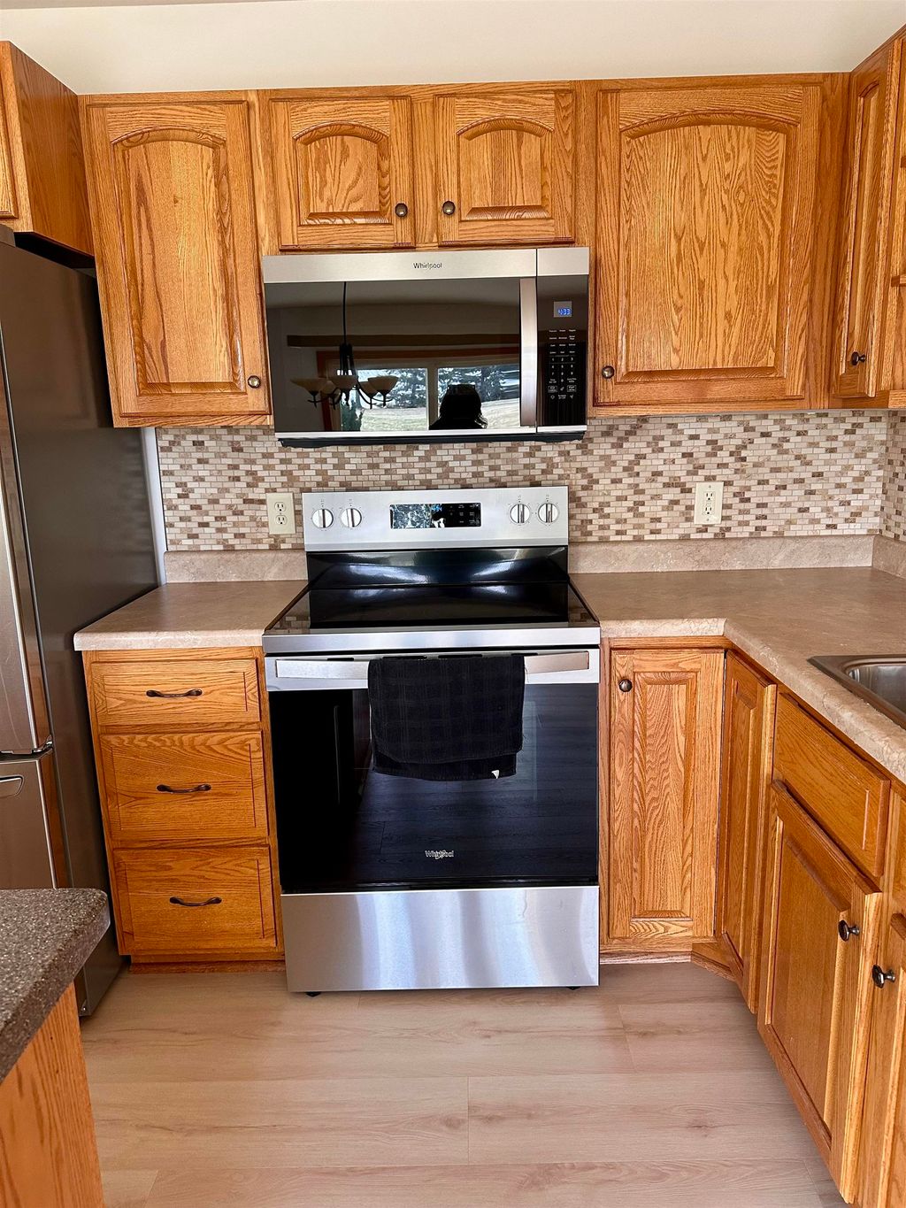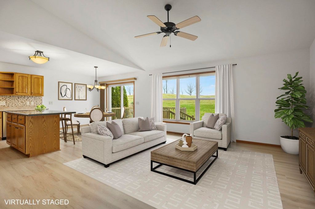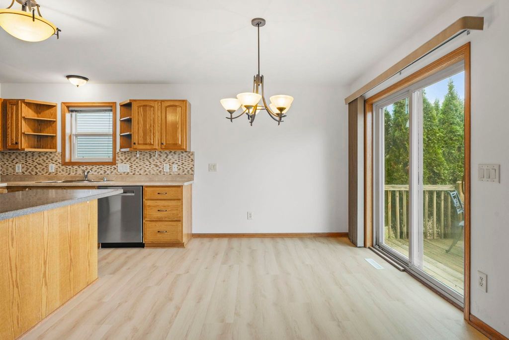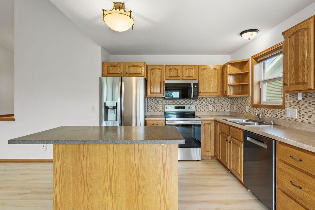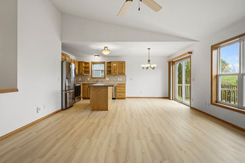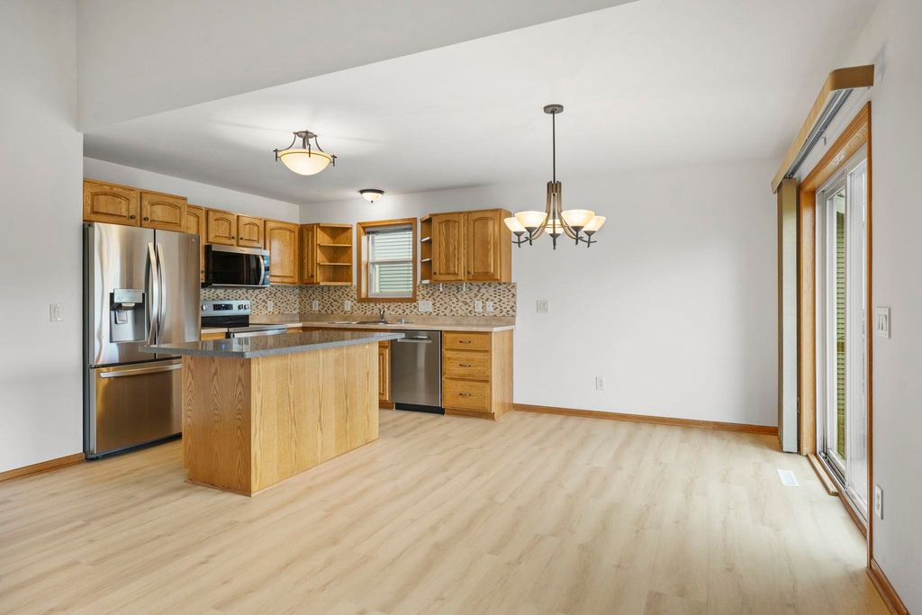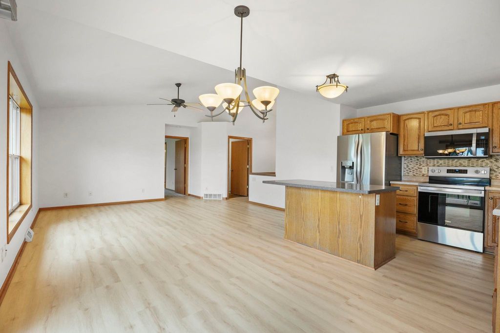 Turn the key and fall in love! This fabulous ranch delivers an open floor plan with vaulted ceilings and fresh, modern updates throughout. The main level features brand new LVP flooring and carpet (2026) and freshly painted. The kitchen is ready to impress with a brand new range/oven and microwave (2026), plus a newer refrigerator and dishwasher. The island is where everyone will end up whether it's homework, appetizers or discussing the latest trends! Casual dining leads to the patio doors and a nice deck overlooking a lush, private backyard! The expansive lower-level rec room, additional bedroom, and full bath create the perfect space for guests, entertaining, or a private retreat. Washer/Dryer included & main floor laundry rm is a bonus! Tons of storage in this house! New Water Heater (2025) Huge 2 car garage. This modern, hard to find Ranch home is in a prime location close to parks, trails, schools, shopping, restaurants and Epic.This one checks all the boxes and more!