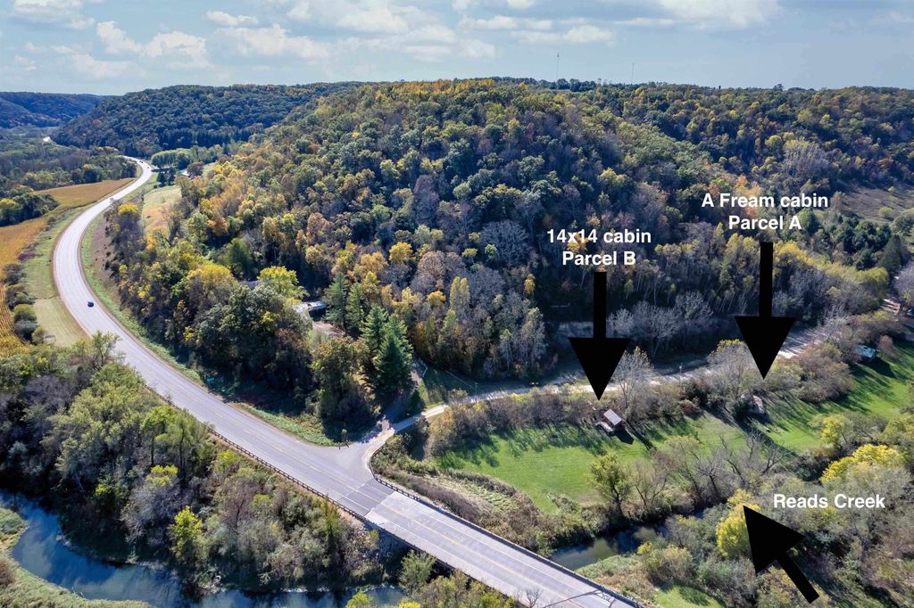 Escape to the Driftless with this charming 14x14 log cabin on almost a 2 acre lot, featuring 220 ft of frontage on the scenic Reads Creek. This lot offers a spacious yard, mature trees, Reads Creek just steps away, and a studio-style cabin provides space for sleeping, dining, and lounging. A 14x8 gabled outdoor kitchenette and an 8x22 wraparound deck for enjoying the peaceful setting. Includes electricity and access to a shared well. Approved holding tank with plans complete. Conveniently located near local favorites and just 12 minutes to Viroqua. Winterized Nov-April; usable as a dry cabin during that time.