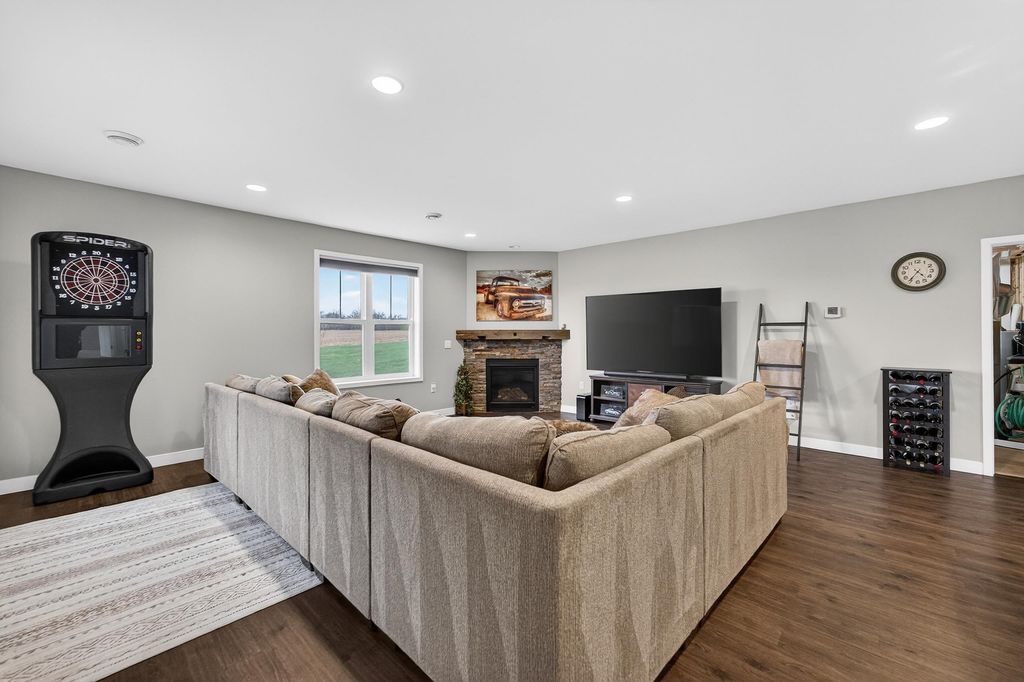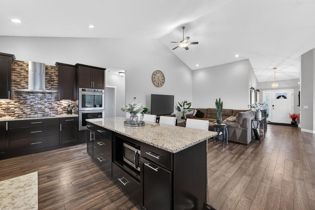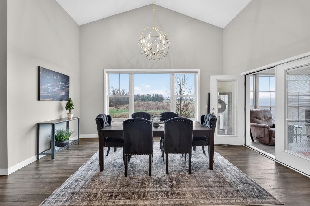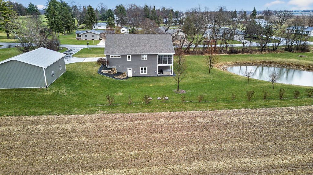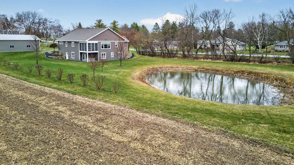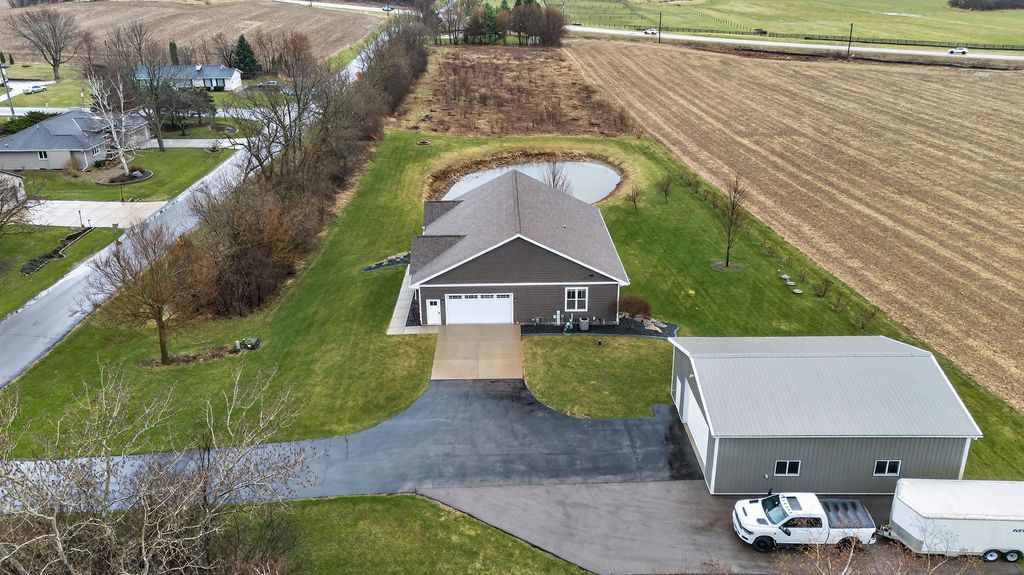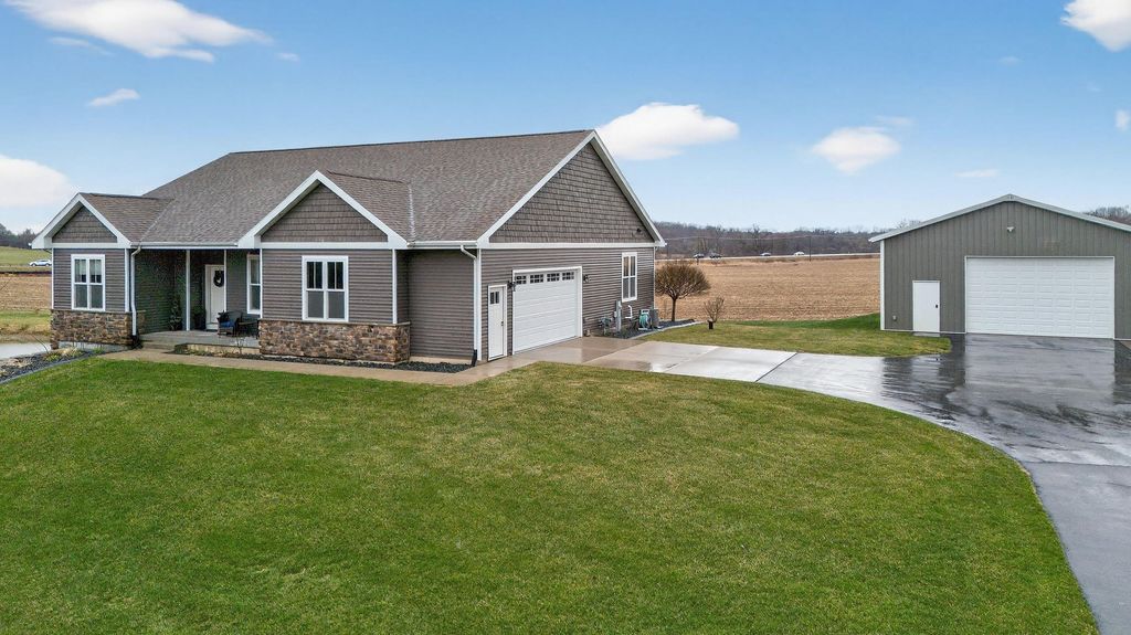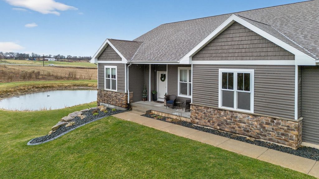 Show 4/15. Stunning ranch on 2.59 acres directly across from the Stoughton Country Club golf course! This 4-bedroom, 3-bath home offers over 3,300 sqft with an open-concept layout and 9' ceilings throughout. The main level features a bright living room with vaulted ceilings, a spacious kitchen with granite countertops, tile backsplash, and stainless steel appliances, plus a spacious primary suite with tray ceilings, dual vanity, walk-in shower, and large closet. The exposed walkout lower level is perfect for entertaining with a family room, gas fireplace, wet bar, additional bedrooms, and full bath. Enjoy outdoor living with a three-season porch, patio with hot tub, firepit area, and expansive yard. Additional highlights include a mudroom with main floor laundry and yard sprinkler system. Ample garage and driveway space includes an attached 2-car garage and a detached extra-deep 2-car garage with a dedicated workspace. Option to purchase fully furnished for a true turn-key opportunity!