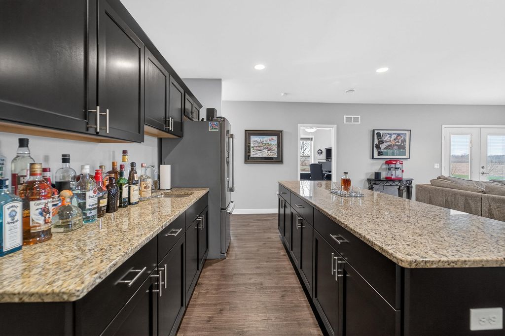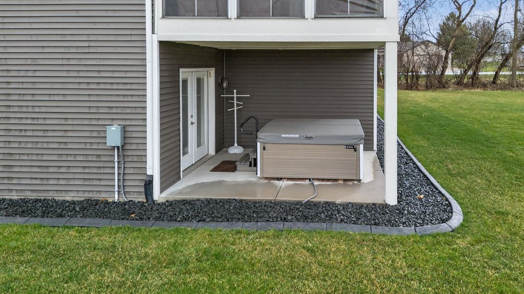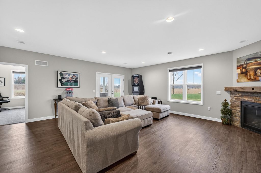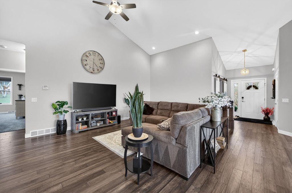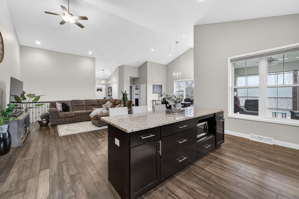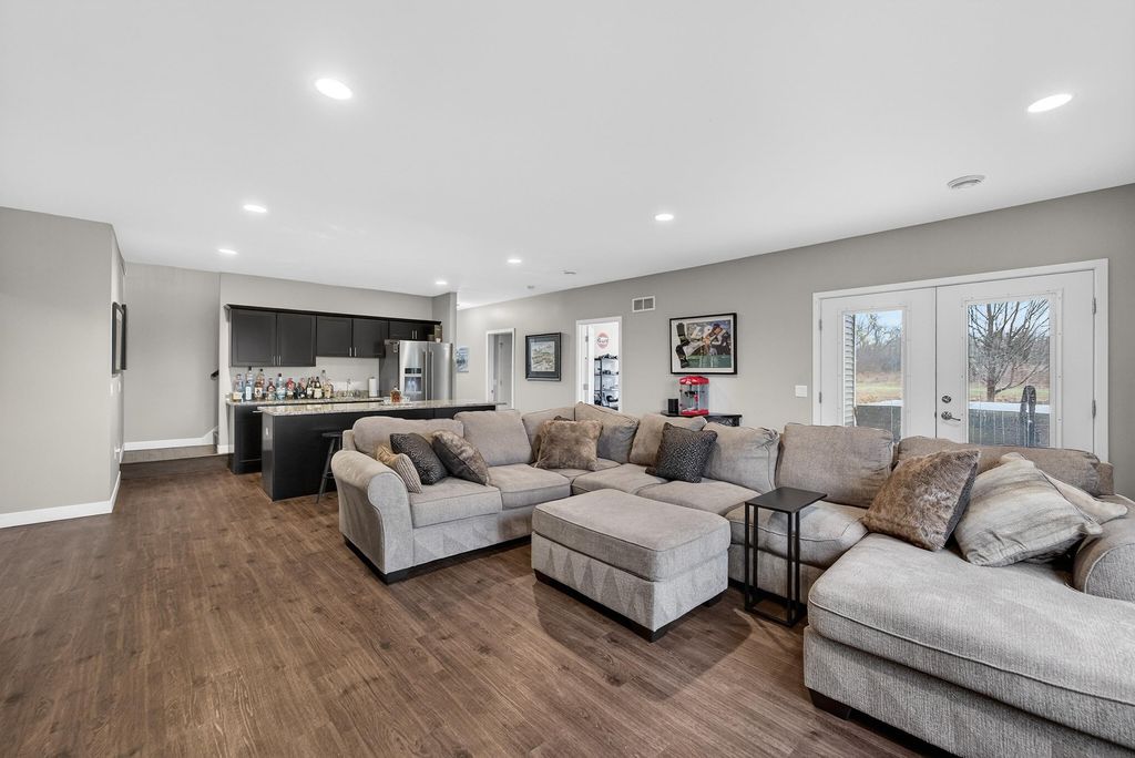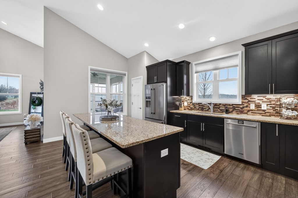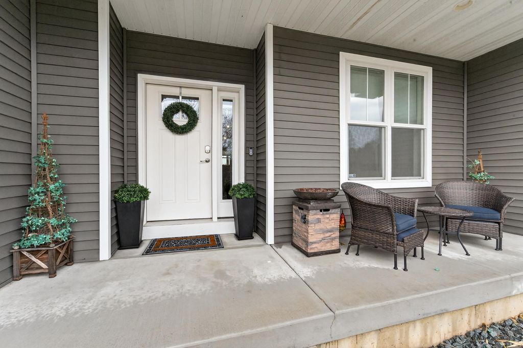 Show 4/15. Stunning ranch on 2.59 acres directly across from the Stoughton Country Club golf course! This 4-bedroom, 3-bath home offers over 3,300 sqft with an open-concept layout and 9' ceilings throughout. The main level features a bright living room with vaulted ceilings, a spacious kitchen with granite countertops, tile backsplash, and stainless steel appliances, plus a spacious primary suite with tray ceilings, dual vanity, walk-in shower, and large closet. The exposed walkout lower level is perfect for entertaining with a family room, gas fireplace, wet bar, additional bedrooms, and full bath. Enjoy outdoor living with a three-season porch, patio with hot tub, firepit area, and expansive yard. Additional highlights include a mudroom with main floor laundry and yard sprinkler system. Ample garage and driveway space includes an attached 2-car garage and a detached extra-deep 2-car garage with a dedicated workspace. Option to purchase fully furnished for a true turn-key opportunity!