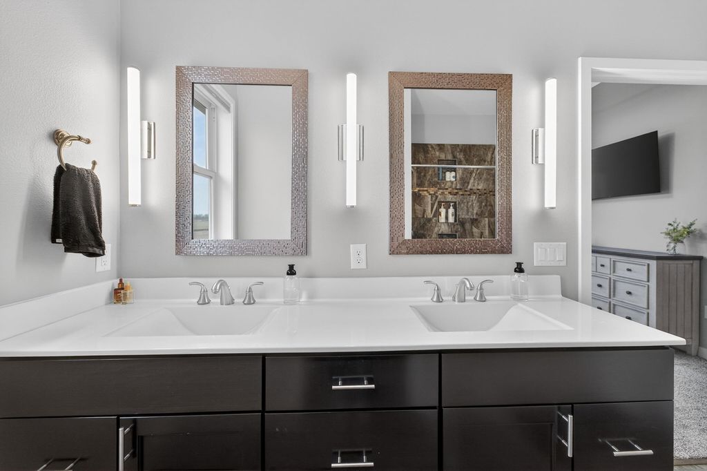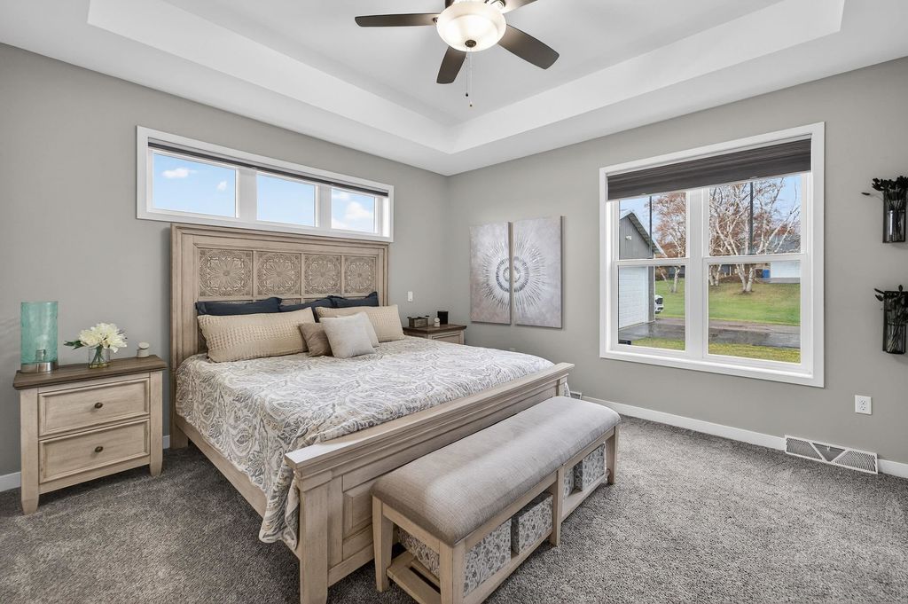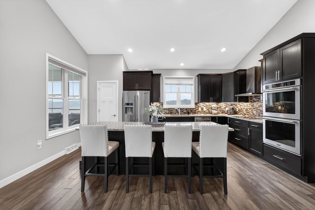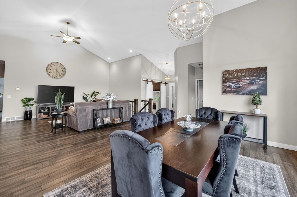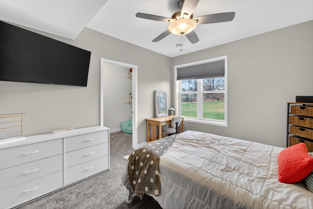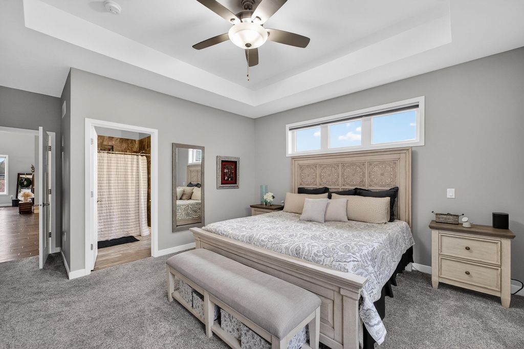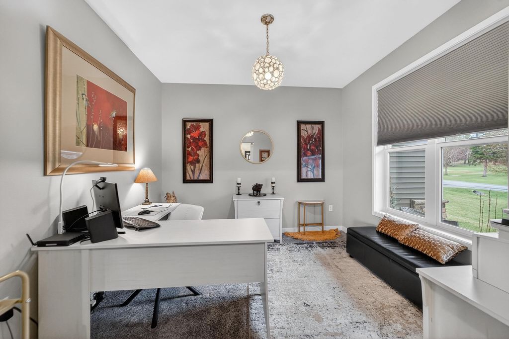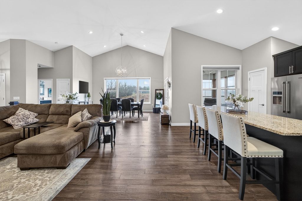 Show 4/15. Stunning ranch on 2.59 acres directly across from the Stoughton Country Club golf course! This 4-bedroom, 3-bath home offers over 3,300 sqft with an open-concept layout and 9' ceilings throughout. The main level features a bright living room with vaulted ceilings, a spacious kitchen with granite countertops, tile backsplash, and stainless steel appliances, plus a spacious primary suite with tray ceilings, dual vanity, walk-in shower, and large closet. The exposed walkout lower level is perfect for entertaining with a family room, gas fireplace, wet bar, additional bedrooms, and full bath. Enjoy outdoor living with a three-season porch, patio with hot tub, firepit area, and expansive yard. Additional highlights include a mudroom with main floor laundry and yard sprinkler system. Ample garage and driveway space includes an attached 2-car garage and a detached extra-deep 2-car garage with a dedicated workspace. Option to purchase fully furnished for a true turn-key opportunity!