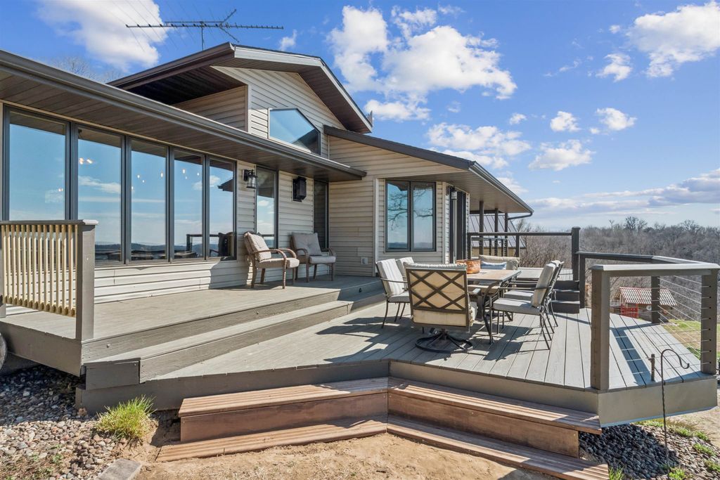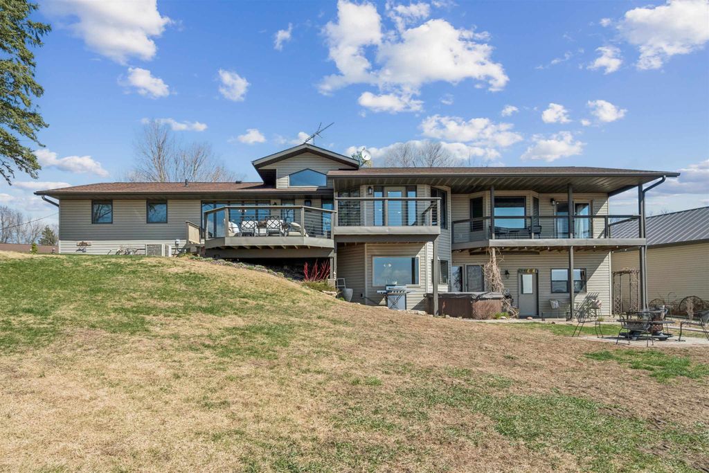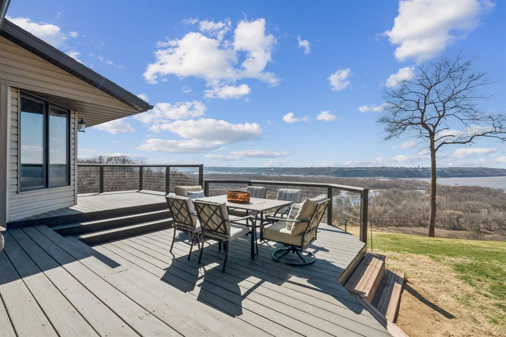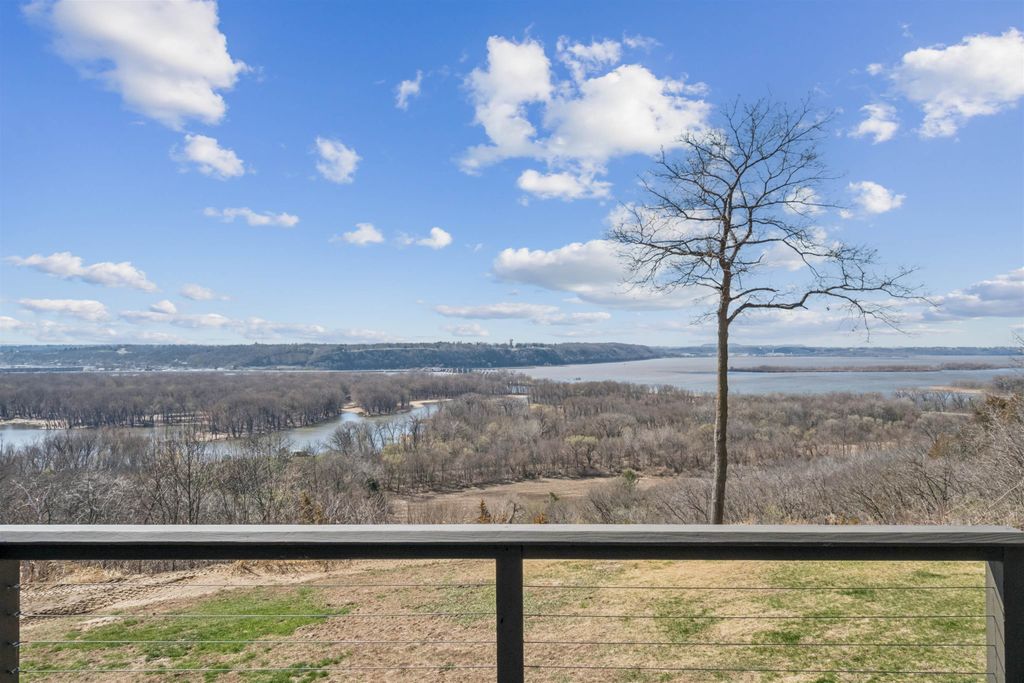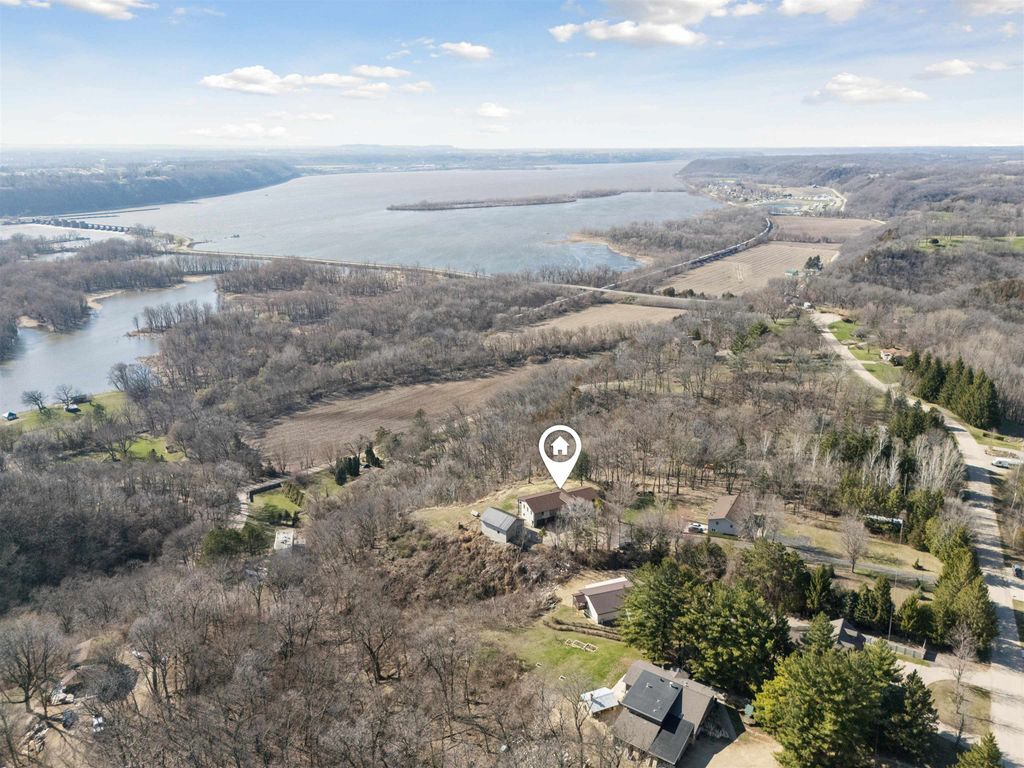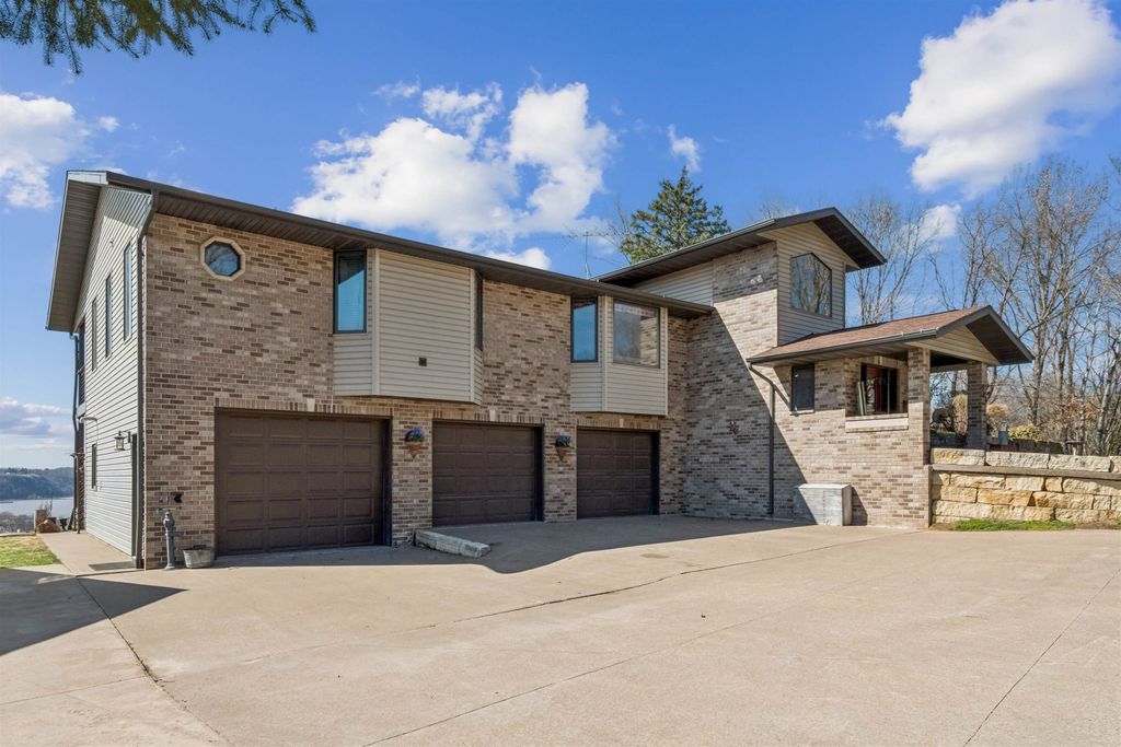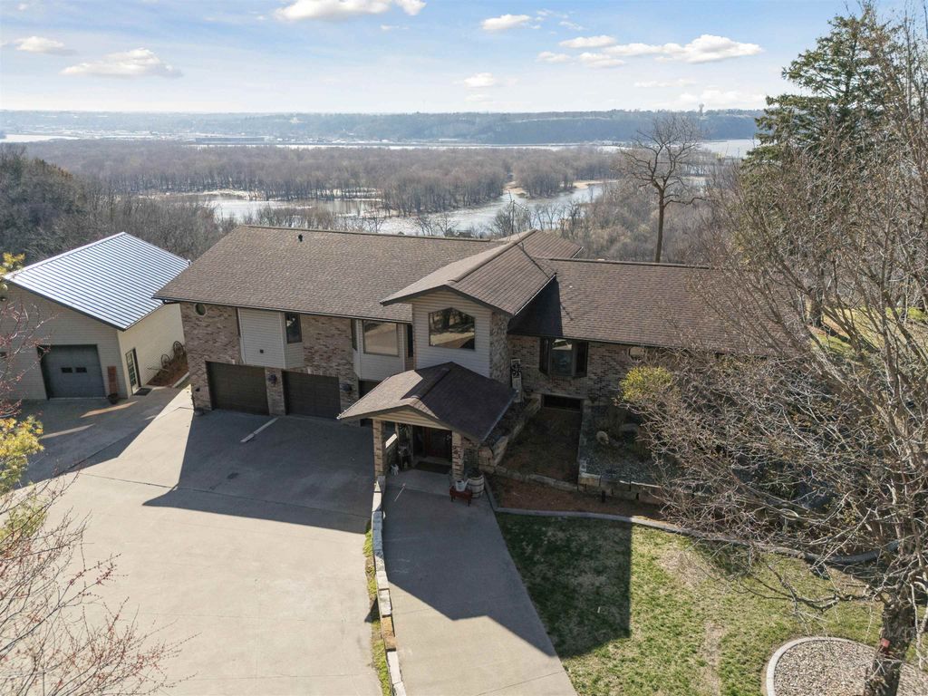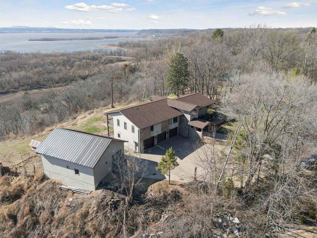 Perched above the Mississippi River in Hazel Green WI, this exceptional residence captures panoramic views from nearly every room, offering a truly elevated living experience just minutes from Dubuque. The main level features an open-concept design with expansive windows, three bedrooms, and two baths, seamlessly connecting to a private deck overlooking the river where the views continue to impress. The lower level is equally impressive, complete with a full second kitchen, additional bedroom, bath, and generous living space, ideal for guests or multi-generational living. A 3-car attached garage and detached heated shop provide both convenience and versatility. Blending refined comfort with breathtaking natural beauty, this is a rare opportunity to own one of the area's most captivating view properties.