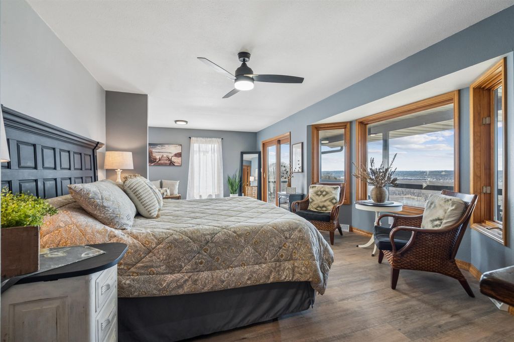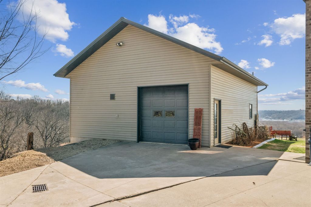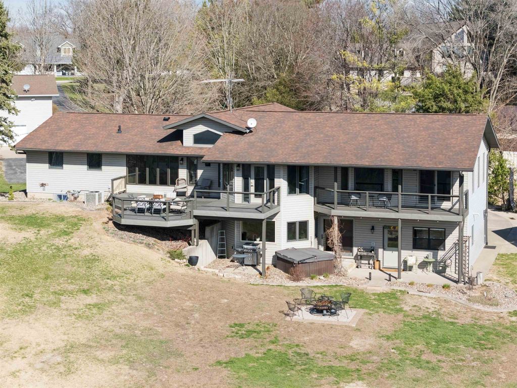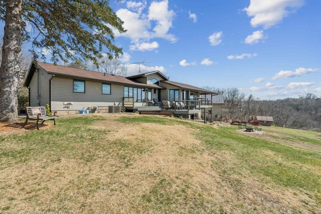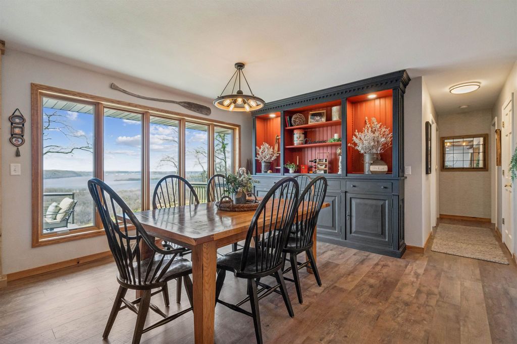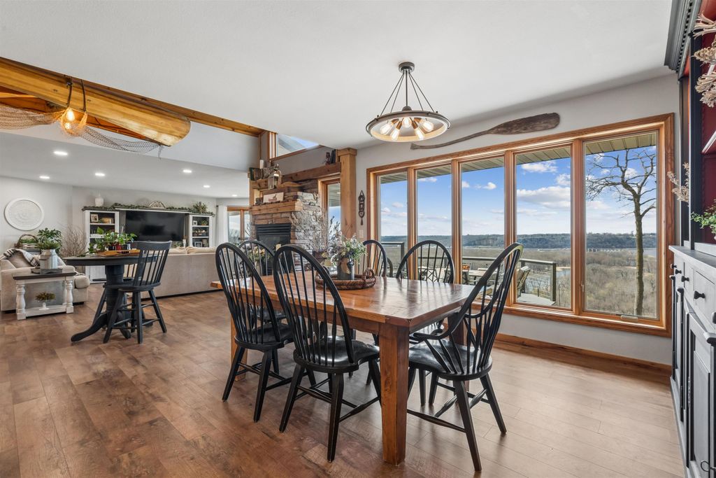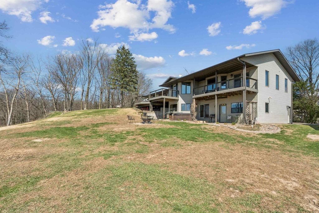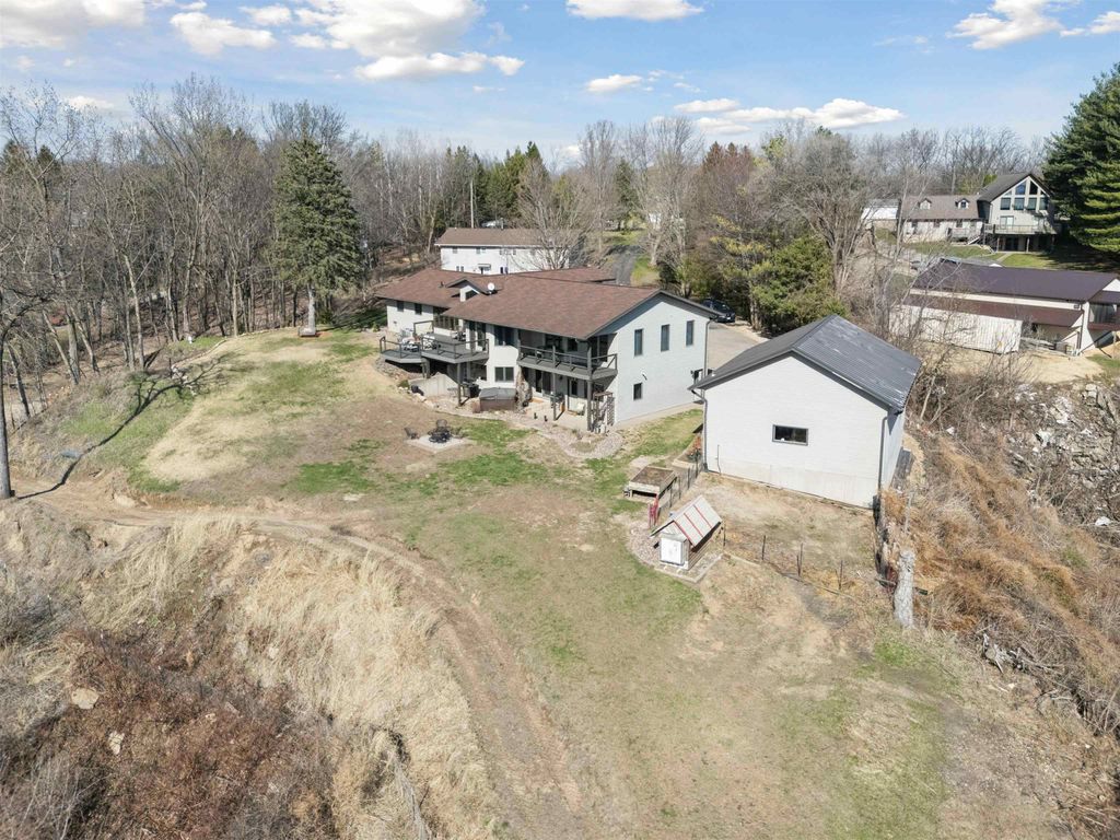 Perched above the Mississippi River in Hazel Green WI, this exceptional residence captures panoramic views from nearly every room, offering a truly elevated living experience just minutes from Dubuque. The main level features an open-concept design with expansive windows, three bedrooms, and two baths, seamlessly connecting to a private deck overlooking the river where the views continue to impress. The lower level is equally impressive, complete with a full second kitchen, additional bedroom, bath, and generous living space, ideal for guests or multi-generational living. A 3-car attached garage and detached heated shop provide both convenience and versatility. Blending refined comfort with breathtaking natural beauty, this is a rare opportunity to own one of the area's most captivating view properties.