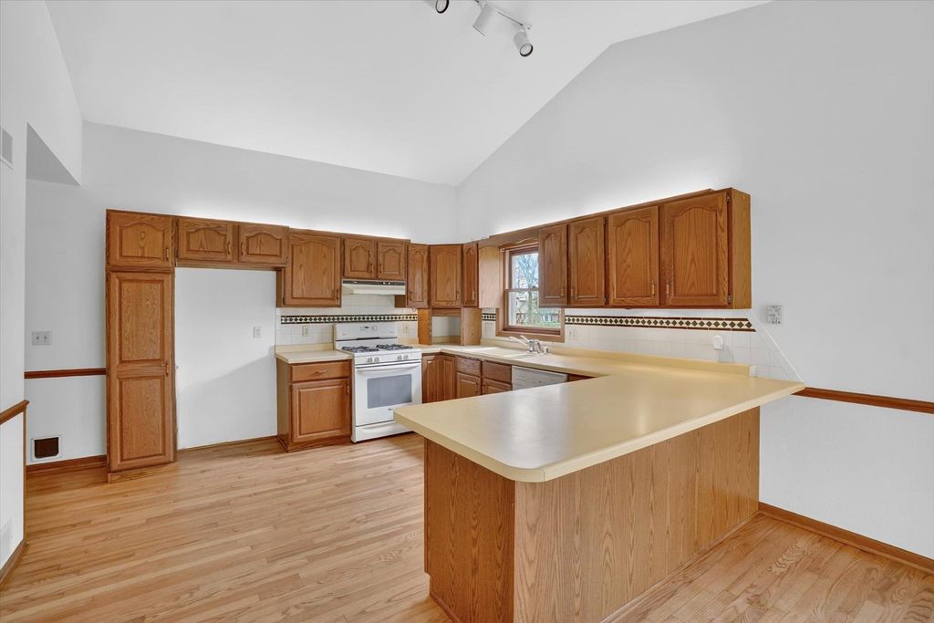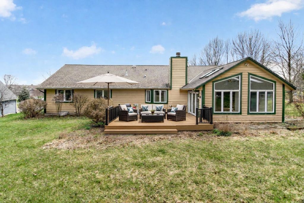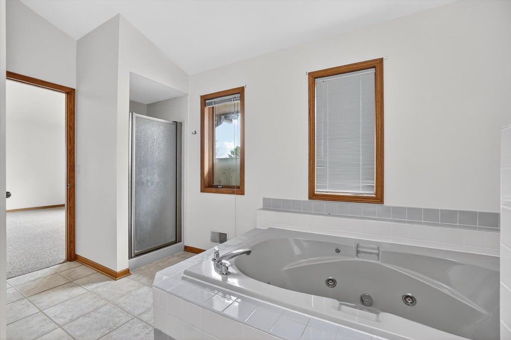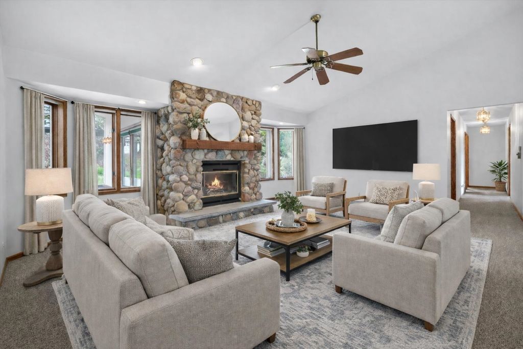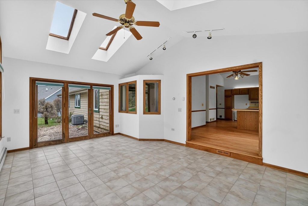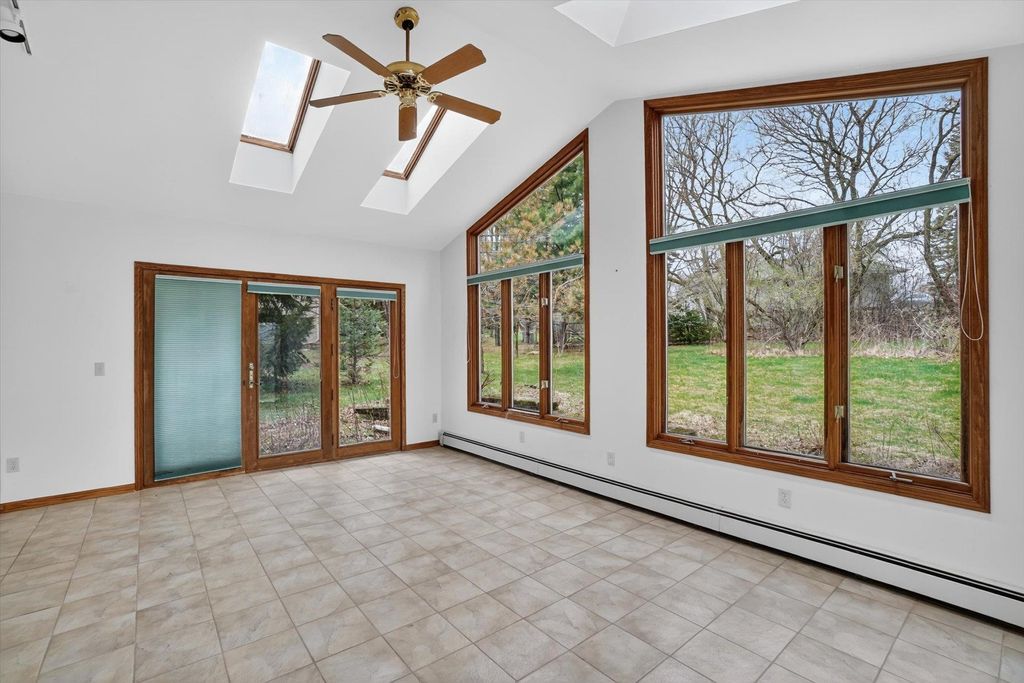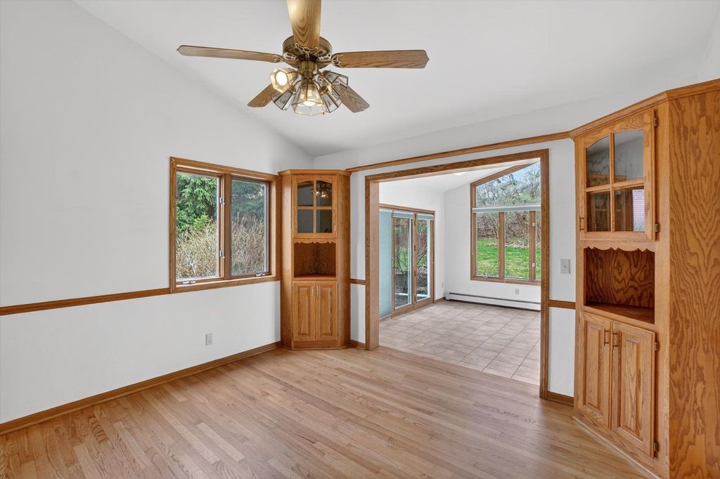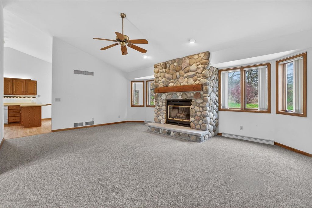 OPEN HOUSE CANCELLED. Is there a 3-bed home in West Bend under $500K that offers main-floor living, nature access, & unique design features? This home's living room features vaulted ceilings & a striking fieldstone gas fireplace, creating a warm, open gathering space. Hardwood floors run through the kitchen & dining areas, adding durability & timeless appeal. ML bedrooms, full bath, & laundry provide convenience for long-term living options. Primary suite showcases a large three-pane window with half-moon accent, plus private entry to a screened-in porch for morning/evening relaxing. It also includes a walk-in closet & ensuite bath with jetted tub & separate shower. A bright sunroom extends living space with backyard access. The partially finished lower level offers room for recreation, hobbies, or storage. Located near the Ice Age Trail, parks, & scenic outdoor spaces, this home combines comfort & character with convenience to some of West Bend's best amenities.