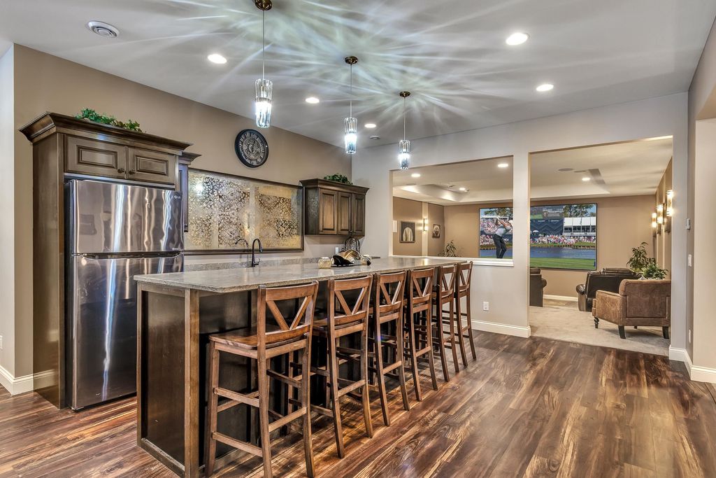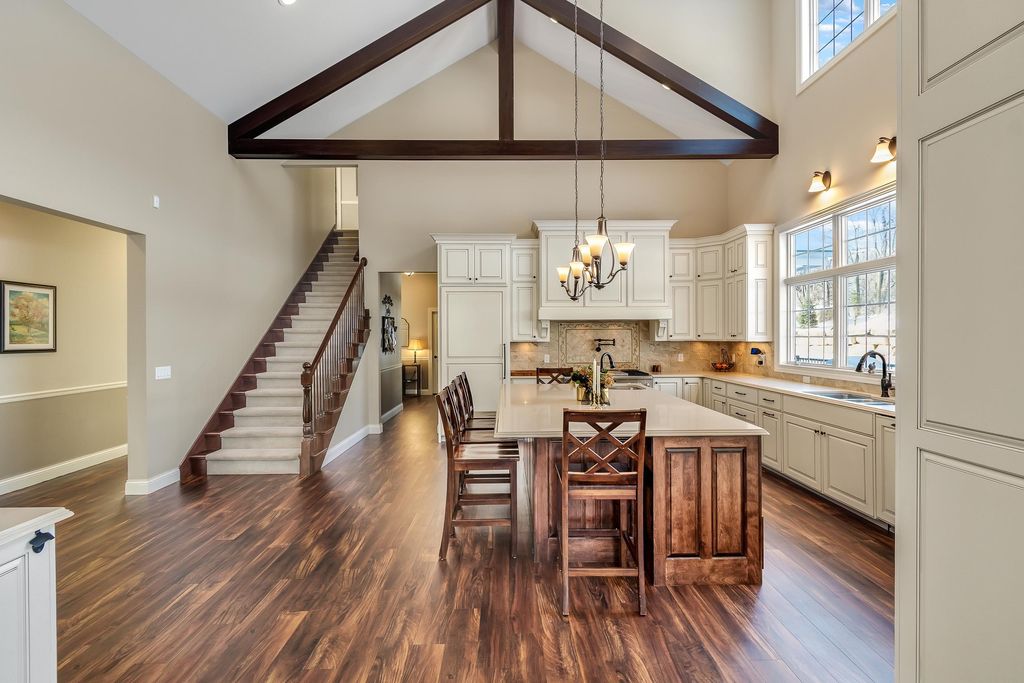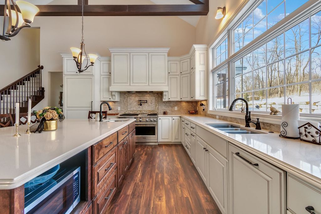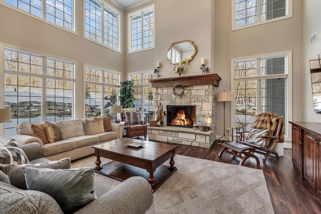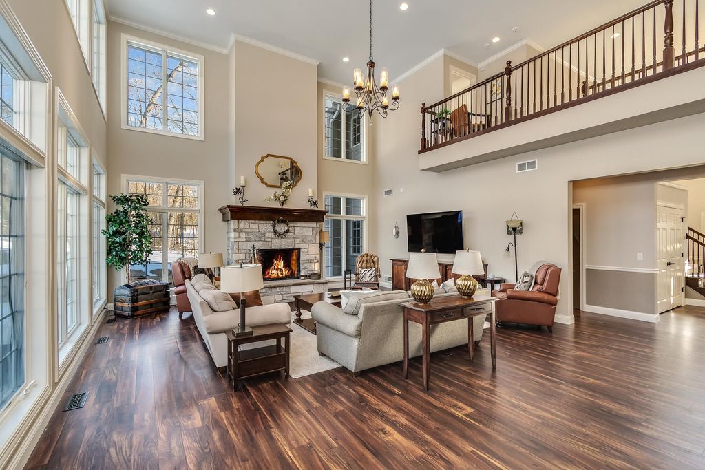 Set on over 2 acres in a peaceful rural cul-de-sac, this grand yet inviting home offers the perfect blend of elegance and everyday comfort. Featuring 5 bedrooms and 4.5 baths, the thoughtfully designed layout includes a stunning 2-story great room, formal dining, and a chef's dream kitchen complete with a separate "dirty kitchen" for added functionality. Main level also offers a private guest suite with full bath, along with a spacious mudroom and laundry. Upstairs, the luxurious primary suite boasts a spa-like bath and expansive walk-in closet, while additional bedrooms are generously sized with convenient second-floor laundry. The finished lower level is an entertainer's dream with a theater room, wet bar and lounge area, office, exercise room, and even a hidden secret room, plus abundant storage. Enjoy serene wooded views from the large screened porch. Complete with a heated 5-car garage with hot water and dog bath. This exceptional home delivers space, privacy, and refined living.