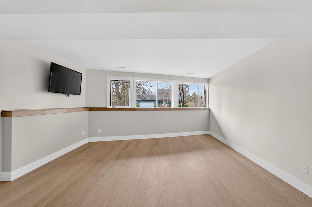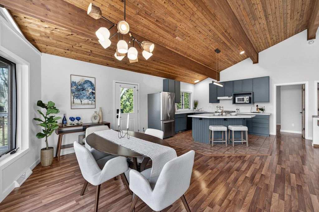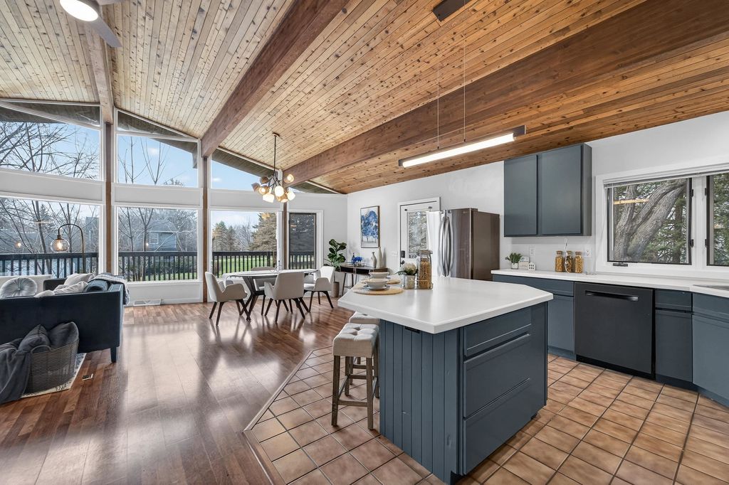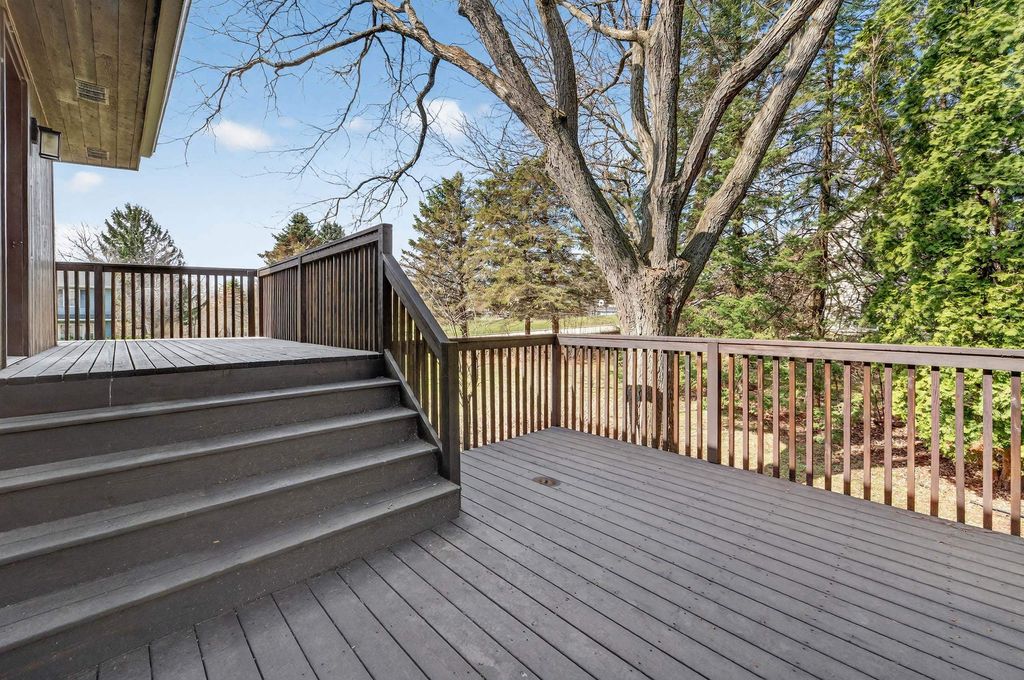 Prepare to be amazed by this stunning contemporary chalet-style home, tucked away serenely in desirable Mount Horeb! This joyfully updated cedar & brick beauty greets you w/ a dramatic, steeply pitched roofline (new in 2026) & a massive wraparound deck. Enter under soaring vaulted ceilings w/ exposed wood beams & rich paneling, providing instantaneous "Wow!" LVP flooring flows throughout the open concept main living area & glistens w/ natural light flooding from the impressive floor-to-ceiling windows. A large brick fireplace anchors the room, providing a sense of warmth & sophistication. The kitchen awaits your culinary creativity while showcasing sleek, slate-blue cabinetry, a generous island w/ breakfast bar & modern SS appliances! The expansive lower level ft. new White Oak flooring & is perfect for entertainment, a home office or additional living space. Conveniently located across from Waltz Park, this unique home offers a mid-century modern vibe w/ modern, thoughtful updates!