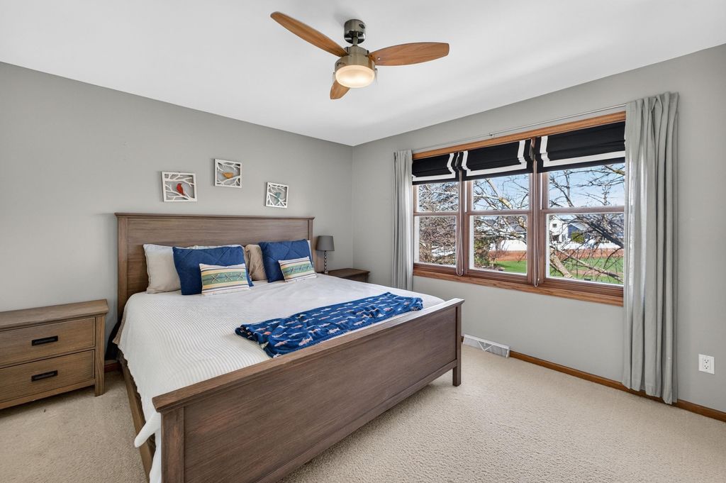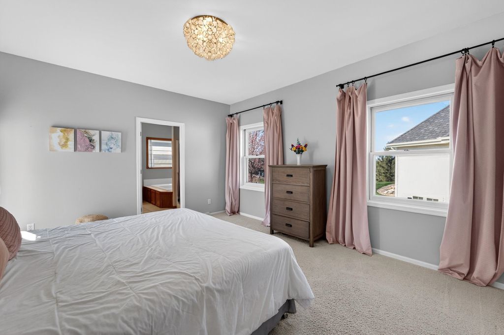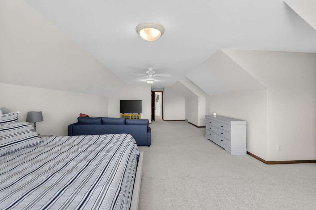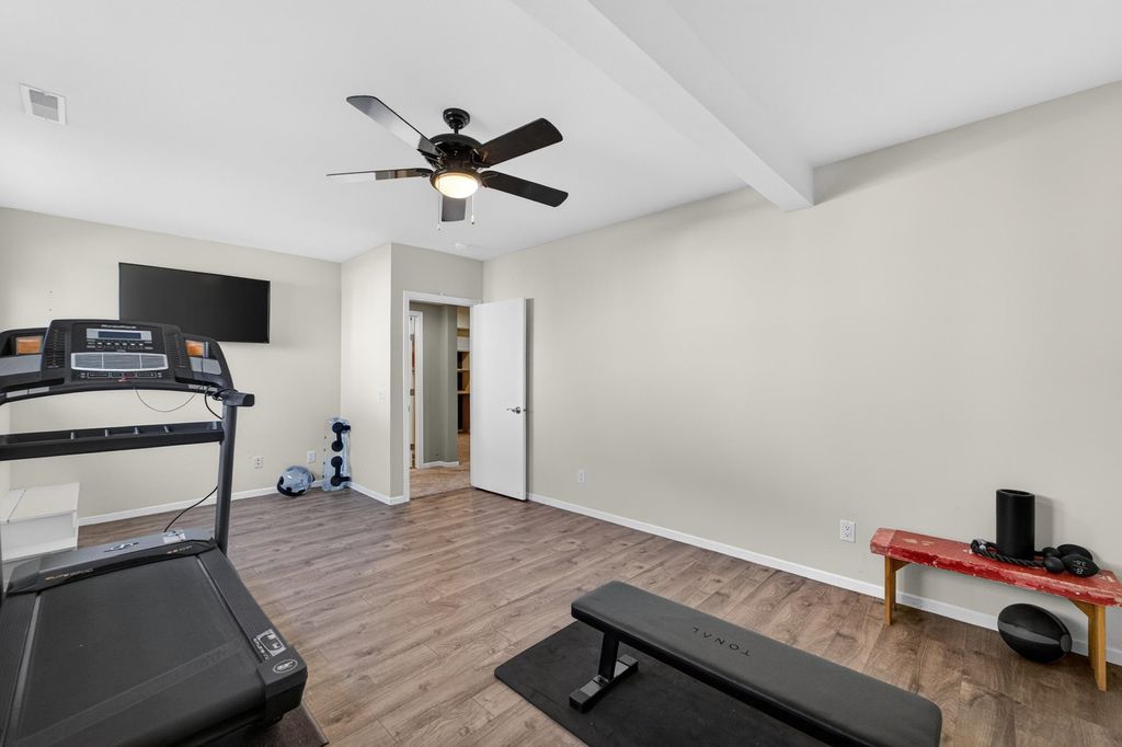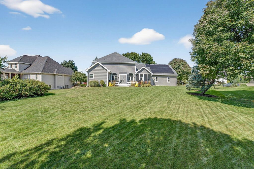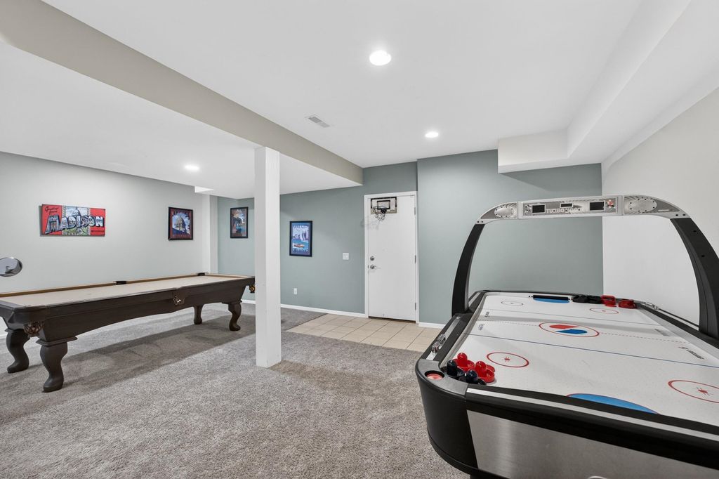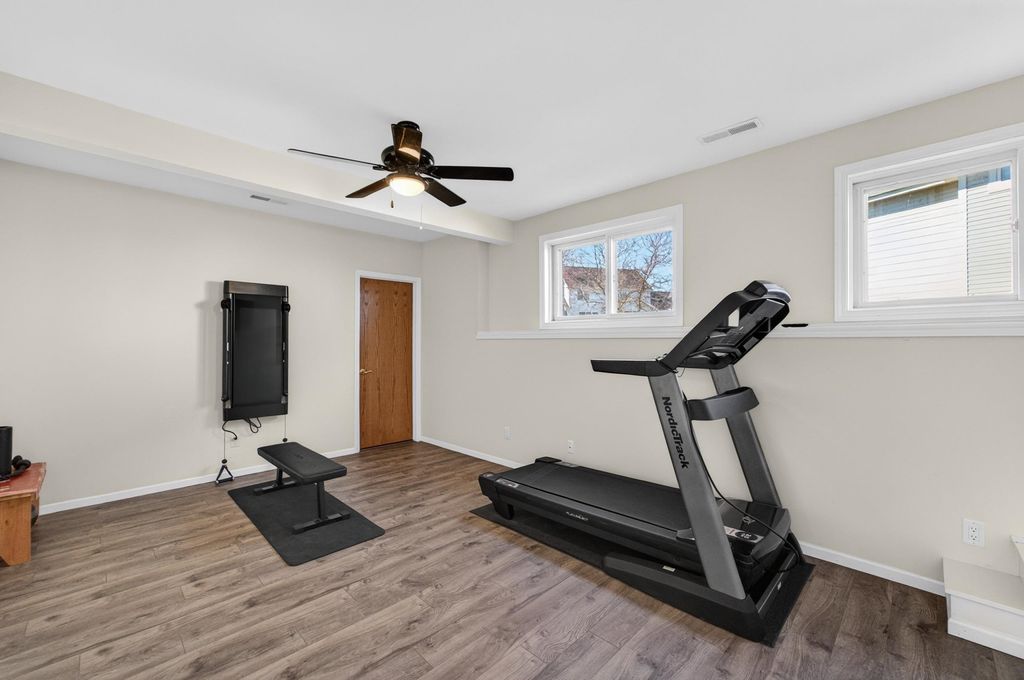 Spacious and inviting home with great living and entertaining spaces! The main level features a bright living room with vaulted ceilings and gas fireplace, formal dining room, and a kitchen with black stainless steel appliances, quartz countertops, and an island with breakfast bar. Two bedrooms on the main level include the owner's suite with walk-in closet and private ensuite with dual sinks, jetted tub, and walk-in shower. The exposed lower level offers a family room, rec room, exercise space, cedar closet, and full bath. Enjoy the screened porch and Trex deck, plus a backyard with basketball hoop, Ring doorbell, and security cameras. Attached 3-car garage with lower-level access.