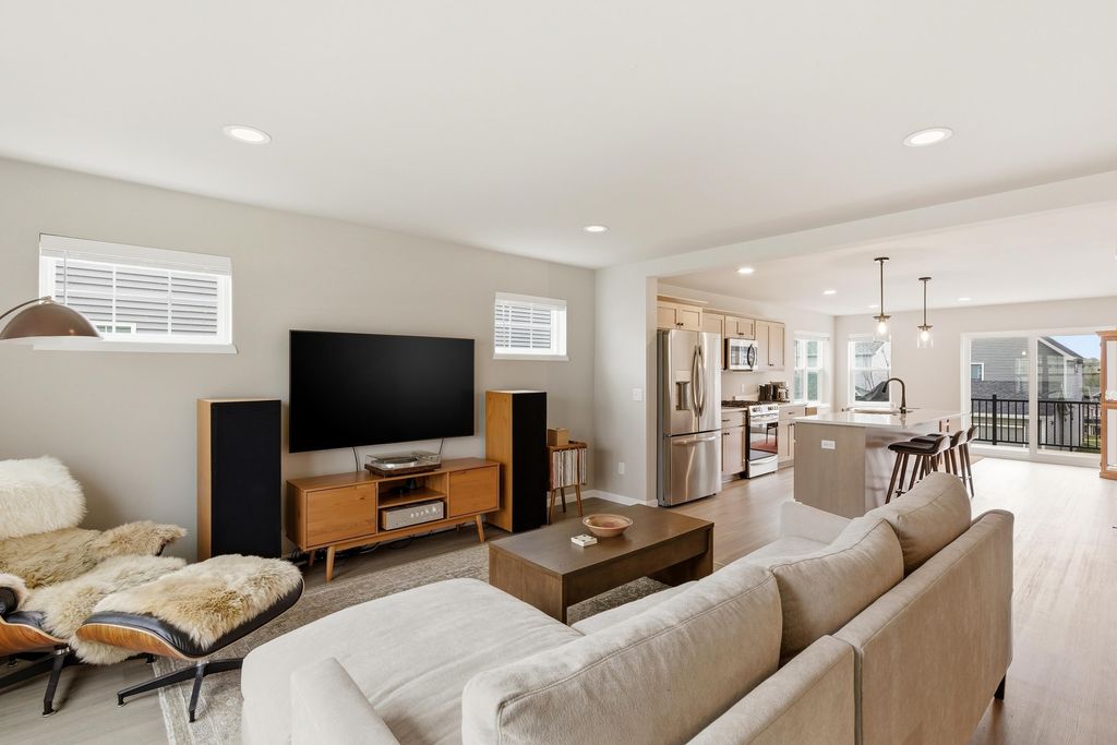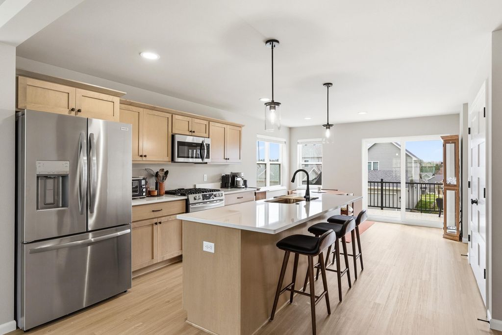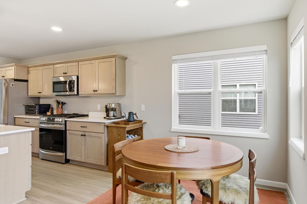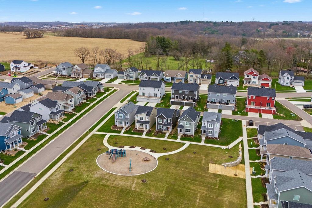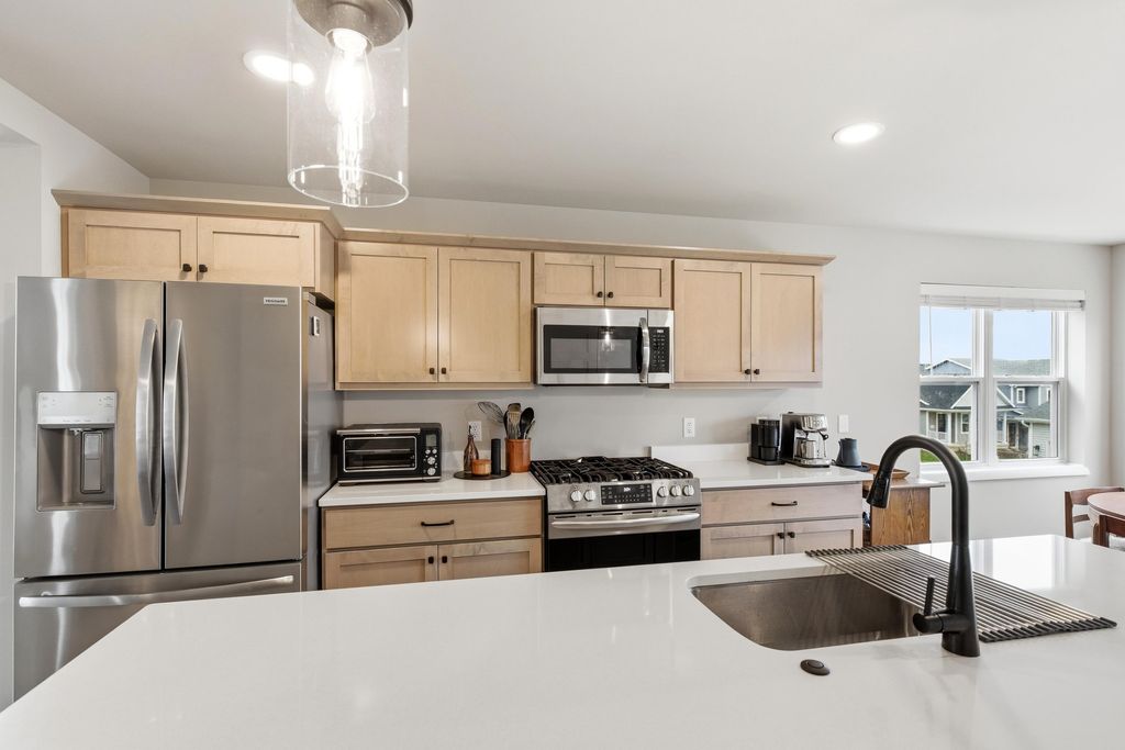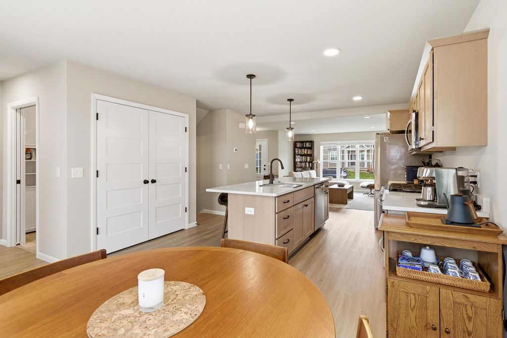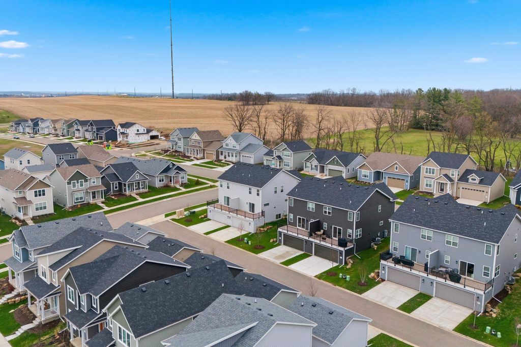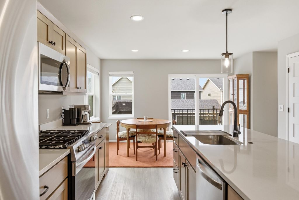 Showings start 4/16. Newly completed construction with a thoughtfully designed open-concept layout offering 3 bedrooms and 2.5 baths. Seller's change of plans creates a rare opportunity to own one of the last remaining twin homes in the neighborhood at a great price! The main level features a bright kitchen with center island, quartz countertops, custom locally crafted cabinetry, and seamless flow into dining and living spaces. Main-level laundry and half bath add everyday ease. All bedrooms are upstairs, including a spacious primary suite with walk-in closet and private bath, plus two additional bedrooms and full bath. The unfinished lower level is stubbed for a future bath and offers great potential for added living space. Enjoy a maintenance-free deck, smart home lighting, and a 2-car garage. Kitchen is equipped for both gas and electric range options. Near parks, bus line, and west side amenities. Builder warranty transfers.