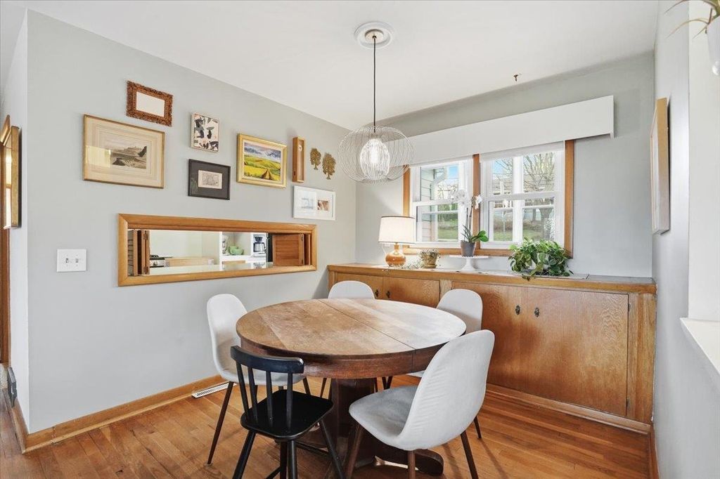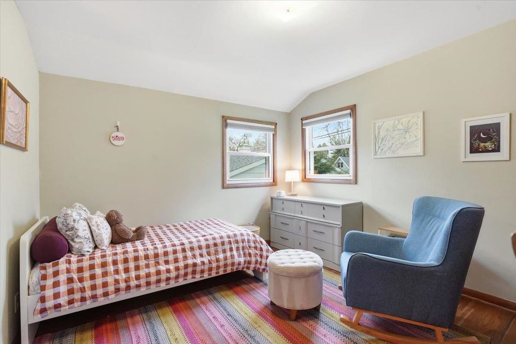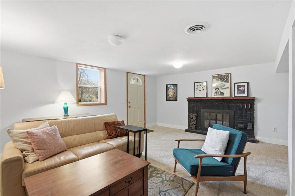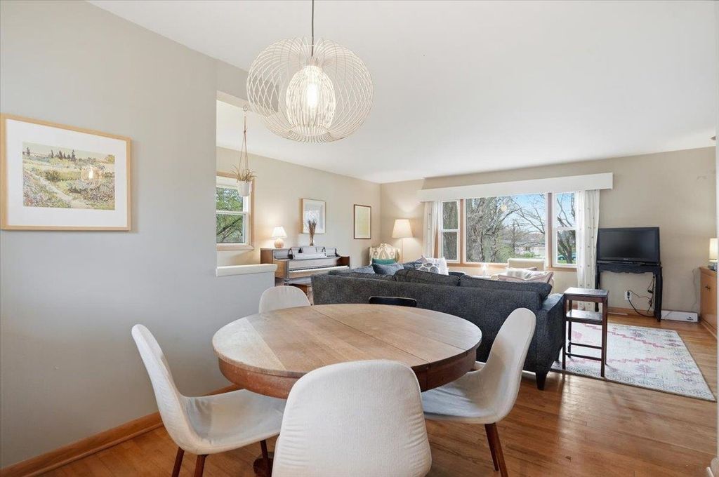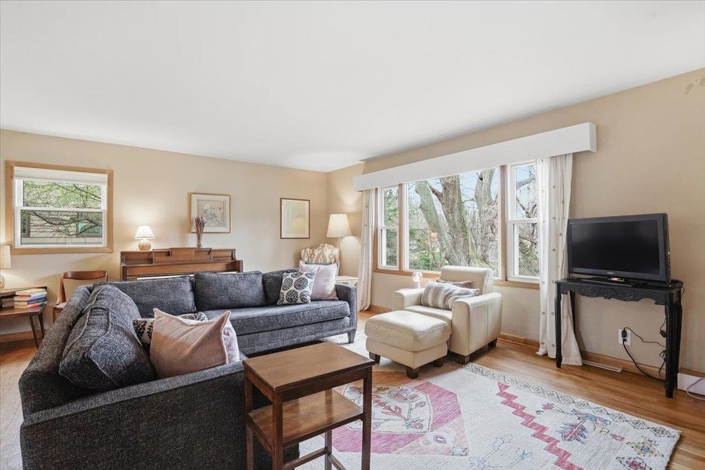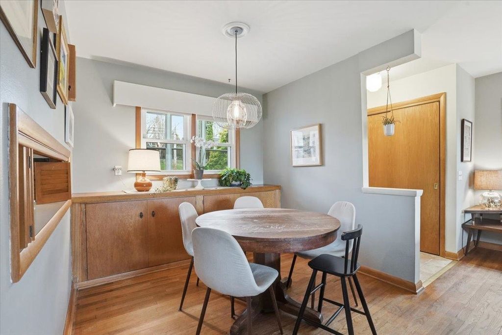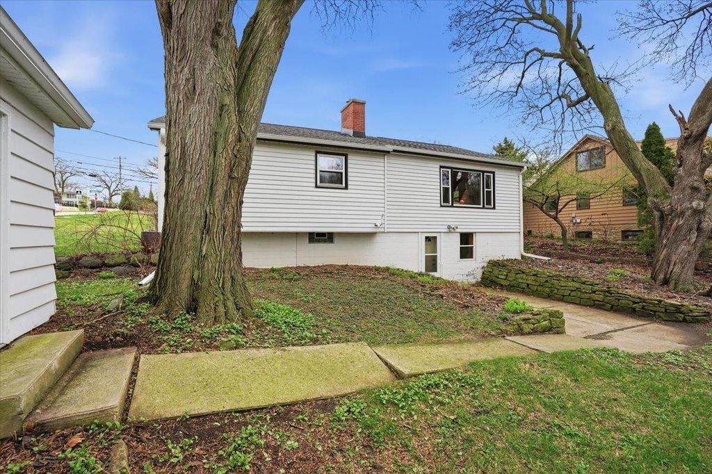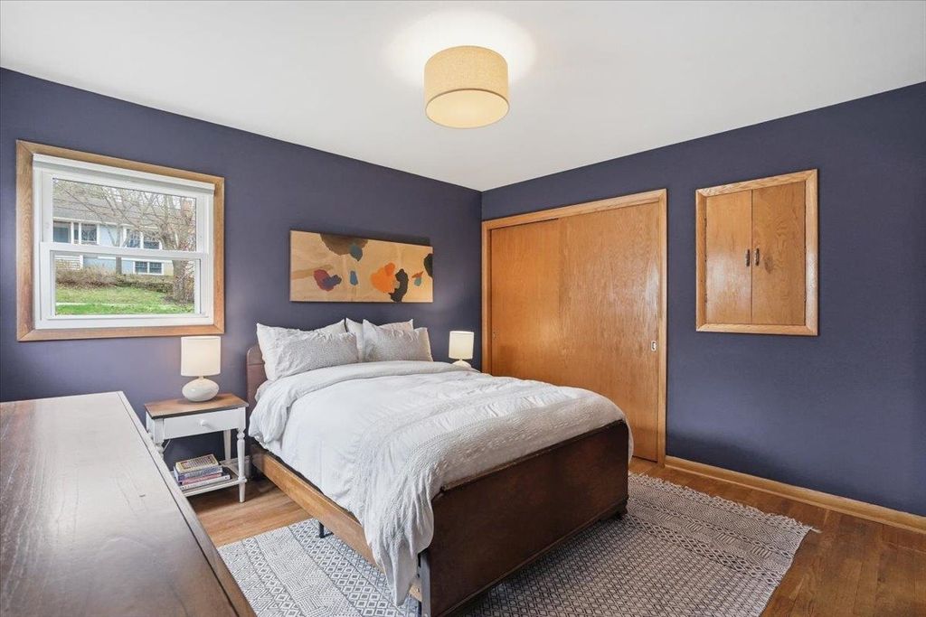 This mid-century modern has the kind of warmth and personality that instantly makes a home feel memorable. From the pink front door to the original woodwork inside, it strikes that balance of preserved character and practical updates in a way that feels hard to find. Built-ins, hardwood floors, pass-through shutters, and a standout fireplace give the main level its charm, while the kitchen brings in quartz counters, new appliances, and an open flow that works well for everyday living. Picture windows fill the home with light and overlook the backyard, the updated bath adds a fresh touch, and the finished walkout lower level gives you valuable extra space. Step outside and you'll find one of the more oversized yards in the area (almost 1/2 acres), with room to garden, plant fruit trees, keep chickens, or simply enjoy the park-like backdrop. The location is just as appealing, set directly on the Lake Loop Bike Path and near Lake Monona, Meat People, The Musky Lounge, and Crema Cafe.