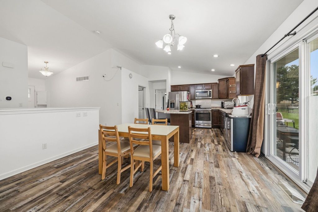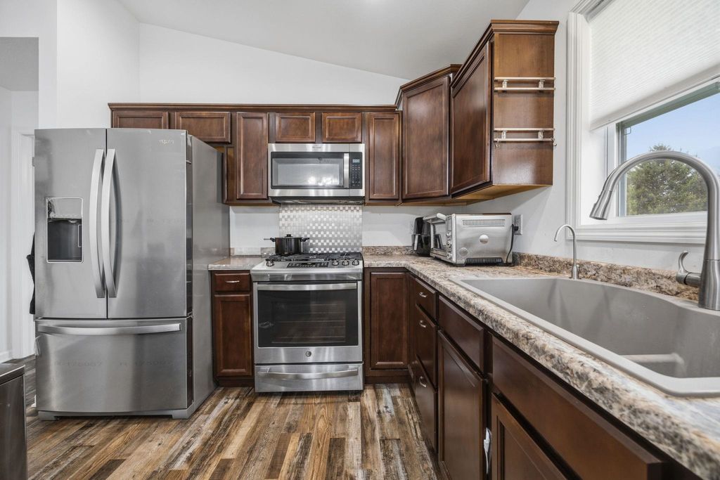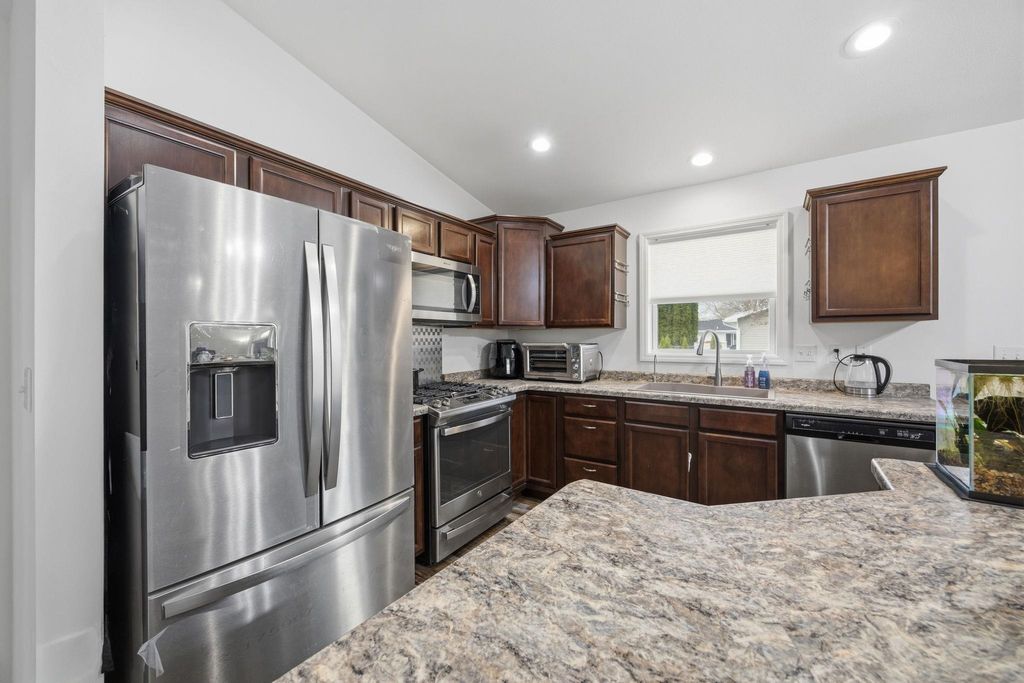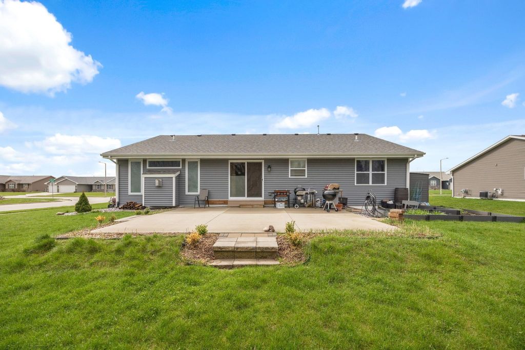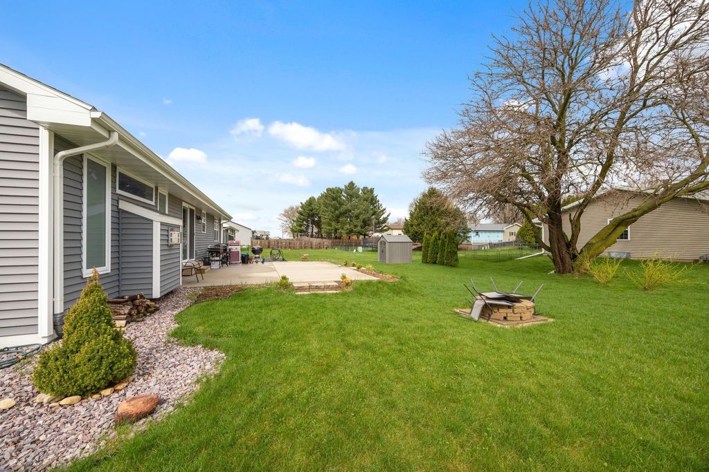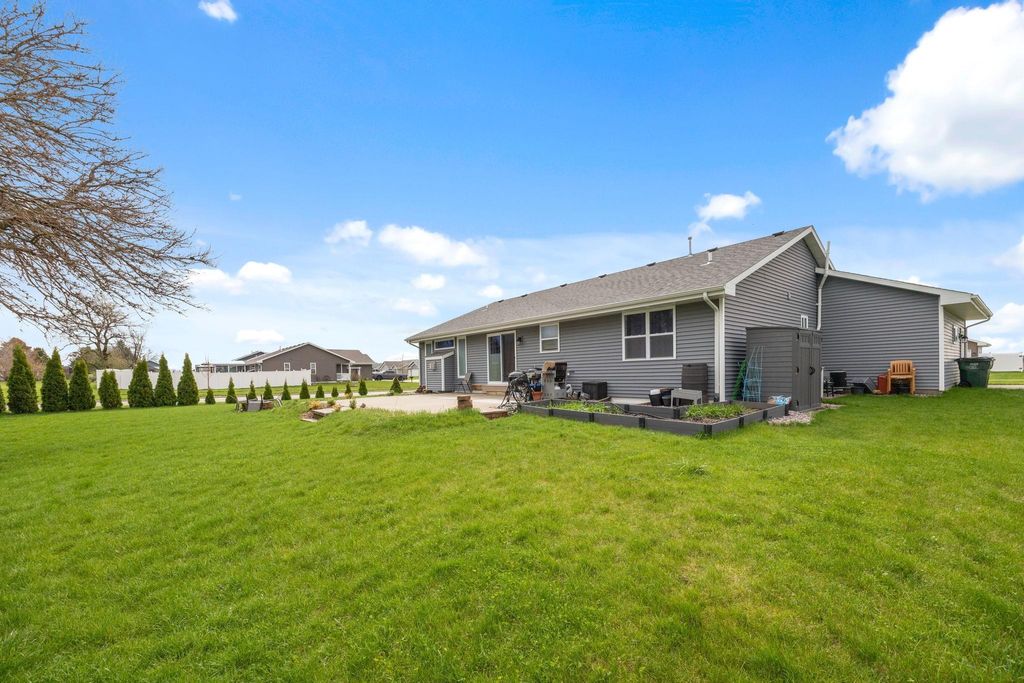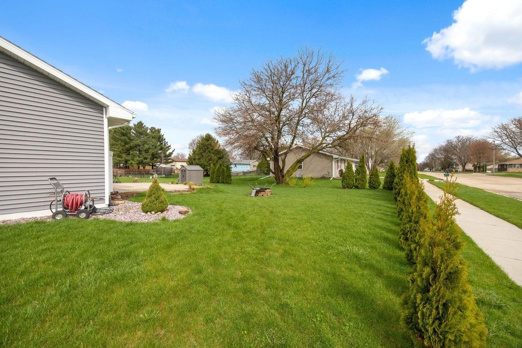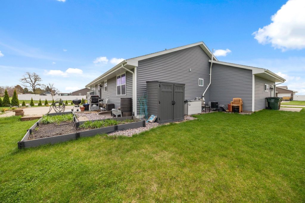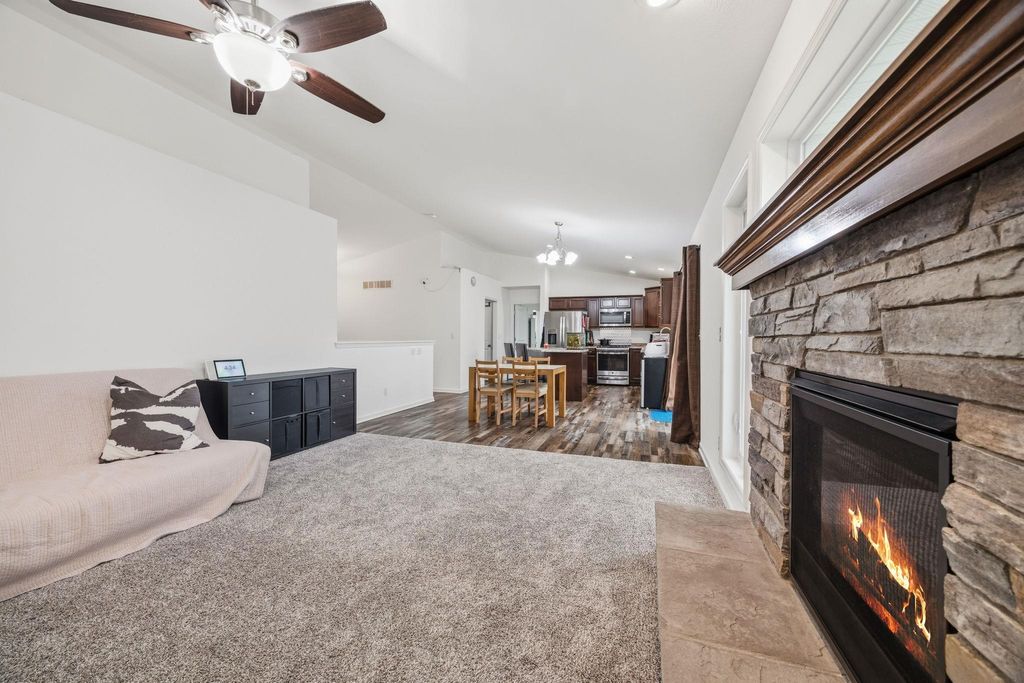 Bright, open-concept 4-bedroom, 3-bath home in desirable Red Hawk Farms on a spacious corner lot. Offering 2,480 sq ft of finished living space, this split bedroom home features vaulted ceilings, a cozy gas fireplace, and a beautifully finished basement. The kitchen includes stainless steel appliances, a breakfast bar, and ample space for entertaining. Enjoy modern conveniences with a smart thermostat, smart doorbell, smart light switches, and reverse osmosis water filtration system. The attached 3-car garage provides plenty of storage. Step outside to a nicely landscaped yard with beautiful curb appeal. The backyard is complete with a patio, large storage shed, rain barrel, drip irrigation system, garden space, and fire pit"”perfect for relaxing or hosting guests. Conveniently located near parks, schools, shopping, and more, this move-in ready home offers comfort, style, and functionality in one of the area's most sought-after neighborhoods.