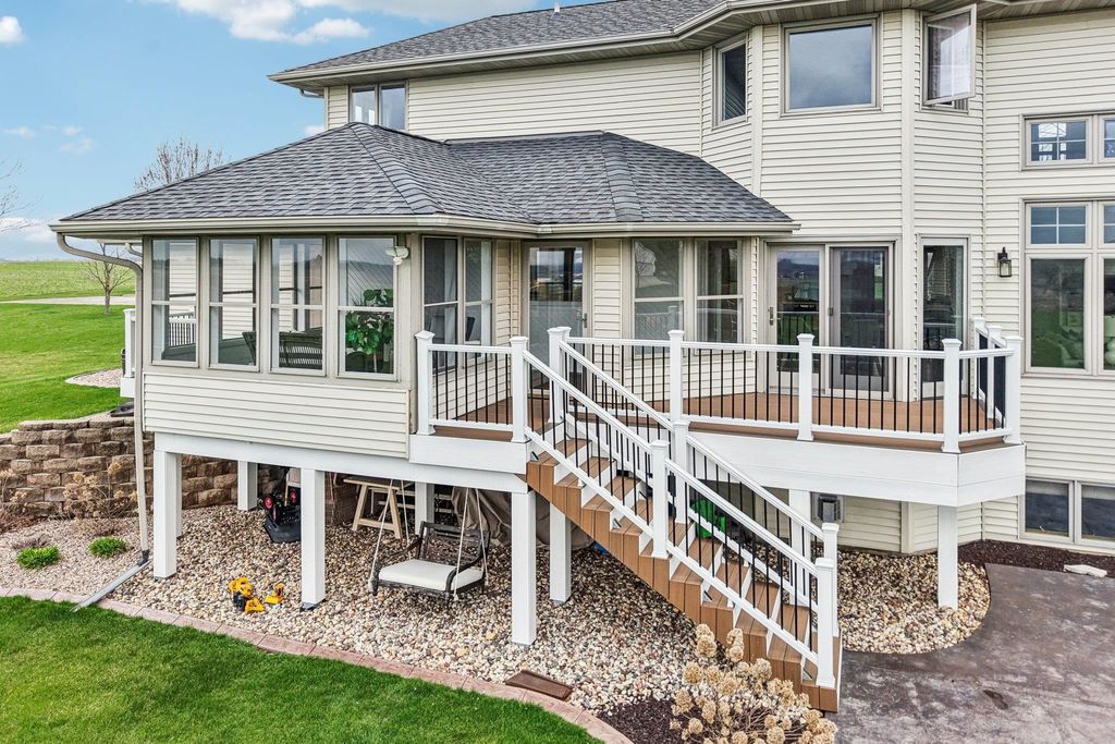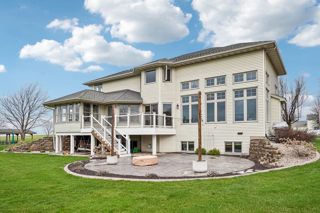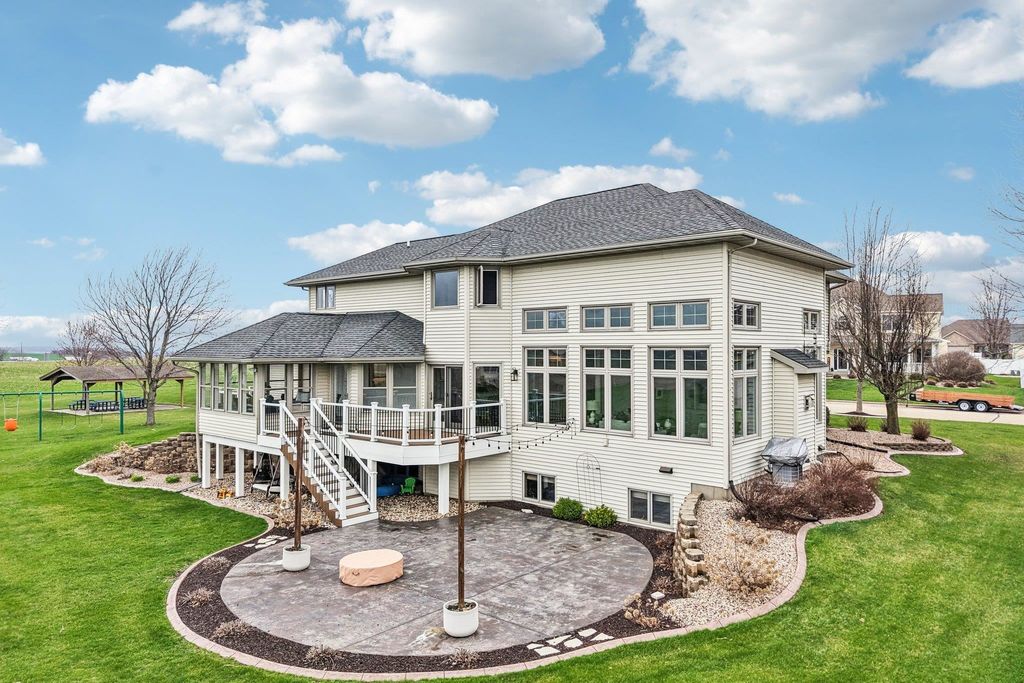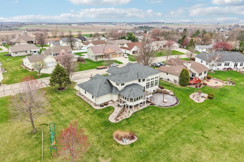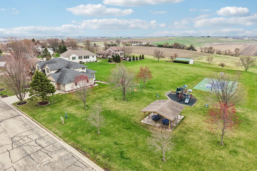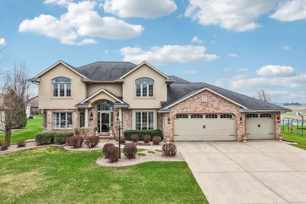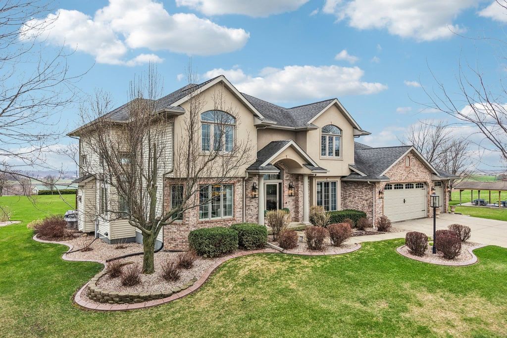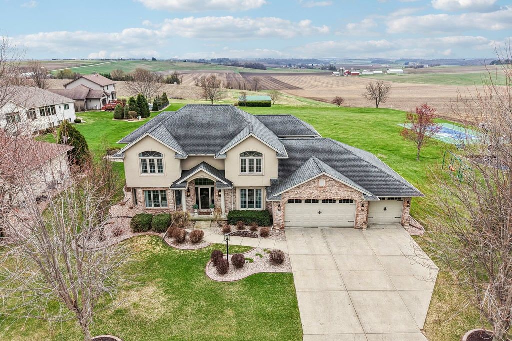 Showings start 4/24. Stunning 2-story next to quiet neighborhood park with breathtaking southern views of rolling hills! Vaulted great room with floor-to-ceiling custom fireplace, refinished hardwood floors & freshly painted throughout. Gorgeous sunroom. Completely updated designer kitchen shines with white cabinetry, quartz countertops, stainless appliances, large island/breakfast bar & chef's pantry. Main floor office with custom built-in desk/office cabinetry. Main floor laundry. Updated bathrooms. Upstairs has 3 spacious bedrooms & primary suite with walk-in closet, jetted tub, glass block double shower & in-floor heating/cooling. Exposed lower level has a 4th bedroom, full bath, family room w/custom fireplace, built-in entertainment center & kitchenette. Newer HVAC & water heater, zoned heating/cooling. 3+ car garage w/basement access & epoxy floors. Enjoy outdoor living with new Trex deck, stamped concrete patio, gas fire pit, and fresh landscaping. A must-see!