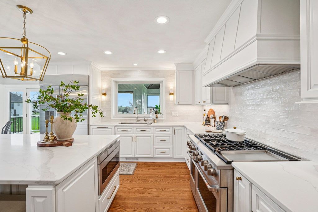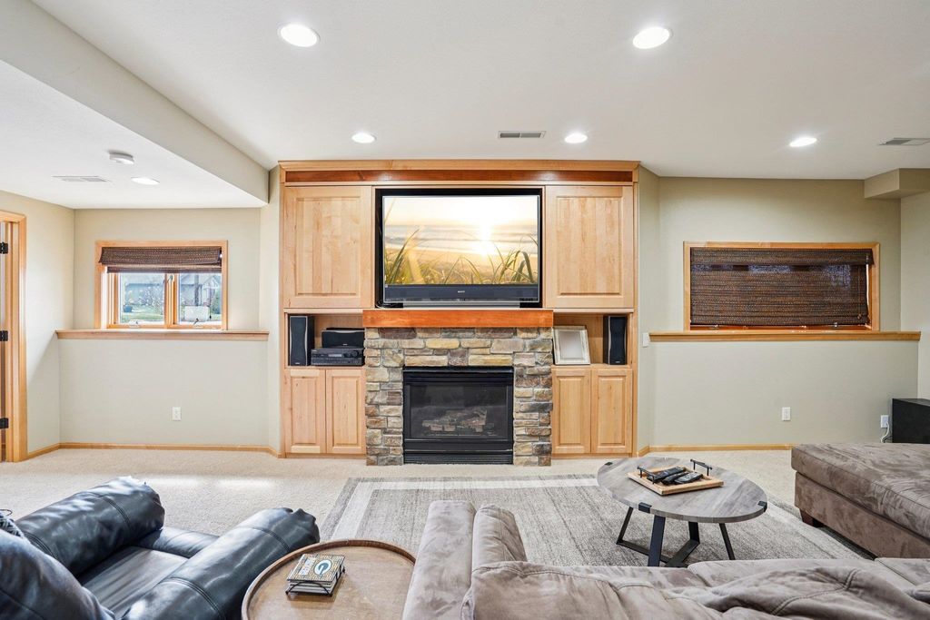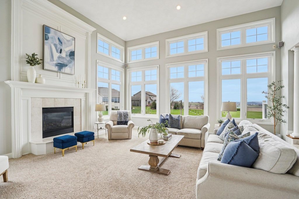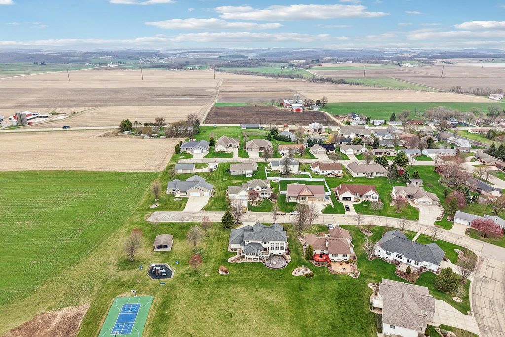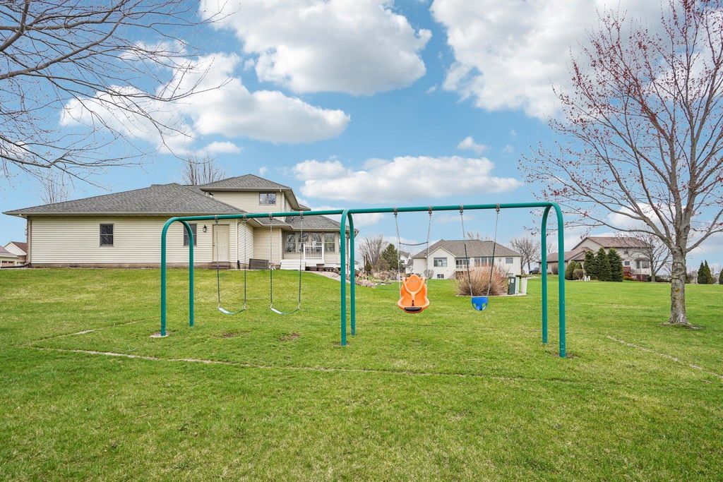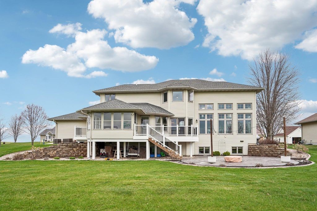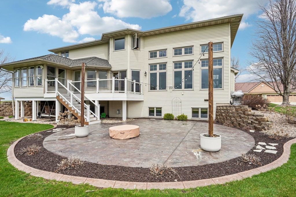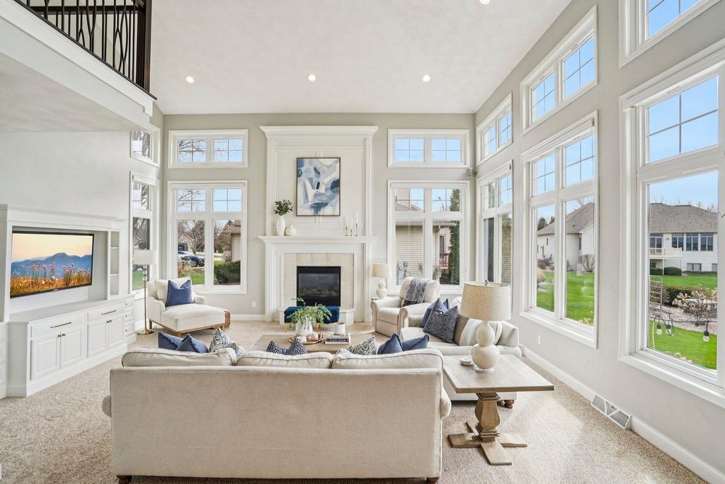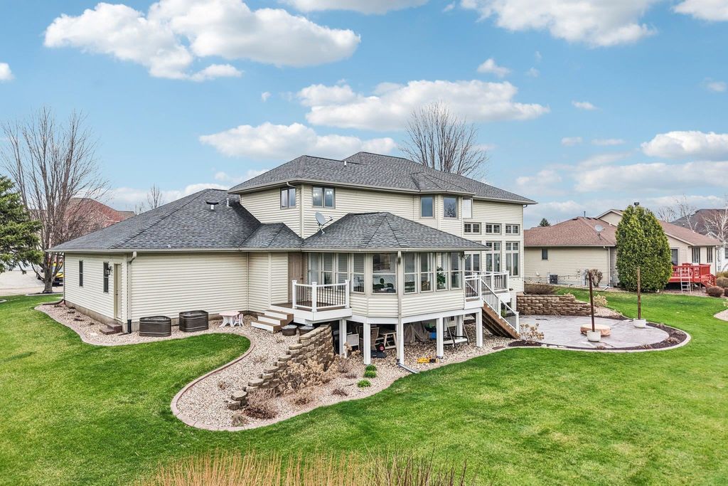 Showings start 4/24. Stunning 2-story next to quiet neighborhood park with breathtaking southern views of rolling hills! Vaulted great room with floor-to-ceiling custom fireplace, refinished hardwood floors & freshly painted throughout. Gorgeous sunroom. Completely updated designer kitchen shines with white cabinetry, quartz countertops, stainless appliances, large island/breakfast bar & chef's pantry. Main floor office with custom built-in desk/office cabinetry. Main floor laundry. Updated bathrooms. Upstairs has 3 spacious bedrooms & primary suite with walk-in closet, jetted tub, glass block double shower & in-floor heating/cooling. Exposed lower level has a 4th bedroom, full bath, family room w/custom fireplace, built-in entertainment center & kitchenette. Newer HVAC & water heater, zoned heating/cooling. 3+ car garage w/basement access & epoxy floors. Enjoy outdoor living with new Trex deck, stamped concrete patio, gas fire pit, and fresh landscaping. A must-see!